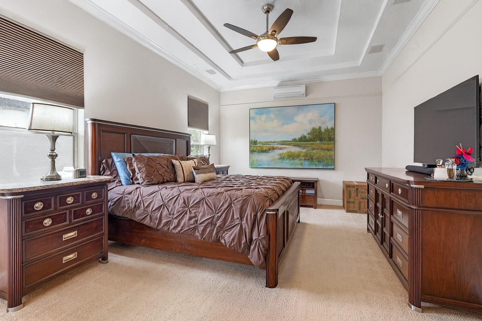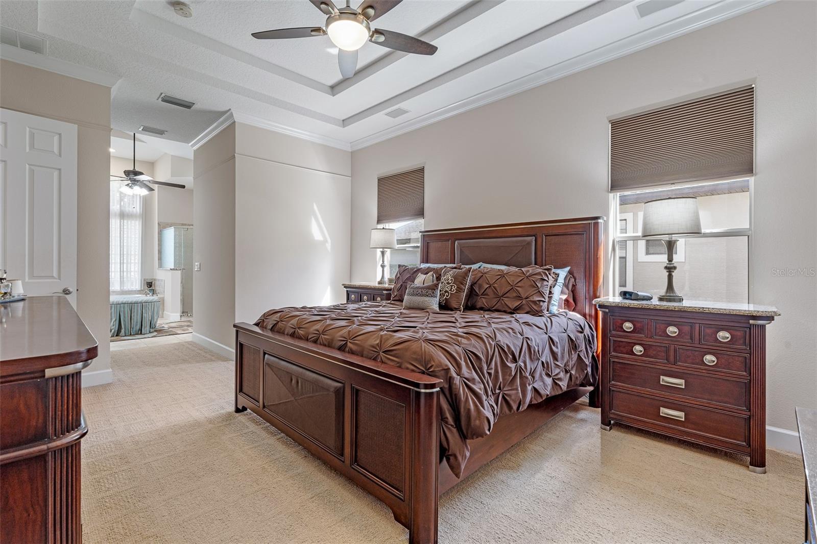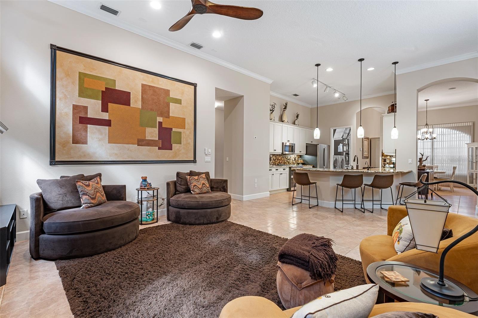 - Built-in Features, Ceiling Fans(s), Crown Molding, Eat-in Kitchen, High Ceilings, Kitchen/Family Room Combo, Living Room/Dining Room Combo, Open Floorplan, Primary Bedroom Main Floor, Solid Surface Counters, Solid Wood Cabinets, Split Bedroom, Stone Counters, Thermostat, Tray Ceiling(s), Walk-In Closet(s), Window Treatments