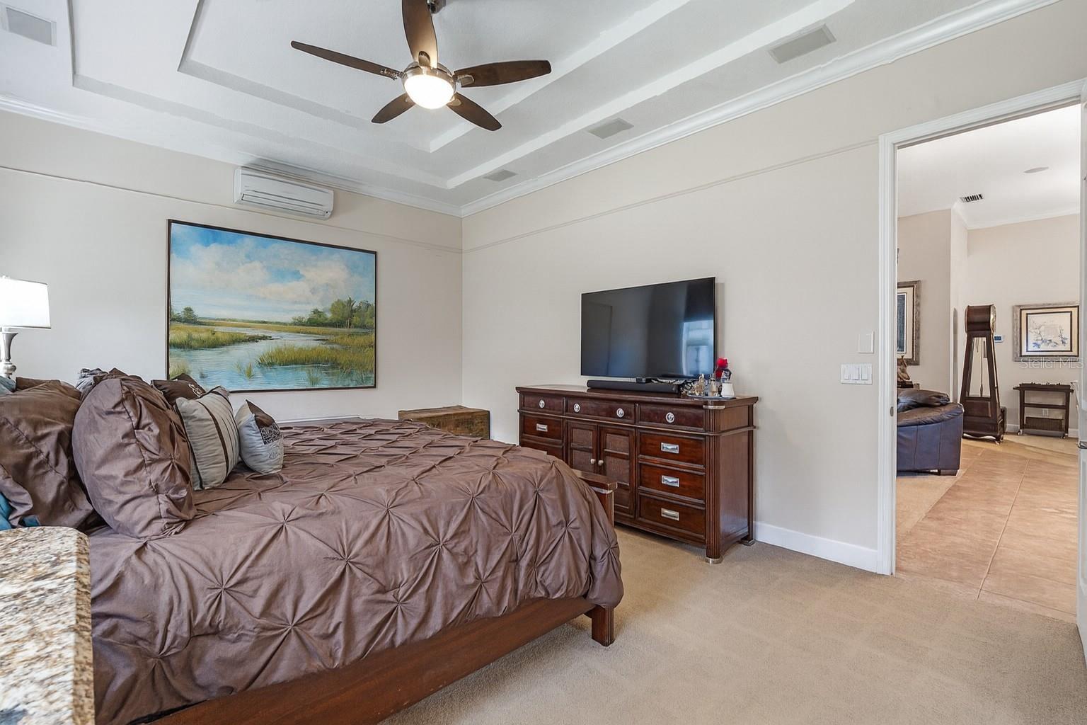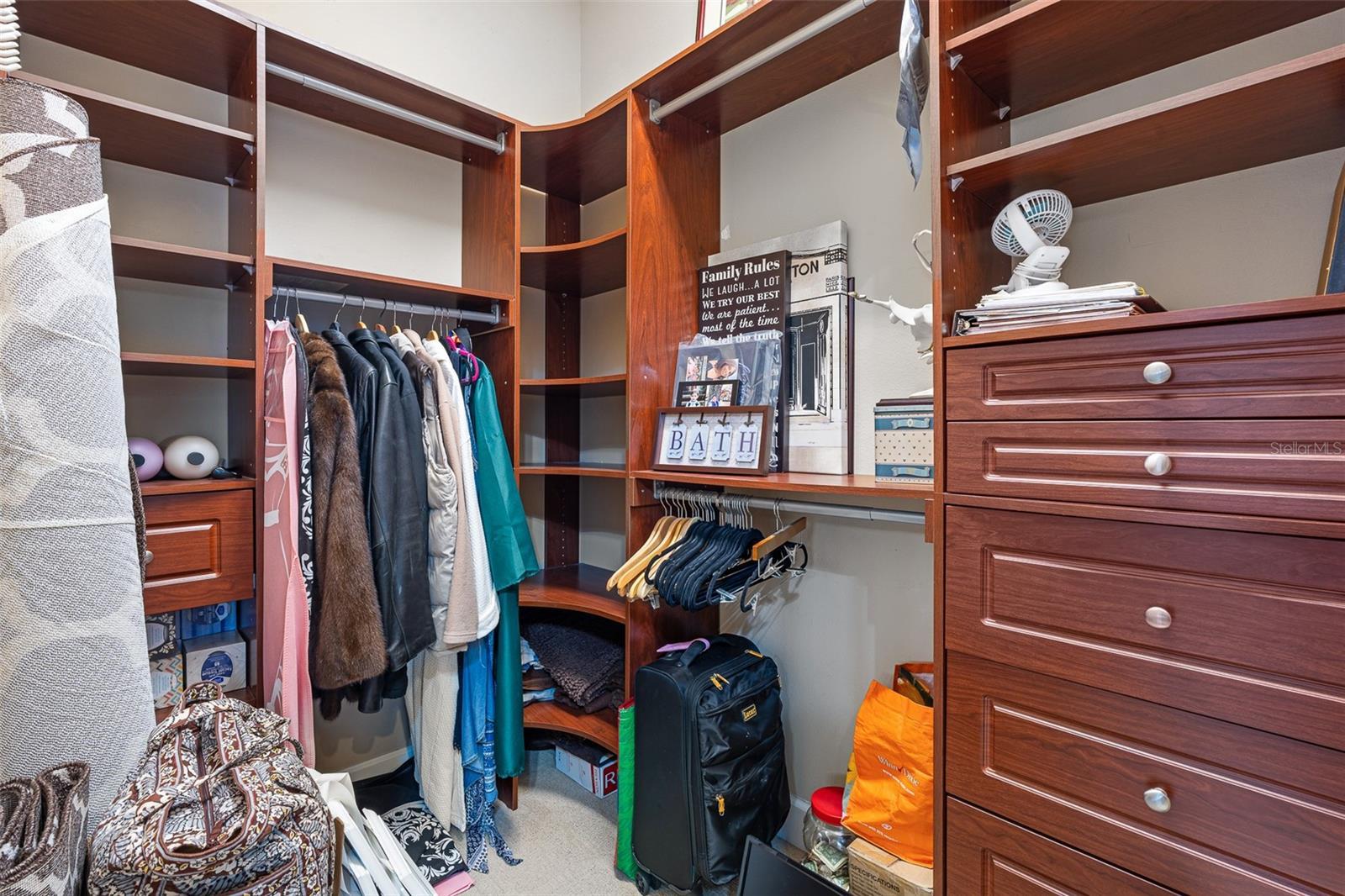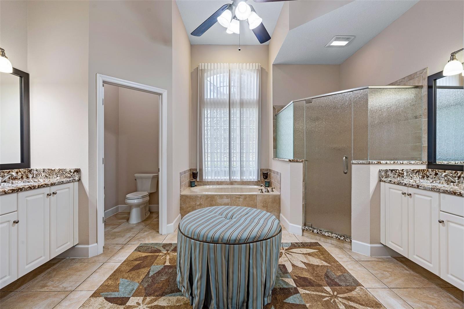 - Built-in Features, Ceiling Fans(s), Crown Molding, Eat-in Kitchen, High Ceilings, Kitchen/Family Room Combo, Living Room/Dining Room Combo, Open Floorplan, Primary Bedroom Main Floor, Solid Surface Counters, Solid Wood Cabinets, Split Bedroom, Stone Counters, Thermostat, Tray Ceiling(s), Walk-In Closet(s), Window Treatments
