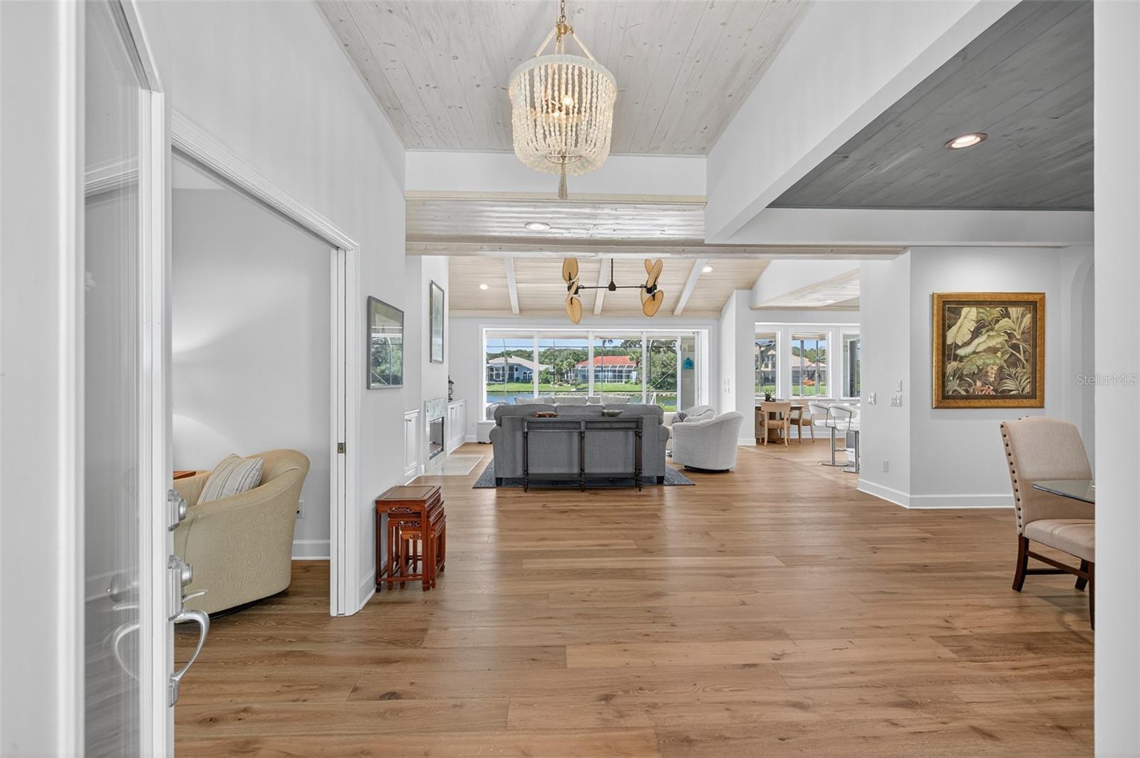 Under contract-accepting backup offers. LAKEFRONT ESTATE in desirable North Gate of Hammock Dunes, facing Conservation Area, 7th Green and backing to tranquil lake with beautiful lake vistas. Short walk to private beach access. One level living with many renovations including new Pool, remodeled Kitchen with upgraded stainless steel appliances, newly painted interior and exterior, 2017 tile roof, Impact glass windows on East side of home, Engineered wide plank French Oak hardwood floor throughout entire home, Impact glass office overlooking golf course, Vaulted tongue & groove pine ceiling in Great Room and Dining Room, Light fixtures by "Serena & Lily" in Foyer, Dining Room and Kitchen, new HVAC 2025. 150' on lake with spectacular vistas of lake and wildlife! 2022 Pool built with surround and screening plus 657sf Lanai renovated in 2018 with limestone floor, tongue & groove ceiling, propane fireplace, new lights and electrical outlets for gorgeous year-round living. Located in the desirable North Gate of Hammock Dunes which has all single family homes on half acre lots