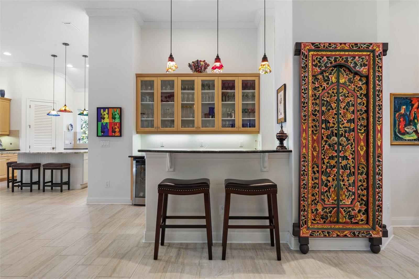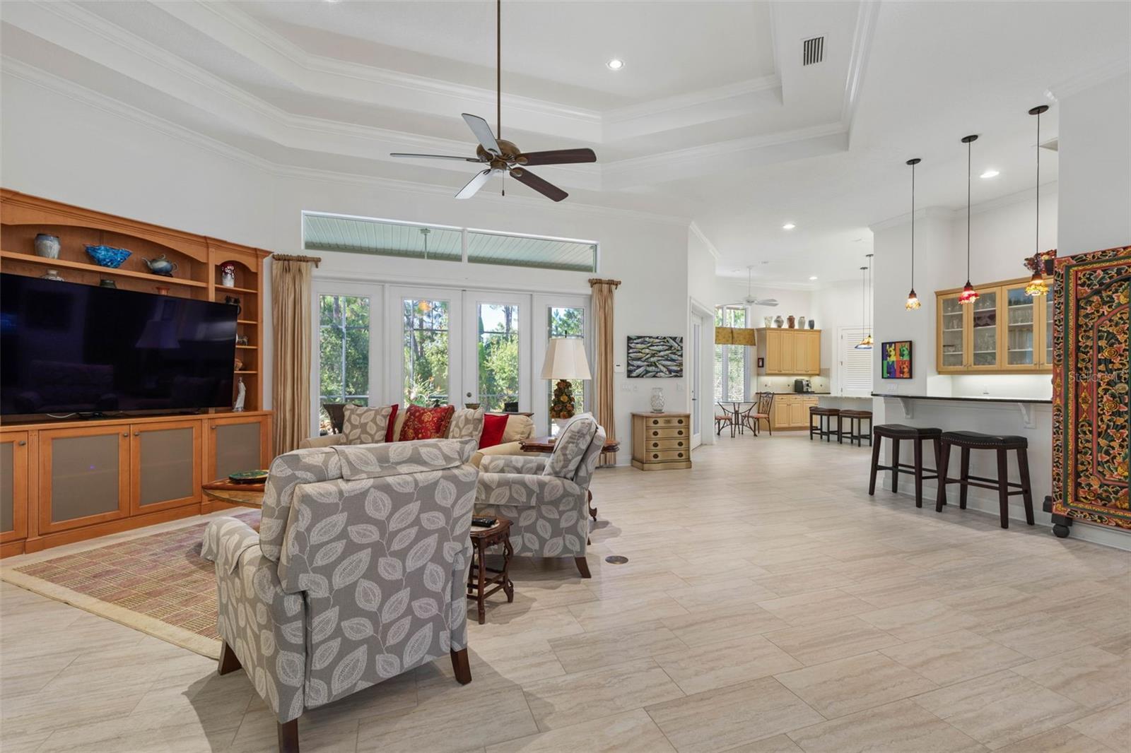 - Built-in Features, Dry Bar, Eat-in Kitchen, High Ceilings, Kitchen/Family Room Combo, Open Floorplan, Primary Bedroom Main Floor, Solid Surface Counters, Solid Wood Cabinets, Split Bedroom, Tray Ceiling(s), Walk-In Closet(s), Window Treatments