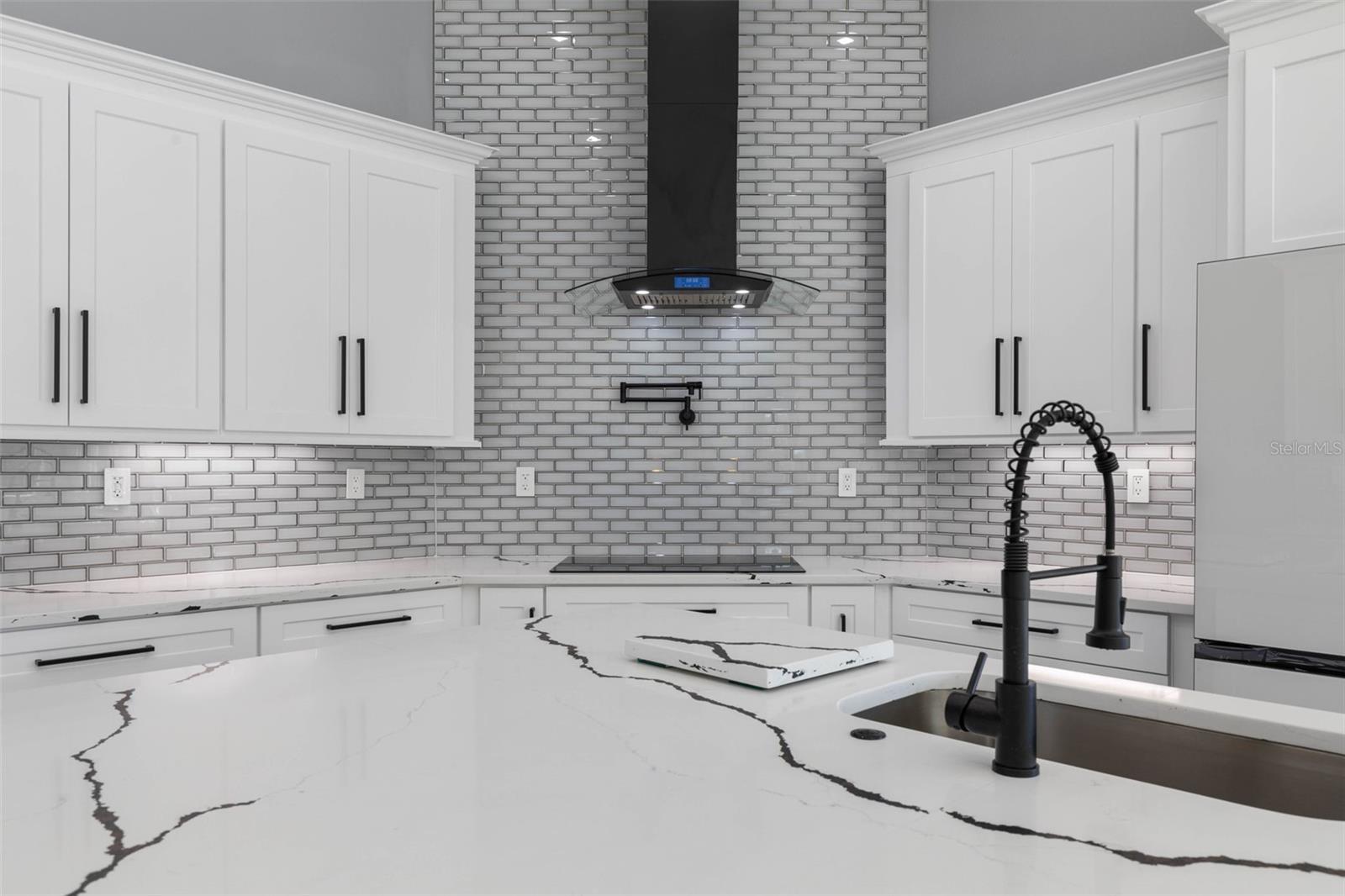 Under contract-accepting backup offers. This newly constructed masterpiece was thoughtfully designed to blend contemporary elegance with modern functionality. Stunning salt water canal residence perfectly nestled on an oversizesd corner cul-de-sac lot with an unparalleled curb appeal complete with a rare 3 car side load drive-thorugh epoxy floor garage, tropical landscaping and expansive paved driveway offering ample parking space. Step through the grand entryway into 3,388 of exquisite living space, 12ft soaring ceiling, 8 ft. doors, luxury vinyl plank flooring throughout. Once inside, the open concept is bathed in natural light thanks to large windows and 8ft slidders that seamlessly transition to the outdoor living area that is just as impressive ! The gourmet chef's Kitchen is a true showpiece: custom cabinerty, beautiful quartz counter-tops, tile backsplash, a large waterfall island with plenty of space for culinary creations, an under-counter wine and drink cooler, electrical outlets including over and under cabinet lighting and a stylish walk in pantry. Spacious living area povide room for relaxation, entertaining or family gatherings: the living room centers around a tiled wal with a linear electric fireplace with views showcasing the outdoor oasis. At the front of the home is the formal dining room and a dedicated den/office room perfect for privacy. The primary suite is a true retreat with a spa-inspired ensuite bathroom featuring modern tile floors and walls, double quartz vanities, a soaking tub, a luxurious walk-in-shower and a private water closet. Two additional generously sized quest bedrooms ensure ample space and confort for family and friends. The interior of the home is complete with an oversized laundry with custom cabinetry. Step outside to a showstopper resort-style pool surronded by an expansive covered paver lanai; a fully equipped summer kitchen, pool bath and a firepit for cozy evenings. Experience the ultimate setting for effortless outdoor living and entertaining while enjoying breathtaking water views. Schedule a private tour of this exceptional property!