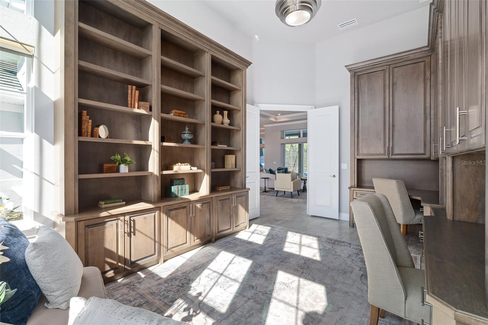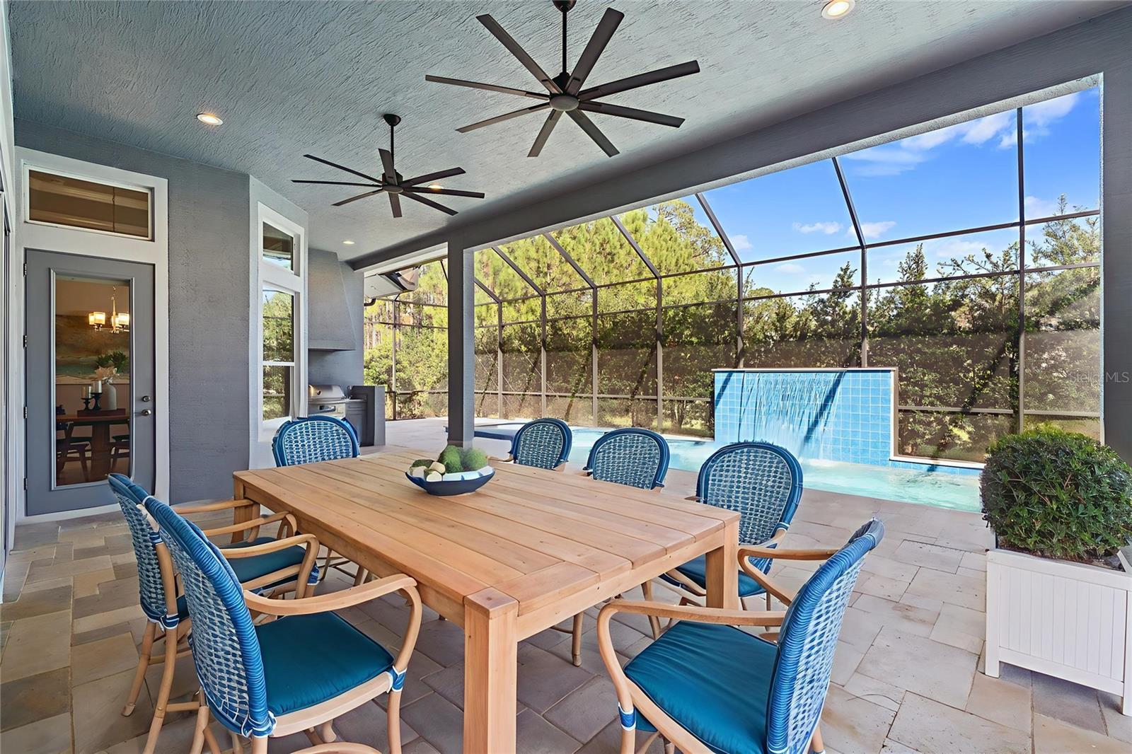 One or more photo(s) has been virtually staged. Discover luxury living at its finest in this 2022-built, designer-finished home in the prestigious gated community of Plantation Bay. Thoughtfully crafted with high-end upgrades and a resort-style pool oasis, this spacious 4-bedroom plus office residence offers the perfect blend of elegance, comfort, and Florida lifestyle. A double glass-door entry leads into a grand foyer enhanced by a tray ceiling and crown moldings, opening to an expansive living area. The family room features tile floors, a tray ceiling with crown molding, and disappearing 4-panel stackable sliders that frame the serene pool and waterfall backdrop. The gourmet kitchen offers GE appliances, an induction cooktop, built-in oven, LG refrigerator, quartz countertops, travertine backsplash, dovetail soft-close cabinetry, a large center island, and two pantry closets including wood built-ins. The adjoining breakfast nook overlooks the pool and includes lanai access and tray ceiling w/ crown detailing. Separate formal dining room at front of home enjoys abundant natural light, tile flooring, and peaceful lake views across the street. Spacious primary suite features crown molding, electric blinds, private lanai access, and 2 walk-in closets. The spa-style primary bath includes quartz countertops w/dual sinks & extended vanity, soaking tub, beautifully tiled walk-in shower with mosaic detail, and private water closet. The dedicated office is ideally positioned at front of home and includes double doors, built-in cabinetry suitable for dual workspace, ample natural light, tile flooring, and its own access to 1-car garage. Split floor plan with 3 additional guest bedrooms offering comfortable accommodations w/carpet & privacy shades, while a fourth guest suite features en-suite bath w/lanai access. All bathrooms include quartz counters & tiled showers. Laundry room provides additional cabinetry, sink, and storage closet for convenience. The outdoor living space is a true highlight, featuring resort-style HEATED pool w/waterfall wall, spa with electric heat pump, travertine decking, remote-controlled Pentair system, LED lighting, and an extended covered lanai. The outdoor kitchen includes gas grill and cabinet storage, perfect for entertaining year-round. Accented with lush landscaping for great privacy and plenty of room for furry friends. Additional features include two HVAC units, hot water heater w/recirculating pump, wood shelving in all closets, epoxy-coated floors in both 2-car and 1-car garages (3 cars total), side fenced yard, portable generator with gas cans, tile roof, paver driveway, WIFI-enabled light switches, and no home directly across the street, providing peaceful lake views. Easy access to walking trails enhances the location. Plantation Bay Golf & Country Club is a gated, golf cart friendly community offering optional membership to world-class amenities including 45 holes of championship golf, two clubhouses with thirty million dollar Founder Clubhouse, fitness and spa facilities, 2 pool-resort style, lap pool, 9 lighted tennis courts, 10 lighted pickleball courts, restaurants, bocce ball, walking trails, and a full calendar of social activities. Buyers of this home to receive a substantial discount on initiation fee at the club. Ask listing agent for details. This exceptional property combines luxury finishes, thoughtful design, and a coveted Plantation Bay address-offering a rare opportunity to own a like-new estate home with every upgrade in place.