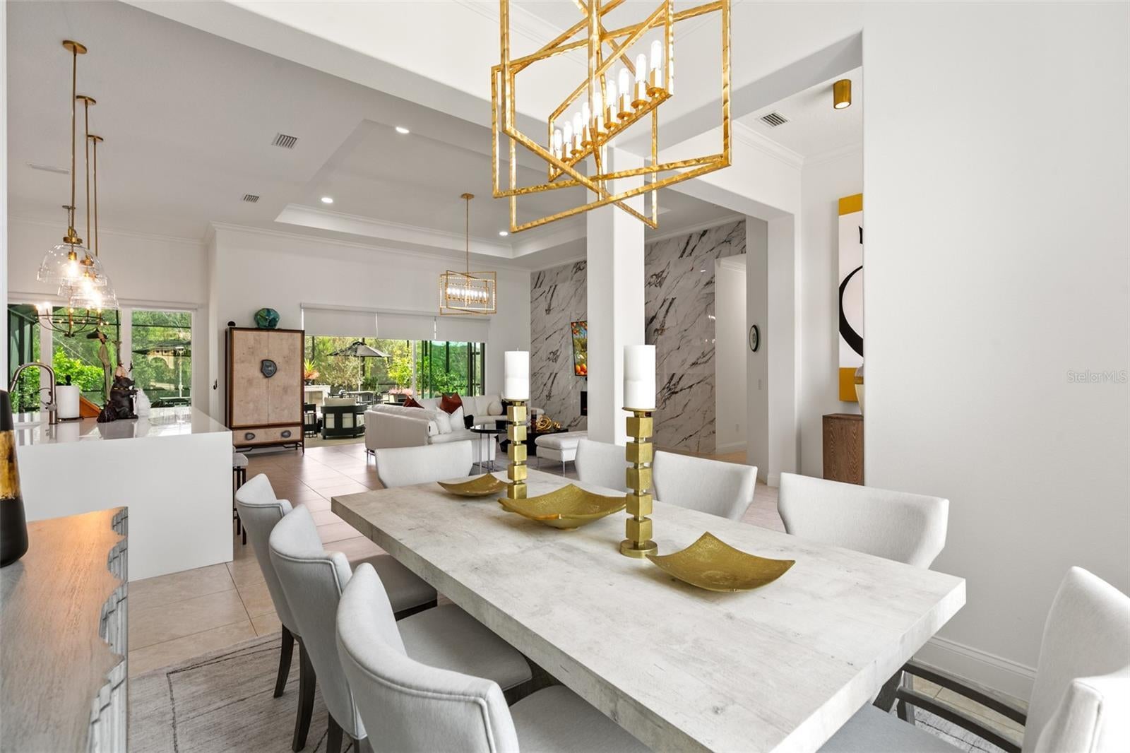 This exceptional Skyway Builders residence has been elevated to a new level of sophistication, meticulously reimagined by its current owners into a true designer’s showcase. Over $200K was spent on renovations since 2021. The newly crafted outdoor living sanctuary features a custom-designed, Forno Bravo wood-burning pizza oven alongside a separate gourmet grilling station and bar, making it an exquisite setting for both effortless entertaining and serene relaxation. Inside, the open-concept layout centers around an exquisite Great Room highlighted by a stunning, floor-to-ceiling tiled feature wall. Seamlessly connected is the Formal Dining Room and the re-envisioned chef’s kitchen, boasting a Cambria Quartz waterfall island, illuminated glass cabinetry, and a full suite of premium new appliances, including a Dacor six-burner induction range. A charming dinette area frames views of the outdoor oasis and the tranquil private reserve beyond. The outdoor grounds are thoughtfully curated with olive trees, citrus trees, and a dedicated herb garden that perfectly complement your artisanal outdoor culinary experiences. This uniquely adaptable floor plan also offers the flexibility to create a private media room, an in-law suite, or a secluded office with its own dedicated entrance and walkway. Every bathroom has been luxuriously appointed with Cambria Quartz countertops, Kohler fixtures, and designer mirrors. Additional enhancements include new designer lighting throughout, upgraded engineered wood flooring in all bedrooms, and a comprehensive whole-house water purification system. The exterior landscaping has been completely transformed, featuring an extended paver driveway and walkways. Recent upgrades include a newly replaced (2025) air-conditioning system with a 5-inch media filter and Bio Guard UV light for superior indoor air quality. A new private well for landscape irrigation eliminating recycled water costs. The oversized two-car garage offers exceptional storage with wall-to-wall cabinetry, an air-conditioned mechanical room, and a 240-volt outlet for electric vehicle charging. As a Grand Haven resident, you will enjoy an array of world-class amenities, including two heated community pools, two fitness centers, seven tennis courts, pickleball courts, bocce, scenic walking trails, and the vibrant Village Center social hub and restaurant. The community is also home to the Jack Nicklaus Signature 18-hole golf course with its accompanying clubhouse and restaurant overlooking the Intracoastal Waterway. Memberships remain available.