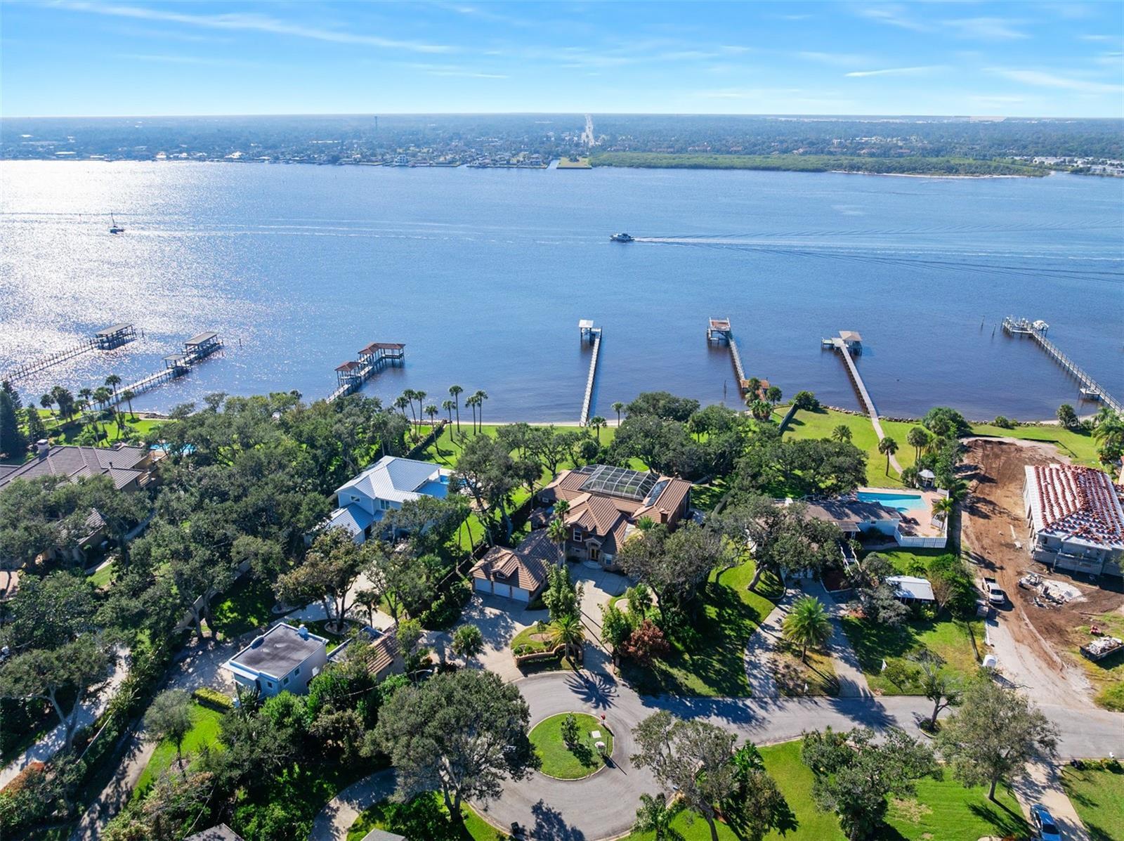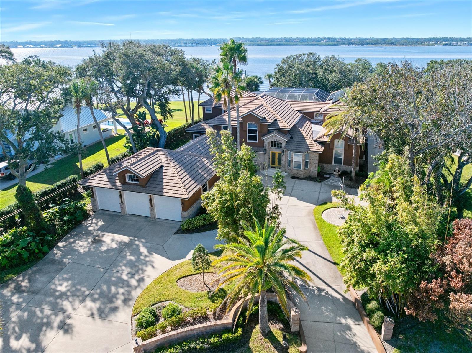 Fabulous waterfront estate home perched high on a bluff offering commanding views of the intracoastal waterway across the beautiful oak shaded riverfront lawn. With almost 8000 Sq Ft of high end custom construction, the home is situated on nearly 1 acre of elevated land and offers a 5 bedroom, 4.5 bath main home in addition to a detached 1 bed, 1 bath waterfront guest house and a 6 car garage. Enter the home to find a tremendous waterfront great room where multiple living, dining and entertaining spaces flow together seamlessly under volume ceilings while enjoying panoramic water views. A series of French doors open onto the fabulous screened paver appointed lanai that surrounds the crystal blue pool and serves as the ultimate area to entertain or relax with a grand poolside wet bar, dedicated pool bath, dry sauna and firepit. The custom home is truly one of a kind with a magnificent ground floor owners' suite with a private waterfront den with fireplace, cavernous walk-in wardrobe and a fantastic bath with double vanities, jacuzzi tub and steam shower. Eat-in island kitchen opens into the great room and is just adjacent to the lovely formal dining room with a gas fireplace. A handcrafted solid wood wine bar is just off the stately dining room and just steps from the poolside patio. A choice of two staircases will carry you to the second floor where three bedrooms and multiple open air lofts and landings await with panoramic views of the water and the rolling green lawn. The magnificent waterfront grounds below the elevated pool deck features a fabulous gazebo centered between towering live oaks. A concrete pathway stretched to the base of the deepwater dock with a sun deck, boat house w/lift and second story observation level above. The unique lot is situated at the end of a quiet cul-de-sac and allowed space for the longtime owner to construct a lovely guest quarters atop a seperate 1.5 car garage with a waterview living room, bedroom and balcony. Two more connecting oversized showroom garages with a total of 5 large spaces are ideal for the collector finished with tile floors and gracious windows for plenty of natural light and breezes while tinkering. The home has been outfitted with a Generac generator. A new 50 rear tile roof was installed in 2018. The quiet location contributes to the undeniable serenity. Sit beneath the oaks and watch the sunset while you listen to the Atlantic Ocean crash the shore from just two blocks away. Jump in your boat and be on Ponce Inlet's Disappearing Island in mere moments or tie up to the dock at Down the Hatch Seafood to listen to live music and enjoy a fish sandwich. This property has been consistently maintained by a knowledgeable longtime owner who is market savvy and has priced this for immediate sale.