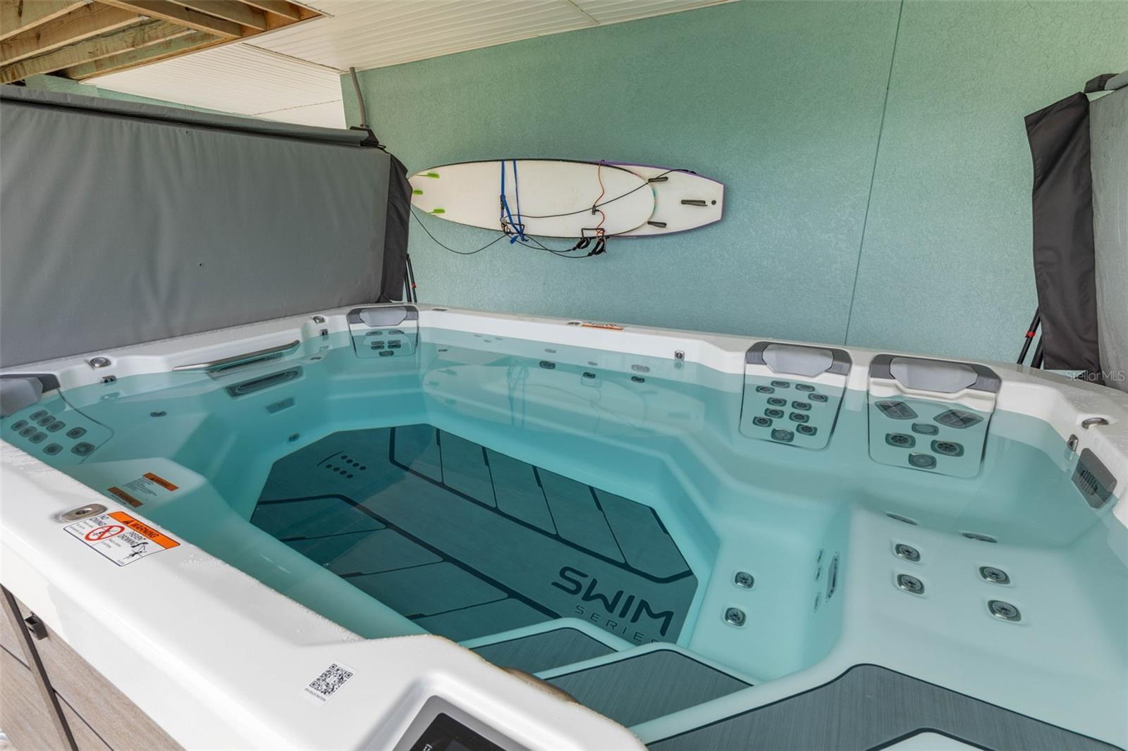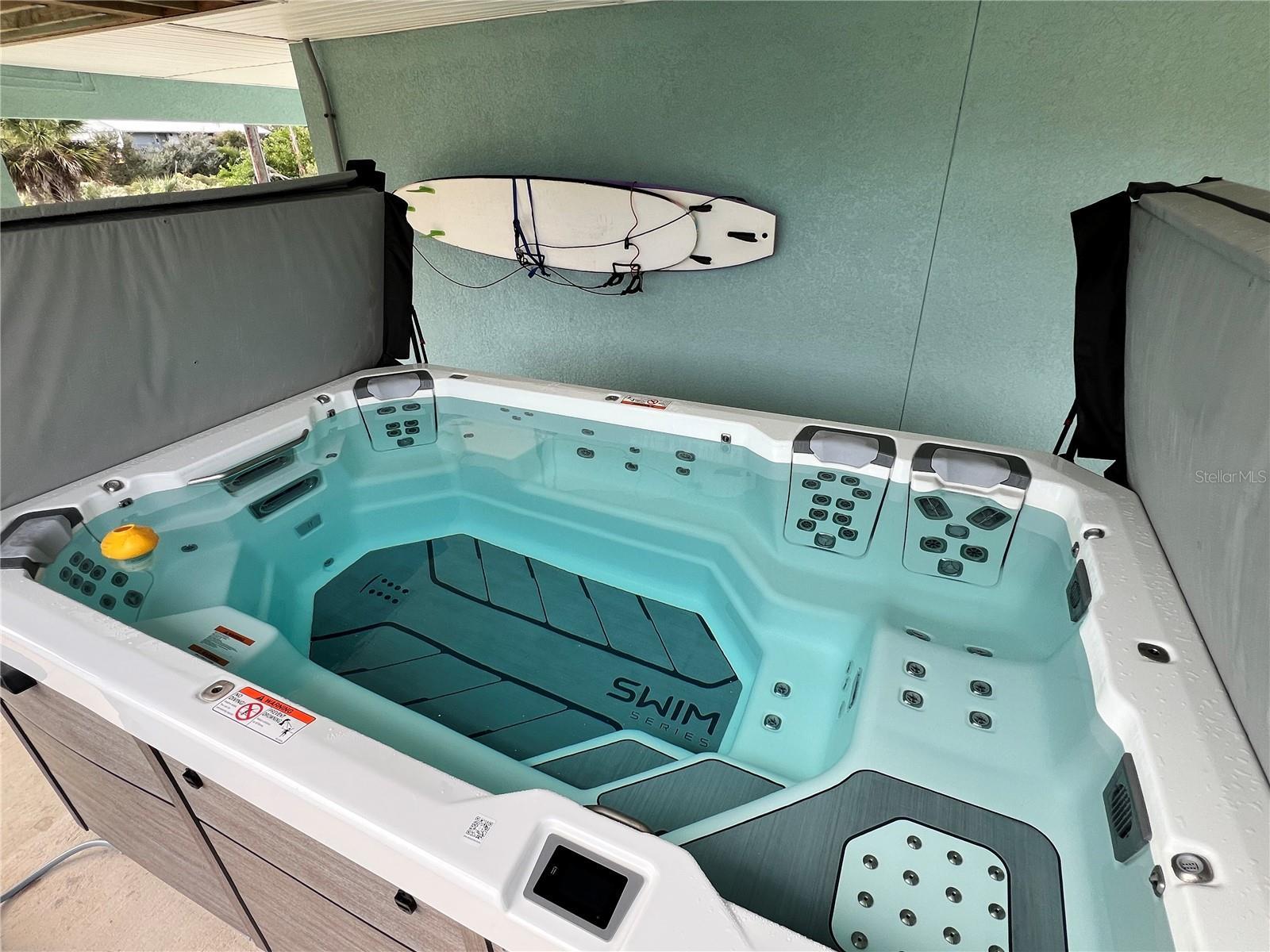 No work required! Completely furnished, turnkey beachside home. You are a suitcase away from relaxing on the beach, golfing, kayaking or fishing. Splash in the new swim spa. This 3/2 bath home is located in a safe residential beach community. Walk or bike to the beach on a quiet residential street with dedicated access at end of street. The uncrowded beach has miles of soft sand to explore, with no cars, crowds, or traffic. Good surfing, swimming and fishing. No HOA. Short term vacation rentals allowed. Soaring vaulted ceilings and a great room design keep all light and bright. 3 bedrooms on the main level with luxury vinyl flooring throughout, immaculately clean, impact rated doors and windows. Low maintenance hardi siding, trex decking and tons of parking. The kitchen features porcelain countertops, soft close cabinets with pullout shelves, a 5 burner cooktop with double oven, and stainless appliances. Primary suite has 8x10 walk in closet, private bath with tile floors and large shower. Dual vanity with quartzite tops and stainless fixtures. 2 guest bedroom and 2nd bath on this level. Ground level has 18x24 heated and ac "man cave" game room. Built in 2023 home features include: Hurricane rated impact windows and doors, luxury vinyl flooring, plantation shutters, remote controlled blinds, porcelain and quartzite countertops, designer level appliances, trex decks, swim spa, fully furnished, multiple parking spots, vinyl fencing, and "stubbed" in for an added bath on first level. Oversized one car garage and extra parking with large carport and concrete driveway parking. Sunny back deck with outdoor shower and screened covered deck off kitchen and bedroom. There is also a pre-wired location for elevator lift off rear deck. Beach allows dogs. Great home for full time living, vacation home, or short term rental income.