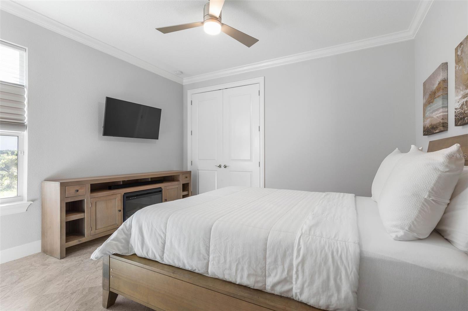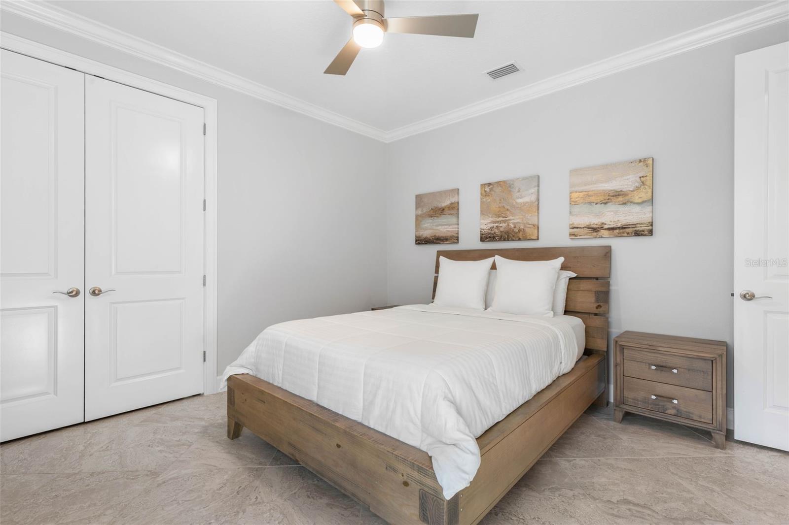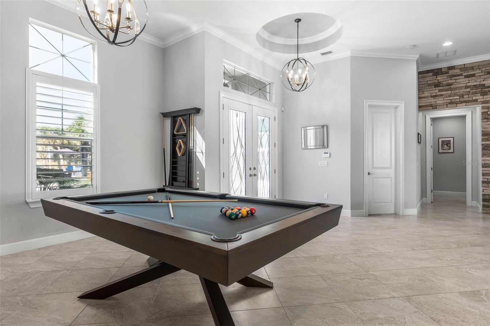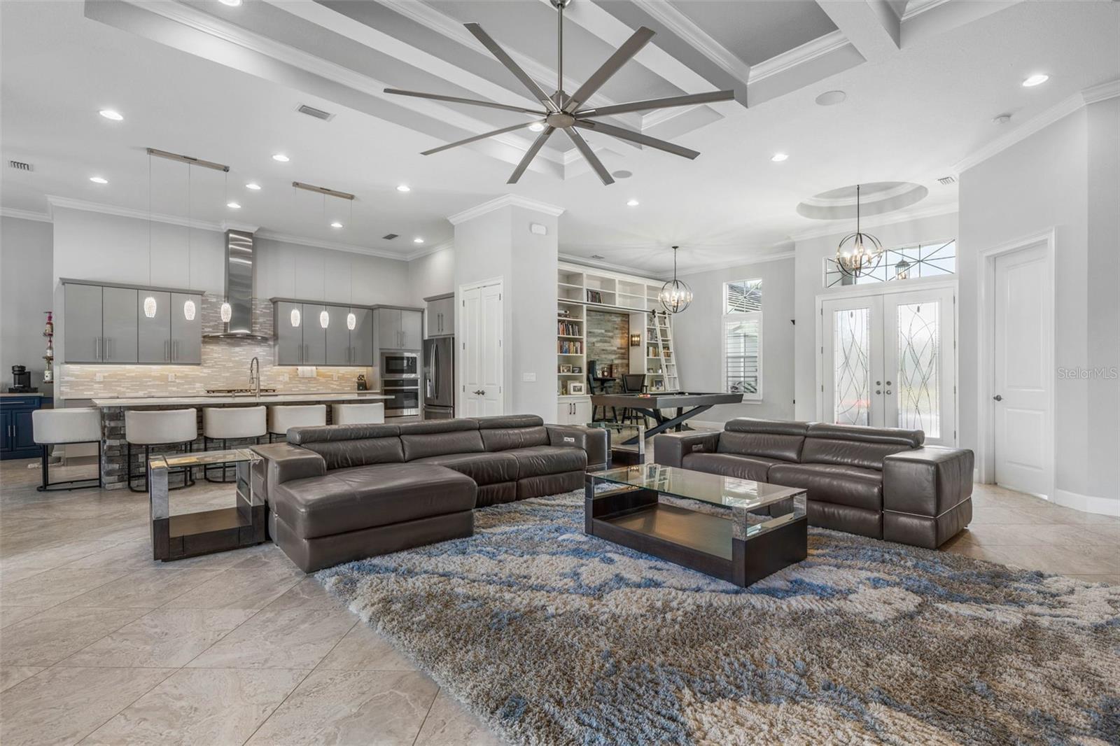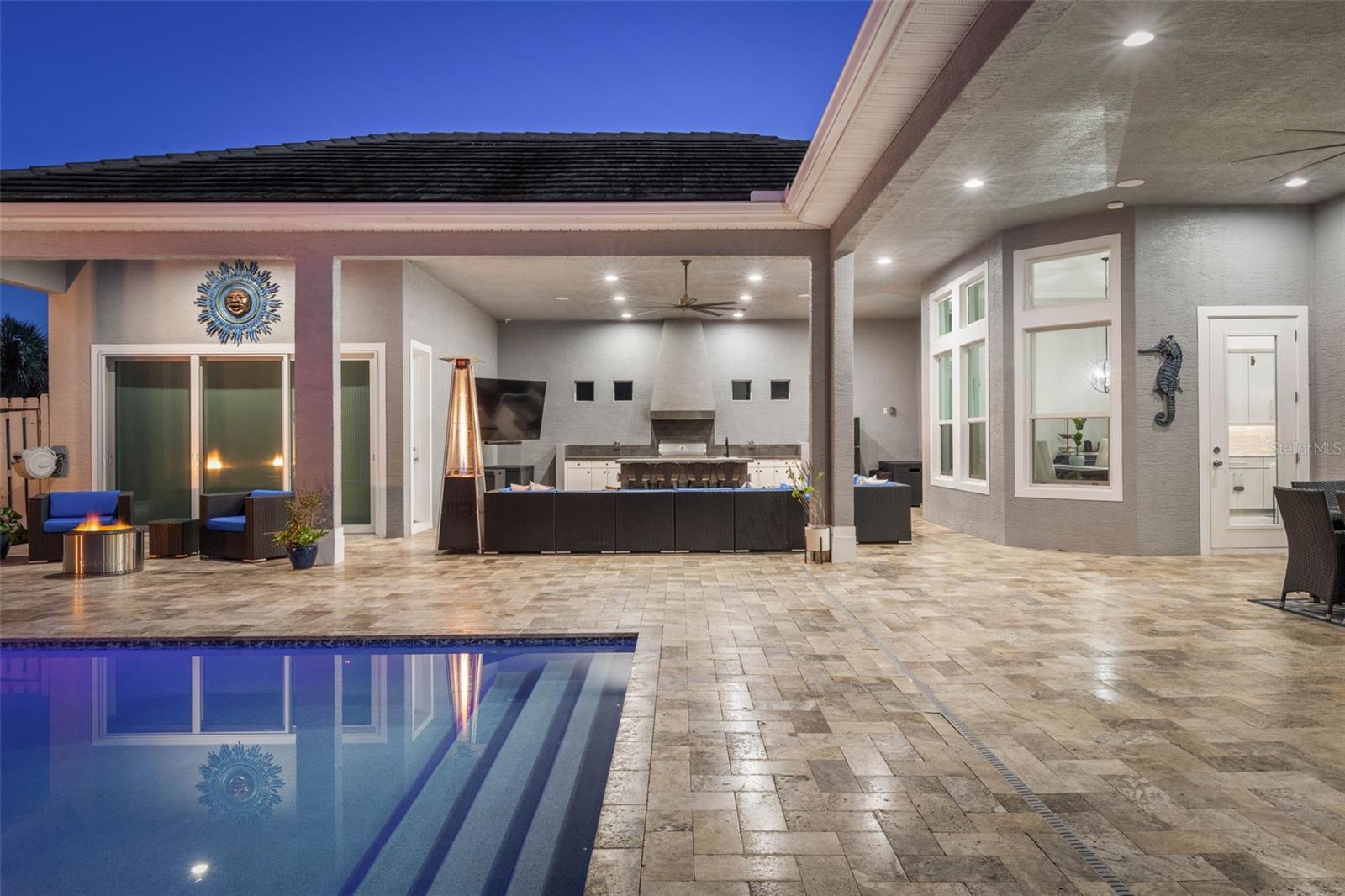 Welcome to an exceptional coastal estate in the private, oceanfront golf community of Hammock Dunes, located within the exclusive Island Estates sanctuary. Built in 2021, this refined residence blends modern construction with timeless Florida coastal elegance. Set on a nearly one-acre, west-facing homesite, the property captures glorious sunrise skies over the Fox Cut waterway, a brackish canal connecting to the Intracoastal Waterway at both ends of the island. Dock-ready electrical and plumbing are already in place for a future private dock. A fire-pit seating area creates the perfect setting for evening relaxation, and a whole-house Generac generator ensures uninterrupted comfort. A rare detached one-bedroom, one-bath casita with private entrance and kitchenette offers guests or extended family a truly private luxury experience. It opens to a stunning 26’ x 27’ covered summer kitchen with built-in grill and vented hood, seamlessly connecting to a 24’ x 17’ covered lanai overlooking the 30’ x 15’ heated and cooled pool with fire-bowl features and tranquil water views. Through leaded-glass French doors, soaring tray ceilings and light-filled living spaces welcome you into the main residence. A striking double-sided fireplace, shared with the primary suite, anchors the elegant living room, while disappearing sliding glass doors open fully to the lanai, summer kitchen, pool, and waterfront beyond — creating true indoor-outdoor living. The gourmet kitchen features Cambria quartz countertops, GE Profile stainless steel appliances, and a gas cooktop and hood designed for serious culinary enthusiasts. The oversized island and breakfast nook both enjoy sweeping views of the pool and waterway. A custom library and dining area by Master Wood Artisan Keith Larrett showcases a one-of-a-kind floor-to-ceiling book wall with rolling ladder, integrated seating, and views into the billiards area which can be covered and quickly converted back to a custom dining table — a true showpiece. The primary bedroom retreat occupies the entire north wing, offering private lanai access, volume tray ceilings, two custom walk-in closets, and a spa-inspired bath with dual glass-enclosed shower, built-in seating, split vanities, and private water closet. Adjacent is a fourth bedroom currently used as a distinguished office, highlighted by an elegant oval window array — the home’s own “Oval Office.” The south wing includes two generous guest suites, each with full ensuite baths, one of which also serves as a dedicated pool bath opening directly to the pool, covered lanai and covered summer kitchen. A side-entry three-car garage features decorative sealed flooring, central vacuum system for the entire house, overhead storage, and one of two washer/dryer sets. A second interior laundry room adds convenience and flexibility. This remarkable residence offers the finest in Florida coastal living, with access to the optional but prominent Hammock Dunes Country Club, including the Tom Fazio oceanfront championship course, the Rees Jones Creek Course, and elite amenities. Call Scot to arrange your private showing while this extraordinary island estate remains available.