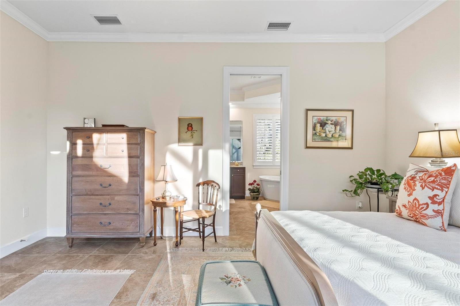 - Cathedral Ceiling(s), Ceiling Fans(s), Crown Molding, Open Floorplan, Primary Bedroom Main Floor, Solid Surface Counters, Solid Wood Cabinets, Split Bedroom, Walk-In Closet(s)