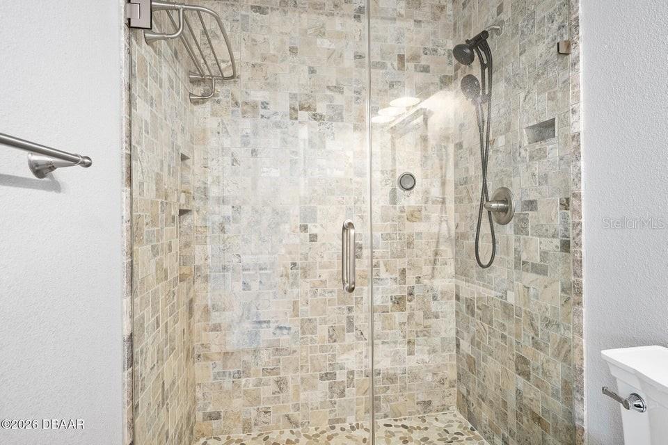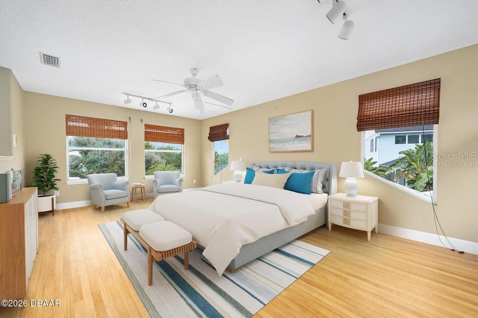 If you've been searching for a beachside home just a short stroll from the ocean—complete with a newer roof, walk-in closets, a spacious primary suite, and a rare 3-stall garage for all your toys—your search ends here. This custom-built home offers standout curb appeal from the moment you arrive, with a gated driveway and professionally designed tropical landscaping enhanced by stunning outdoor lighting. Step inside and enjoy an oversized screened lanai overlooking the custom heated pool, fire pit, and a covered seating area perfect for relaxing or cheering on your favorite team. The open-concept living area seamlessly connects the kitchen—with its generous pantry—to the living room, where volume ceilings and a cozy fireplace create an inviting atmosphere. A beautiful wide wooden spiral staircase leads to the bonus loft, offering endless possibilities: a fourth bedroom, art studio, workout space, or whatever suits your lifestyle.