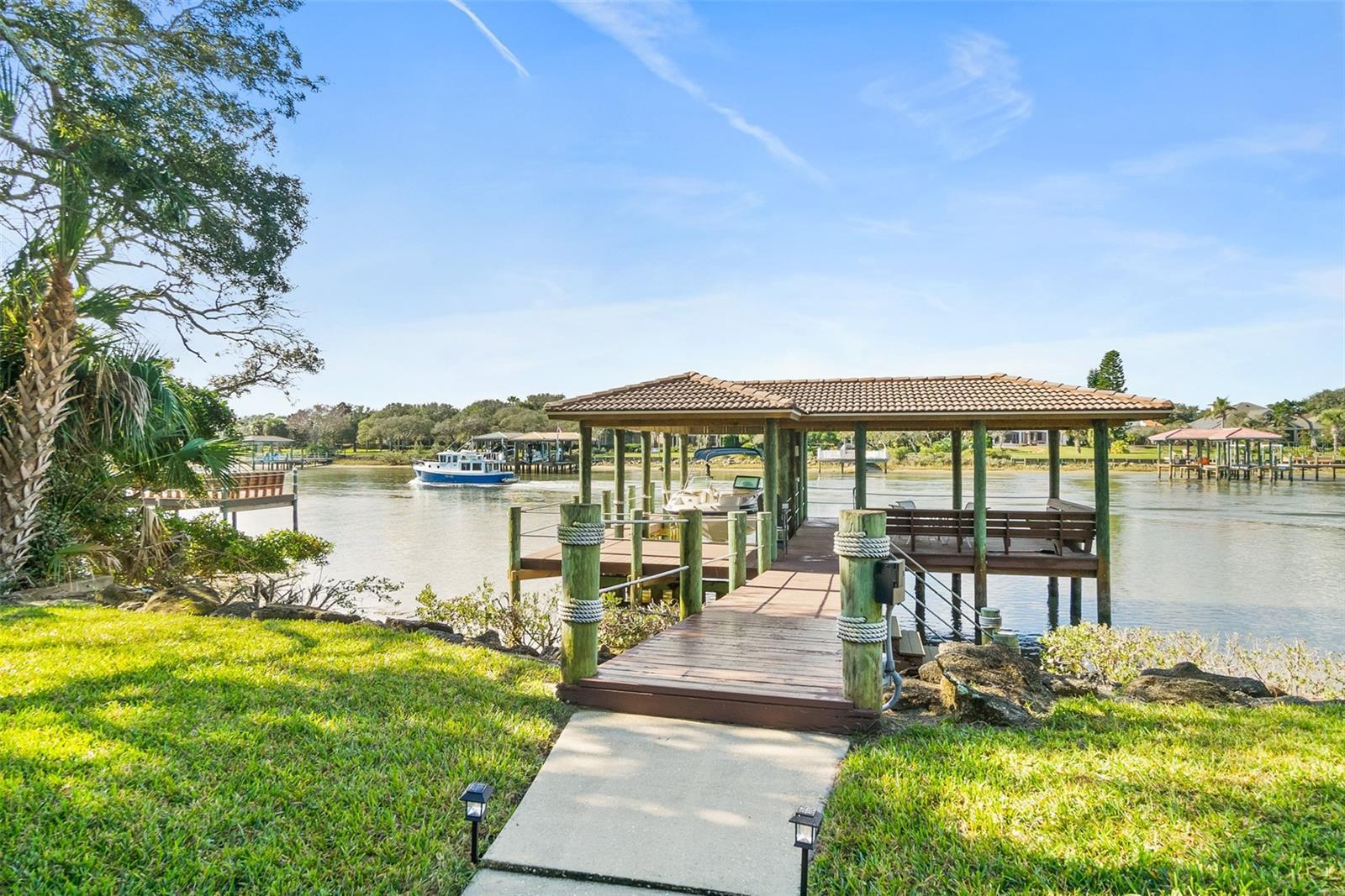 Welcome to Island Estates in Hammock Dunes. Pull you boat up to your DOCK on the Intracoastal and step into this Machin POOL home (one of Palm Coast’s premier builders) with many updates. The current owner has made the following IMPROVEMENTS creating an open concept perfect for entertaining family and friends. COMPLETE REMODEL OF KITCHEN-Removed wall, reconfigured kitchen, cabinets, appliances, wine cooler; NEW CARPET FIRST FLOOR BEDROOMS AND OFFICE; PRIMARY BATH–New cabinets, light fixtures, glass shower enclosure; POOL RESURFACE; POOL ENCLOSURE PAINTED AND SCREEN REPLACED; POOL DECK PAINTED; POOL PUMP AND HEATER; OUTDOOR KITCHEN; BOAT DOCK REFURBISHED AND LIFT UPDATED, WATER AND ELECTRIC ADDED; PAINTED INTERIOR AND EXTERIOR; NEW WASHER AND DRYER; REPLACED FANS AND LIGHT FIXTURES; REPLACED UPSTAIRS HVAC; NEW WATER HEATER WITH RE-CIRCULATOR; 3 BEDROOMS, OFFICE, 3 BATHS ON MAIN LEVEL; SECOND LEVEL HAS BEDROOM, BATH, KITCHENETTE AND FAMILY ROOM WITH LARGE SUN DECK WITH VIEWS OF ICW. This waterfront home is in the gated community of Island Estates which consists of 168 homes on large 1+ acre lots and has private gated beach access. It is in the area locals refer to as “The Hammock” and is part of Hammock Dunes. Hammock Dunes Club has memberships available but are not required. In addition to boating, with a membership to Hammock Dunes Club, one can enjoy amenities found in 5-star resorts. Located on the ocean, the club has 2 golf courses, restaurants, pool and splash pad, tennis, croquet, pickle ball, huge fitness center and social events that will appeal to everyone. Palm Coast is the best kept secret in Florida. Miles of beautiful beaches, over 125 miles of bike paths, beautiful parks along Intracoastal Waterway, a thriving art & theater community, home of famous artists, golf courses for every day, fishing, boating, wind sailing, surfing, canoeing are just a few of the things to do. Orlando and Disney World are close for a day outing and Jacksonville with all the shopping one could desire & the famous Mayo Clinic is one hour. NASCAR & ST. Augustine are within a thirty-minute drive.