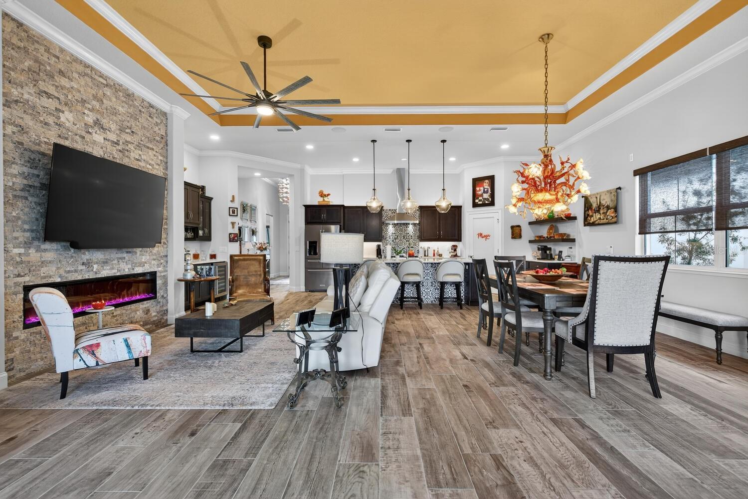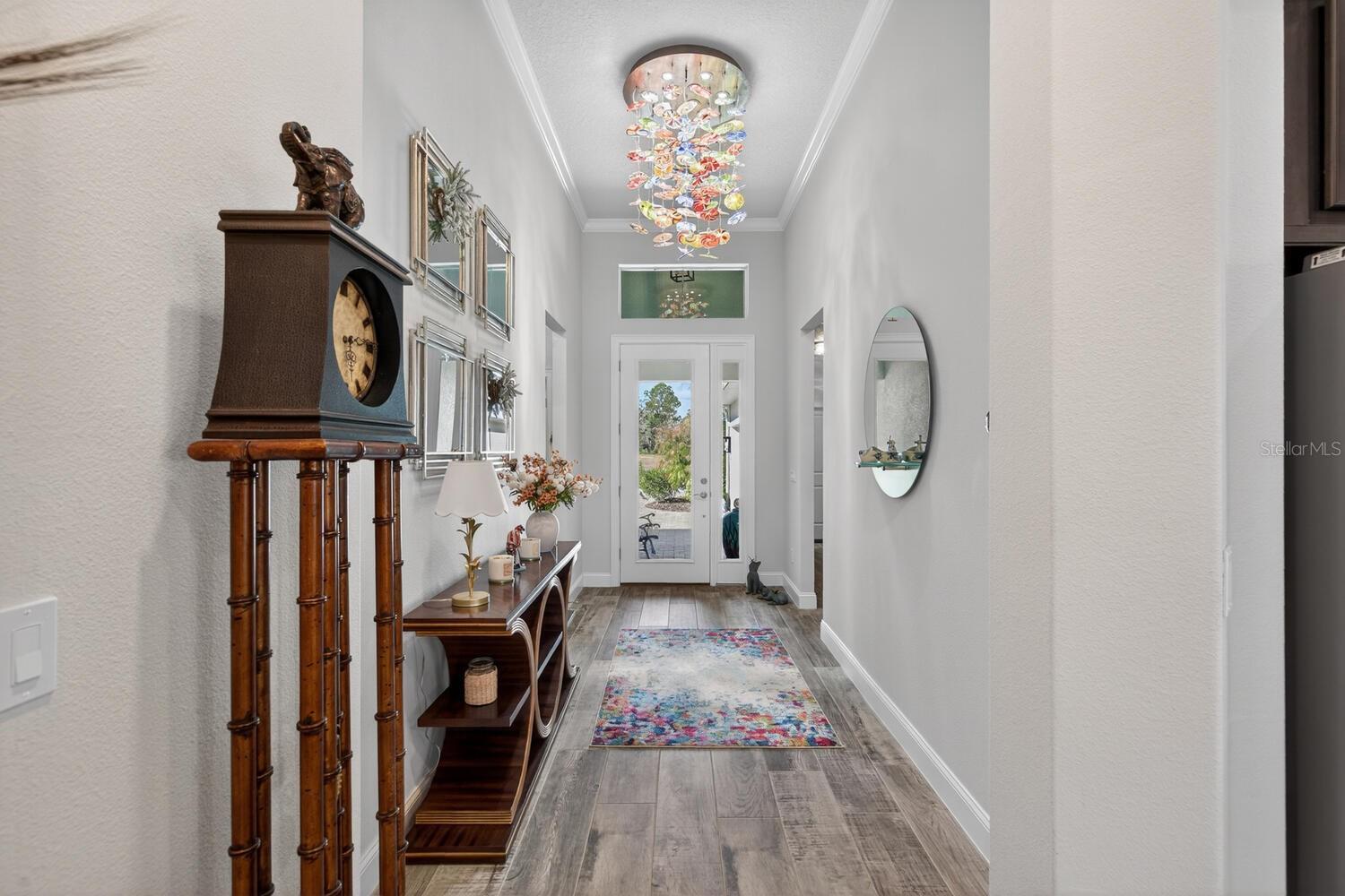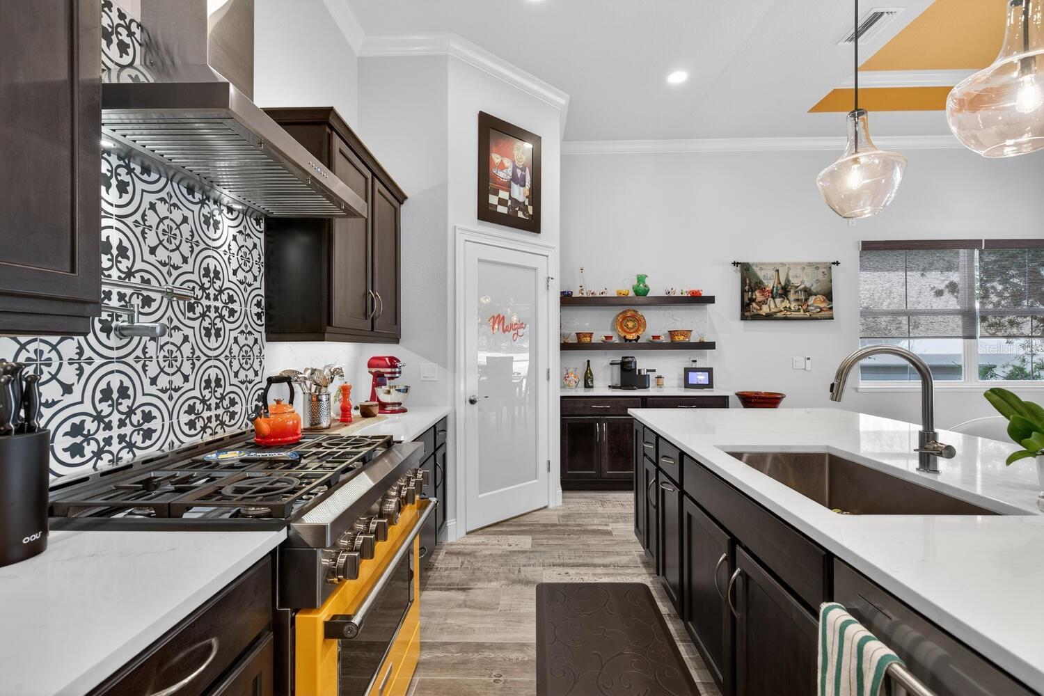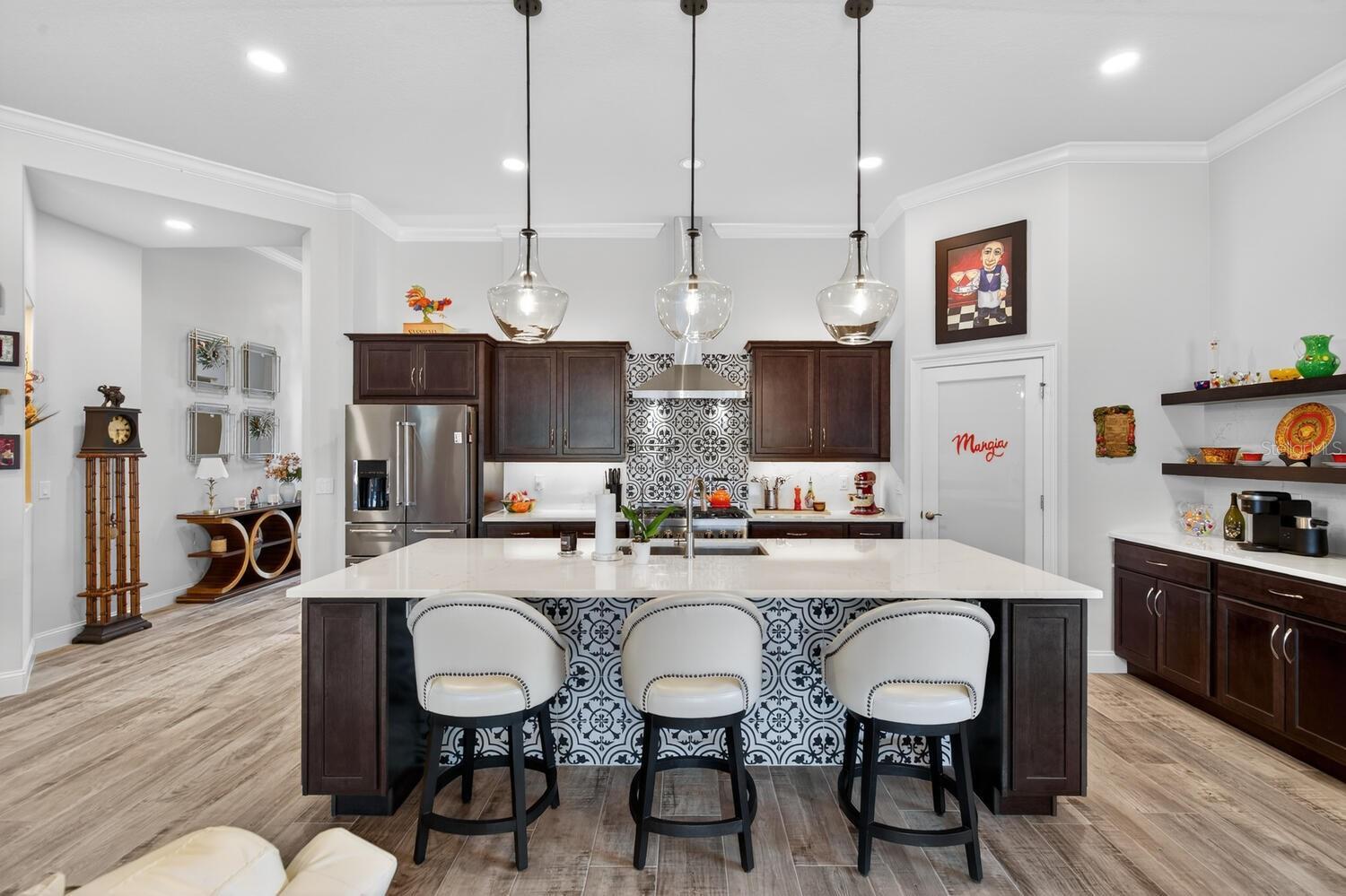 Experience luxury living in this beautifully appointed Saltwater-built home, situated in the distinguished gated golf community of The Conservatory at Hammock Beach. This elegant residence masterfully blends modern sophistication with effortless indoor-outdoor flow, welcoming you from the moment you enter with soaring ceilings, an abundance of natural light, and breathtaking views through fully retractable sliding glass doors that seamlessly open to your private outdoor oasis. The home offers serene vistas overlooking a lake and the golf course, with a peaceful preserve beyond. The heart of the residence is an inviting open-concept layout that combines a gourmet kitchen, adjoining dining area, and spacious family room—ideal for both everyday living and effortless entertaining. The chef’s dream kitchen features high-end finishes, including KitchenAid appliances with a six-burner gas range, quartz countertops, a stunning custom tile backsplash, a dedicated coffee station, a full wet bar with beverage refrigerator, and a large walk-in pantry. The adjacent family room is highlighted by a striking stone wall with a linear fireplace. Step outside to an oversized lanai equipped with a retractable, hurricane-rated screen, a summer kitchen complete with sink and beverage refrigerator, and a large saltwater pool that enjoys open, unobstructed views over the lake and golf course. Additional standout features include an 800-bottle refrigerated wine room located off the entry, a versatile office (which can serve as a fourth bedroom), and a serene primary suite boasting peaceful views, a luxurious bath with a large walk-in shower, dual vanities, and heated floors. Two additional guest bedrooms provide ample space, one of which includes an ensuite bath. Other thoughtful upgrades enhance everyday comfort and convenience: an epoxy-finished garage floor, remote-controlled blinds in the primary suite and dining room, California Closets storage solutions, a whole-house Sonos sound system, and a dedicated pool bathroom. Nestled within The Conservatory—a premier community home to the signature Tom Watson golf course—this exceptional property provides access to resort-style amenities, including a pool, clubhouse, and fitness facilities (with membership optional for residents). Don’t miss the opportunity to own this turnkey masterpiece in one of Palm Coast’s most sought-after golf communities.