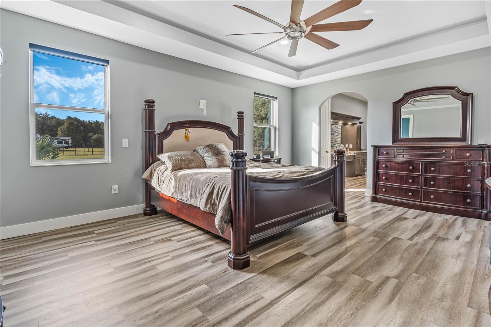 - Ceiling Fans(s), High Ceilings, Open Floorplan, Primary Bedroom Main Floor, Split Bedroom, Stone Counters, Tray Ceiling(s), Walk-In Closet(s)