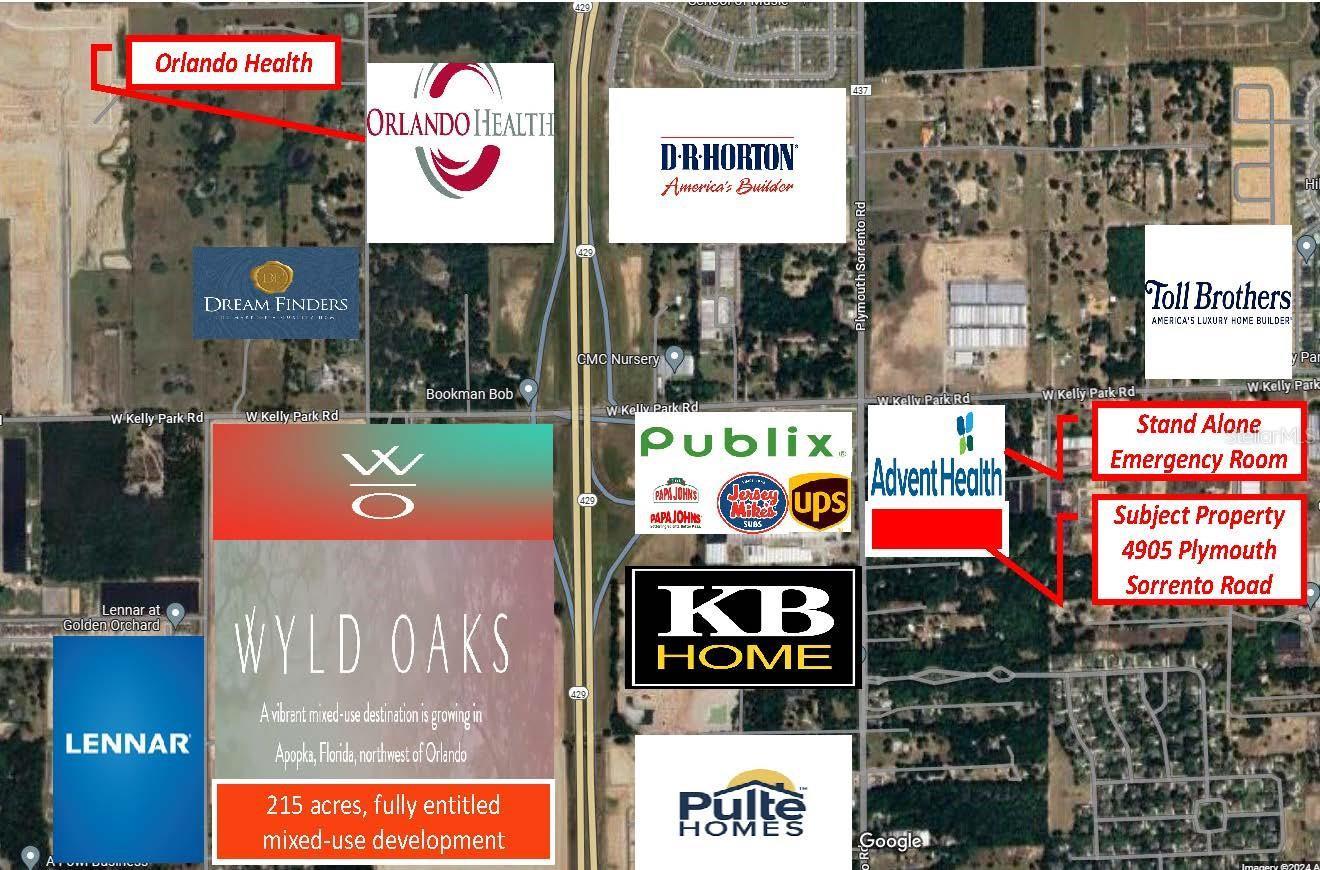 PRIME DEVELOPMENT OPPORTUNITY: 2.58+/- ACRES WITH MIXED-USE ZONING OPTION IN THE "VILLAGE CENTER" DISTRICT OF THE KELLY PARK INTERCHANGE(KPI), APOPKA, FL 32712. Located at Kelly Park & Plymouth Sorrento Roads, this development parcel is contiguous to the new AdventHealth free-standing Emergency Room located on the corner and situated in the highly desirable East "Village Center" of the Kelly Park Interchange Mixed-Use Zoning District. With 165' of direct frontage on Plymouth Sorrento Road, this parcel is flat & level needing minimal site & clearing work, City Water/Electric/Internet/Phone at Site, Excellent Ingress/Egress, Daily Traffic of 20,700+ (AADT), Apopka, FL 32712 has high-income households ranking 26% above the average for Orange County. This property is also just 1/4 mile from the $1.2 billion development of Wyld Oaks currently underway that included 280,000 s/f of Retail & Outparcel space, 200,000 s/f of Office space, 70,000 s/f Restaurant space, Two Hotels, up to 4,000 Multifamily & Condominium residences, an Expansive Outdoor Entertainment Venue, as well as multiple green spaces. Permitted uses allowed under the MU-KPI include: Restaurants, Bars, Lounges, Taverns, Retail Sales & Service, Financial Institutions, Outpatient Care Facility, Medical/Dental/Research Clinics & Laboratories, Professional/ Medical/Business Offices & Studios, Hotels, Child Care Facilities, Fitness Centers & Gyms, Theatre’s (Movies & Plays), Arts and Performing Arts & Crafts Studios, Art Gallery/Museum & Other Cultural Facilities, Recreational Indoors (Bowling Alley, Billiards & similar uses), Parks & Recreational Facilities (Private), Animal Boarding, and Multi-Family Dwellings. Additional “Special Exception” permitted uses: Church or Parish Houses, Community Center/Civic Clubs, Nightclubs, Restaurants w/Drive-thru Facilities, Schools (Public & Private), Bed & Breakfast, Parking (Garage & Surface) and others. Contact the Listing Broker for more information or request the full Offering Memorandum that includes full property profile, highlights and details.