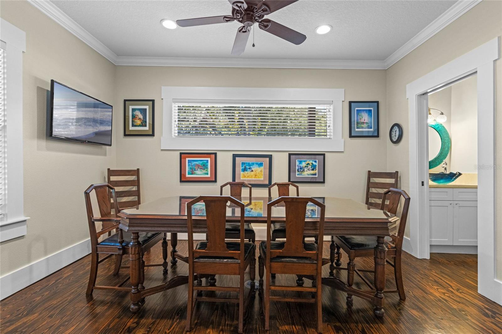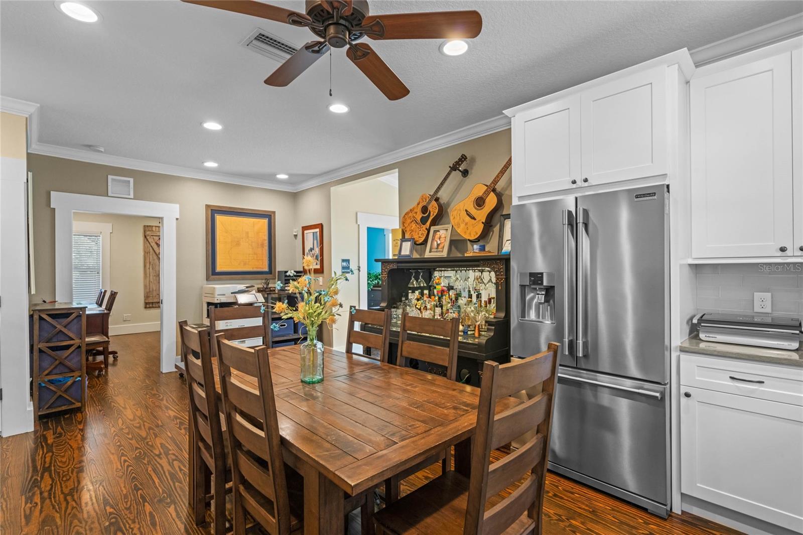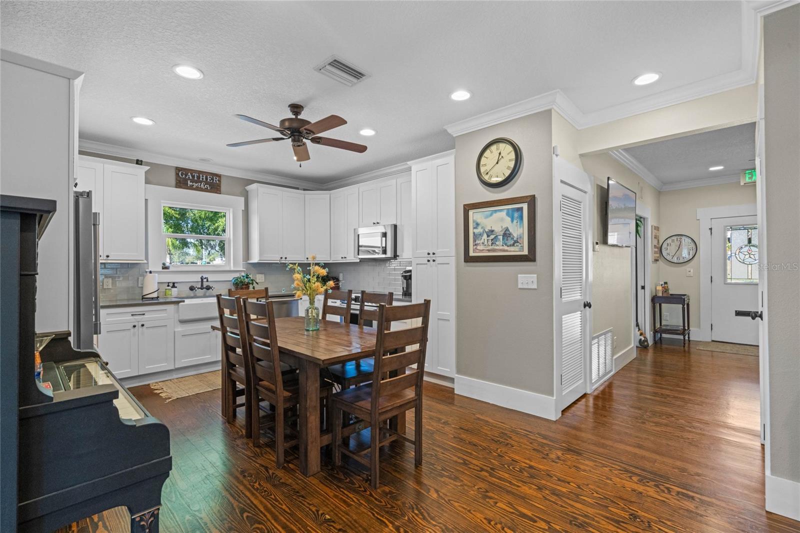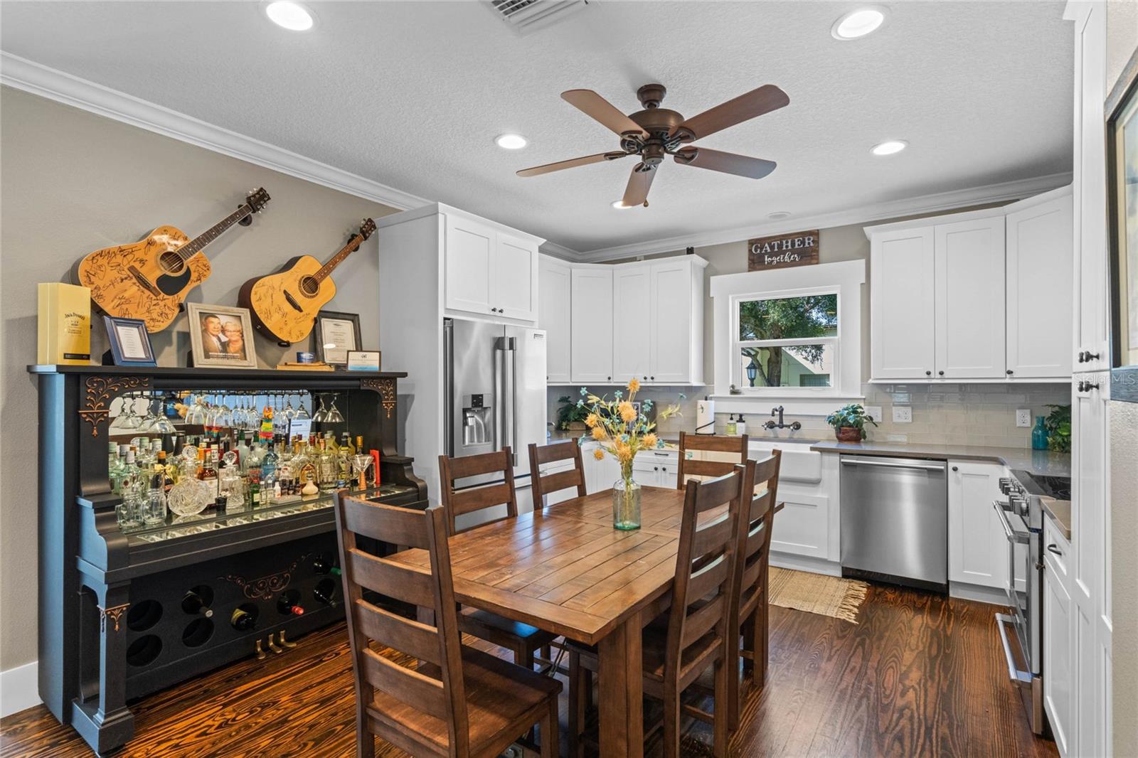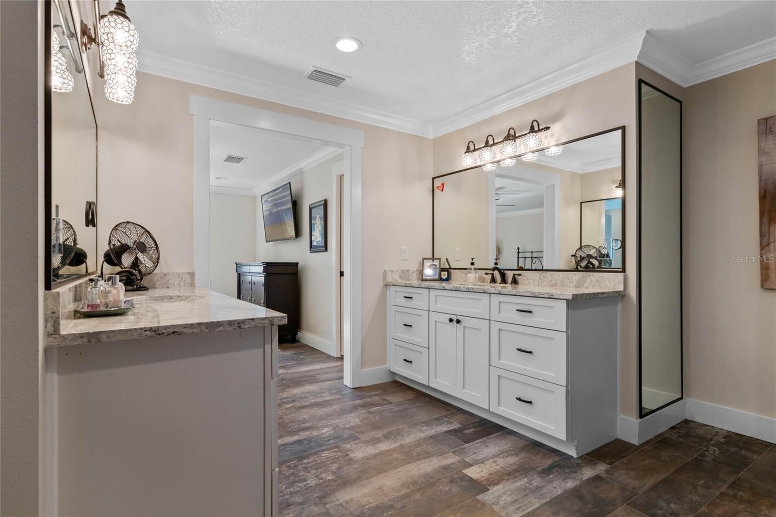 - Ceiling Fans(s), Crown Molding, Eat-in Kitchen, High Ceilings, Kitchen/Family Room Combo, Living Room/Dining Room Combo, Open Floorplan, Primary Bedroom Main Floor, Solid Surface Counters, Solid Wood Cabinets, Split Bedroom, Stone Counters, Thermostat, Walk-In Closet(s)