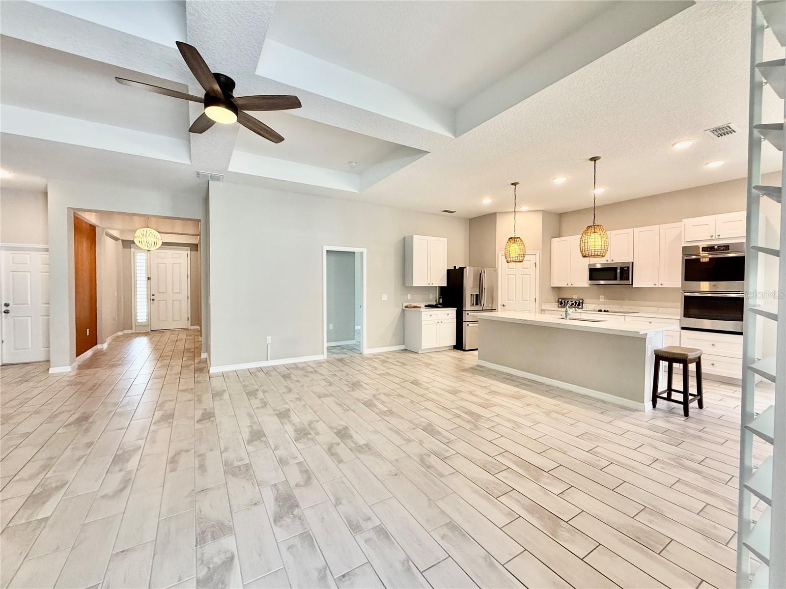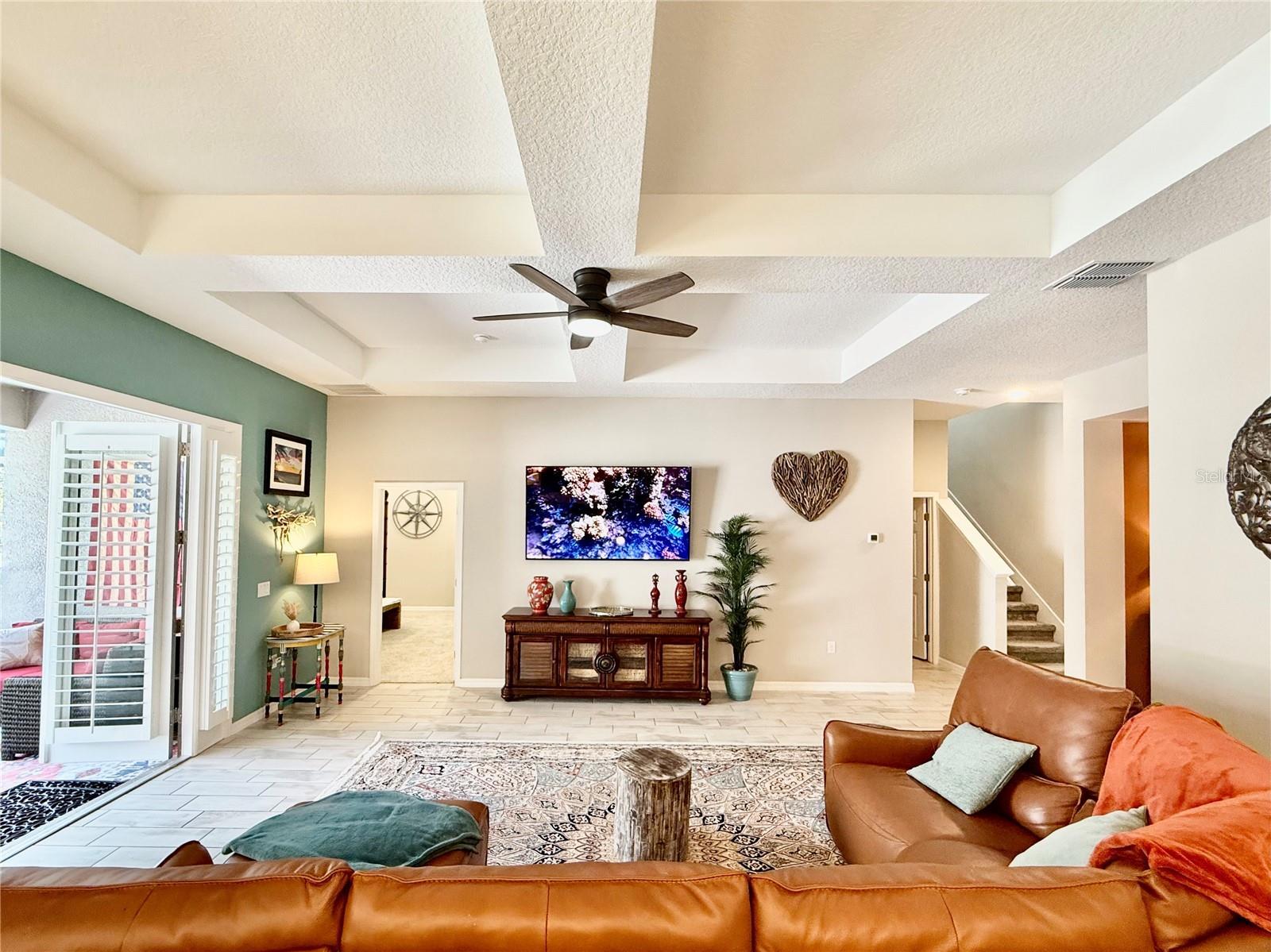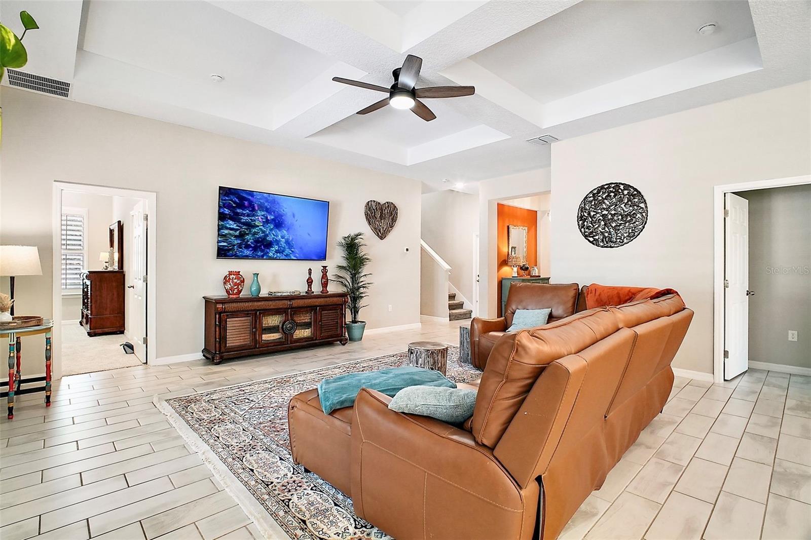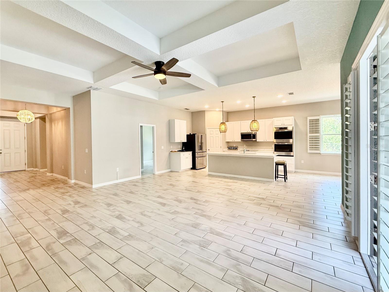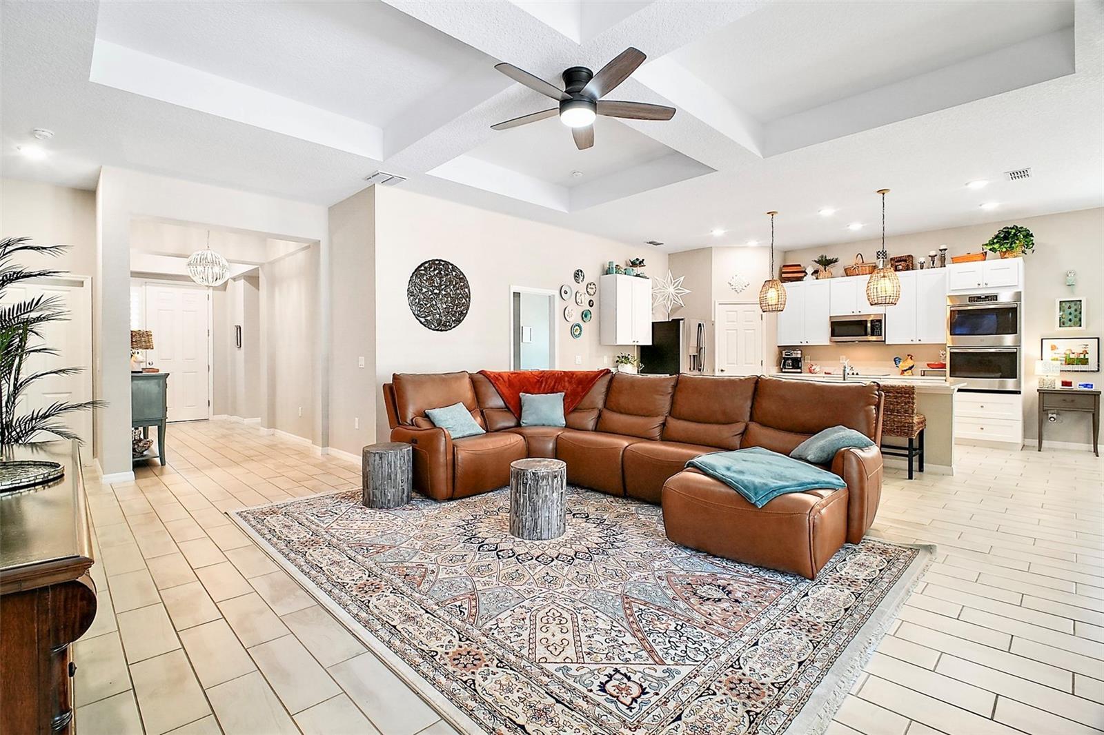 - Ceiling Fans(s), Coffered Ceiling(s), Kitchen/Family Room Combo, Living Room/Dining Room Combo, Open Floorplan, Primary Bedroom Main Floor, Solid Surface Counters, Split Bedroom, Thermostat, Tray Ceiling(s), Walk-In Closet(s)
