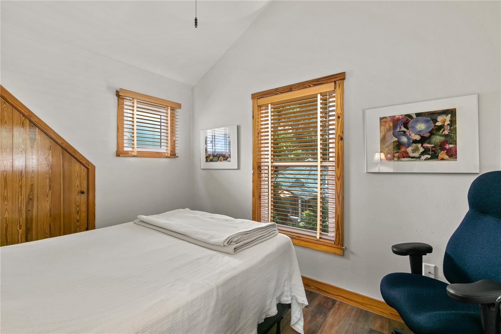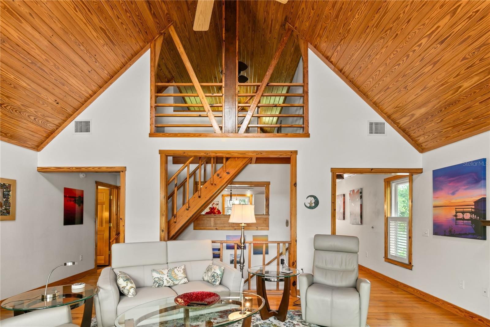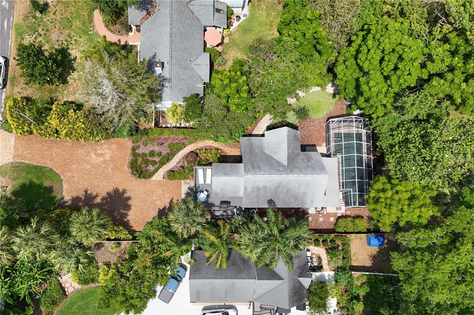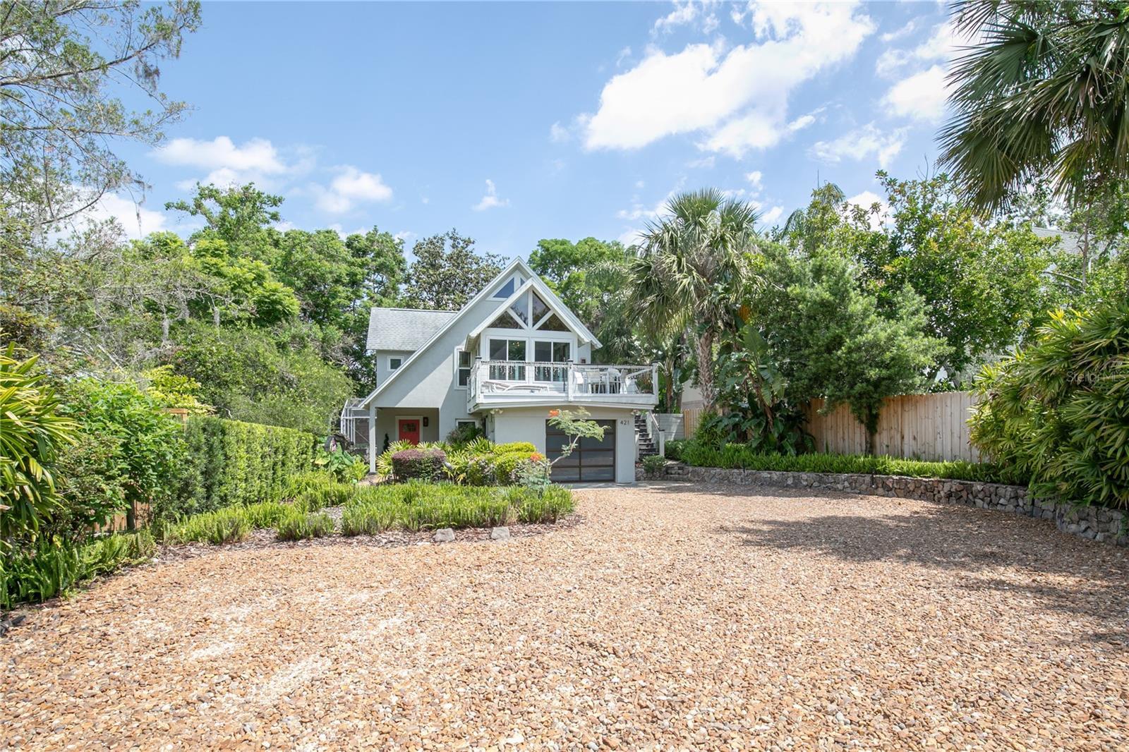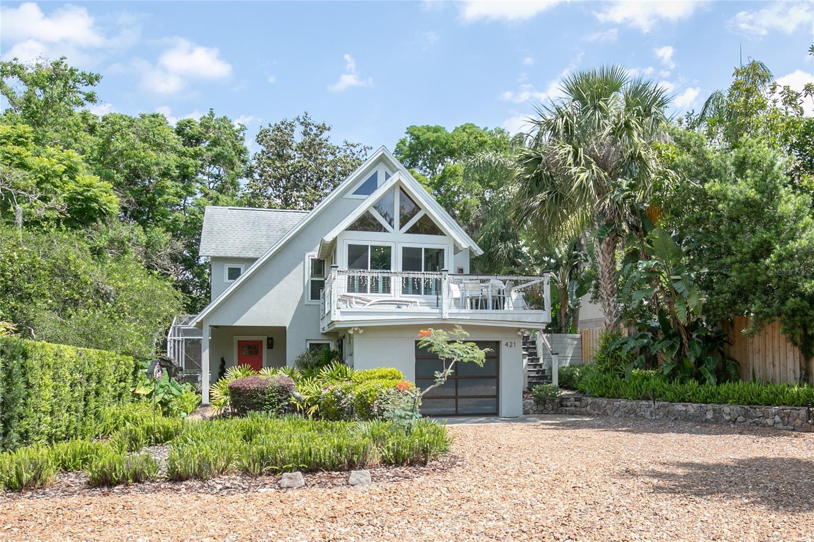 Under contract-accepting backup offers. Discover this treasure on the west side of Donnelly, near downtown Mount Dora. Lots of history and love went into creating this unique pool home, hidden in a very private setting. What started in 1948 as just a garage, the home evolved in the early 1990’s to be a unique custom-built primary home or a hide-a-way retreat second home or rental. What a find... and only a few blocks from downtown! The 2-story home with loft and a guest cottage has tree-top decking overlooking the gardens, with the pleasant sound of the fountain below. Your eye will be delighted by Custom-built cabinetry, shelving, wood floors, trim and ceilings & beams! Detailed craftsmanship & natural materials enhance the home's simple elegance. The unique floor plan offers a spacious primary suite with sky lights & special windows, plus a 3rd bedroom (or a den or office) and a laundry room on the ground level. From the bedroom, step out to the patio and gardens with a path to the pool and a short path winds to the 1/1 guest cottage - a welcoming retreat for family or friends. On the home's second floor, there is a well-planned eat-in kitchen and a cozy 2nd bedroom & bathroom. Living & Dining rooms with vaulted ceilings open to a spacious deck brushed by gentle breezes. High above the living room, a LOFT sparks the imagination - perhaps a studio for art, yoga or music! Throughout the home, natural light pours in through wide windows; picturesque views abound. Most recent updates were: Roofs were replaced in 2017, HVAC in 2019. Also in 2015 windows were replaced with energy-efficient double pane, a tankless hot water system was added, Central AC replaced, & new garage door. . Quartz countertops grace the laundry room and the kitchen. Kitchen features include: Subway tile back splash and stainless steel appliances along with a cozy nook for kitchen dining. The main dining room is surrounded by windows - wood pitched ceiling and a glass French door leading out to the deck. The 1/1 guest house (208sf) has tile floors, a mini-split AC system, a French door and a beautiful walk in shower that would make any guest want to stay. . Being just a few short blocks from downtown & Lake Dora, nearby are parks, lakeside walks and the many delights of historic downtown; walk to gallery openings, cafes and after-dinner concerts. You will love living in Mount Dora, known for its tree-lined streets and year around festivals on the shores of Lake Dora.