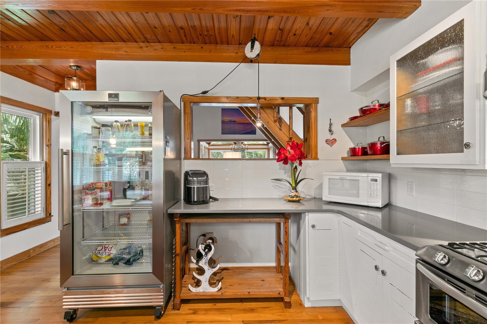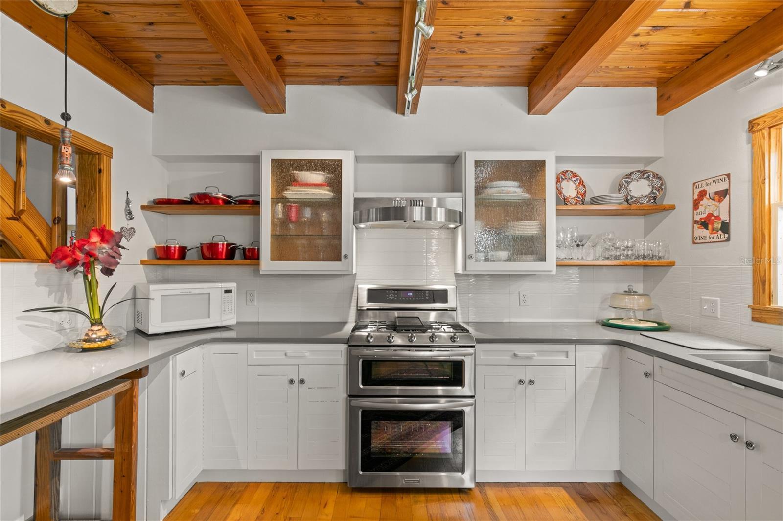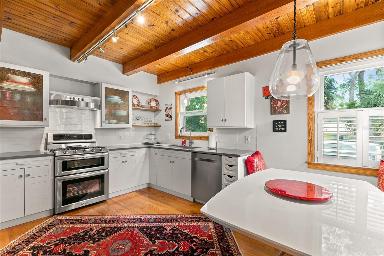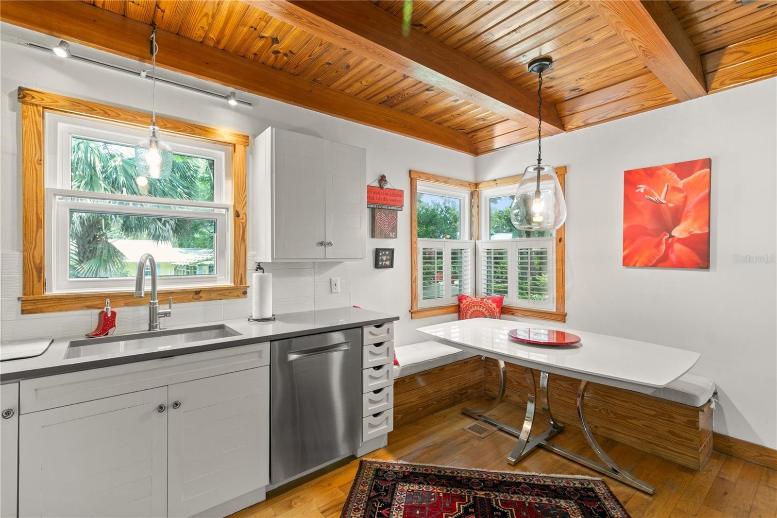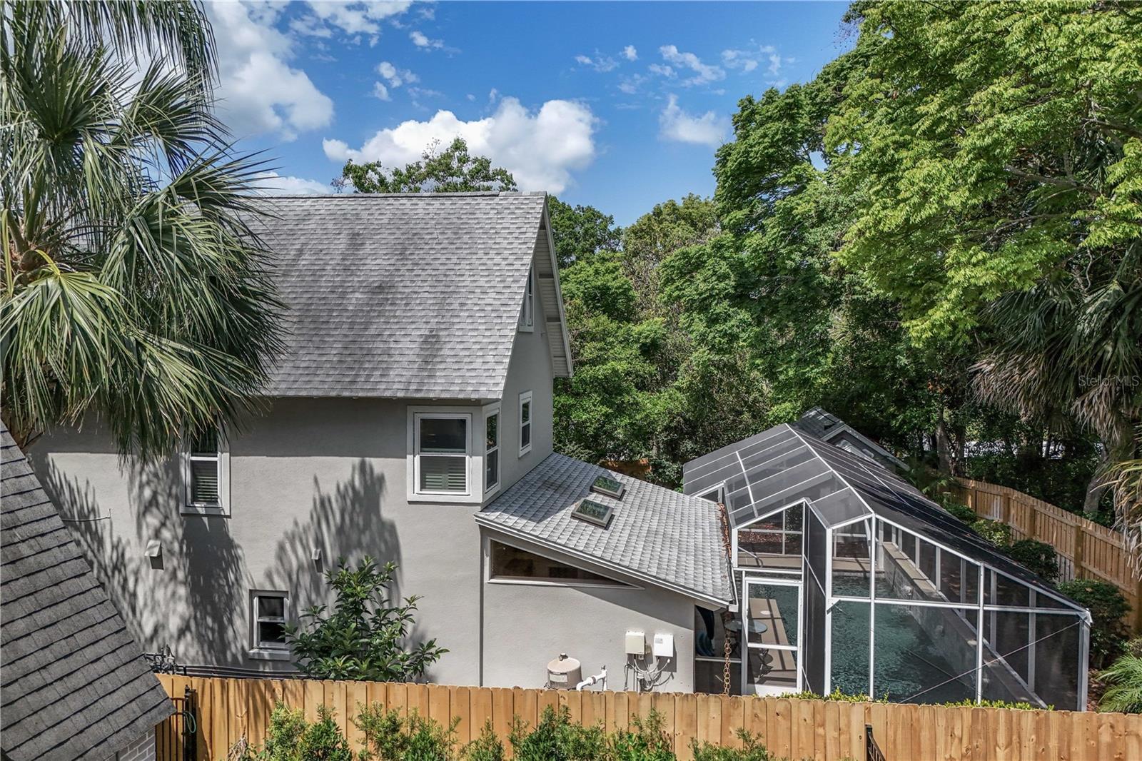 Under contract-accepting backup offers. Discover this treasure on the west side of Donnelly, near downtown Mount Dora. Lots of history and love went into creating this unique pool home, hidden in a very private setting. What started in 1948 as just a garage, the home evolved in the early 1990’s to be a unique custom-built primary home or a hide-a-way retreat second home or rental. What a find... and only a few blocks from downtown! The 2-story home with loft and a guest cottage has tree-top decking overlooking the gardens, with the pleasant sound of the fountain below. Your eye will be delighted by Custom-built cabinetry, shelving, wood floors, trim and ceilings & beams! Detailed craftsmanship & natural materials enhance the home's simple elegance. The unique floor plan offers a spacious primary suite with sky lights & special windows, plus a 3rd bedroom (or a den or office) and a laundry room on the ground level. From the bedroom, step out to the patio and gardens with a path to the pool and a short path winds to the 1/1 guest cottage - a welcoming retreat for family or friends. On the home's second floor, there is a well-planned eat-in kitchen and a cozy 2nd bedroom & bathroom. Living & Dining rooms with vaulted ceilings open to a spacious deck brushed by gentle breezes. High above the living room, a LOFT sparks the imagination - perhaps a studio for art, yoga or music! Throughout the home, natural light pours in through wide windows; picturesque views abound. Most recent updates were: Roofs were replaced in 2017, HVAC in 2019. Also in 2015 windows were replaced with energy-efficient double pane, a tankless hot water system was added, Central AC replaced, & new garage door. . Quartz countertops grace the laundry room and the kitchen. Kitchen features include: Subway tile back splash and stainless steel appliances along with a cozy nook for kitchen dining. The main dining room is surrounded by windows - wood pitched ceiling and a glass French door leading out to the deck. The 1/1 guest house (208sf) has tile floors, a mini-split AC system, a French door and a beautiful walk in shower that would make any guest want to stay. . Being just a few short blocks from downtown & Lake Dora, nearby are parks, lakeside walks and the many delights of historic downtown; walk to gallery openings, cafes and after-dinner concerts. You will love living in Mount Dora, known for its tree-lined streets and year around festivals on the shores of Lake Dora.