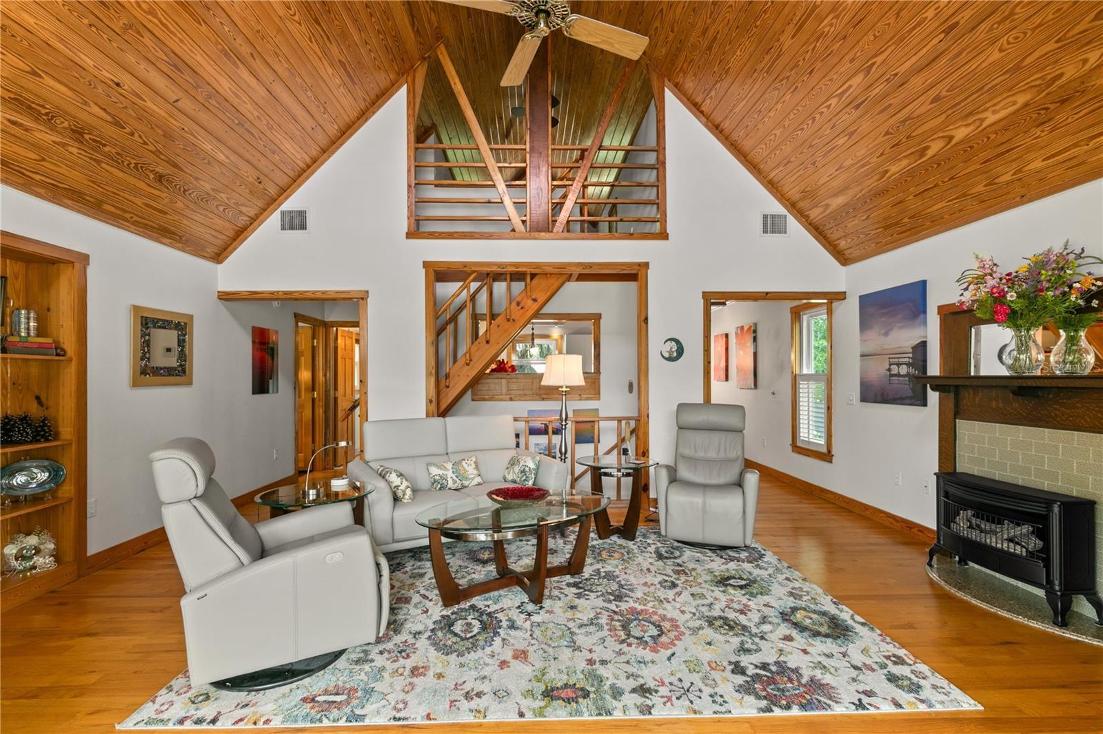 - Built-in Features, Cathedral Ceiling(s), Ceiling Fans(s), Eat-in Kitchen, High Ceilings, Primary Bedroom Main Floor, Solid Wood Cabinets, Split Bedroom, Stone Counters, Vaulted Ceiling(s), Walk-In Closet(s)