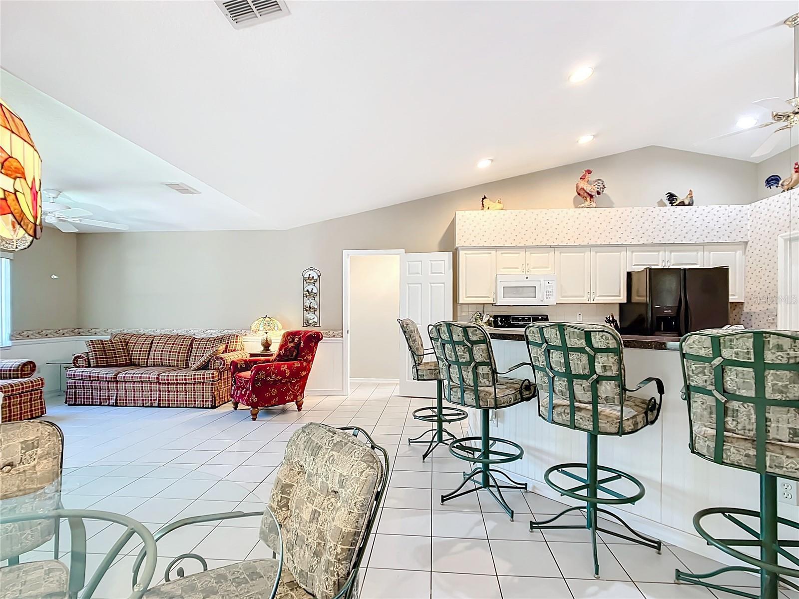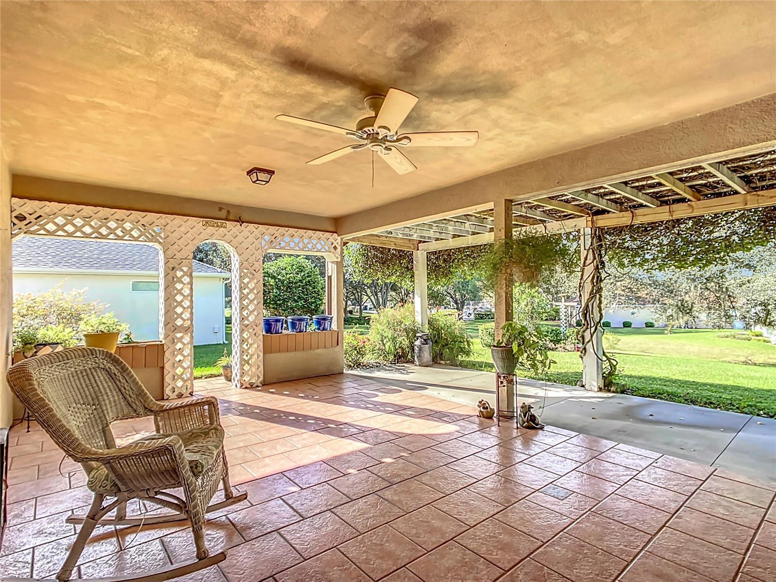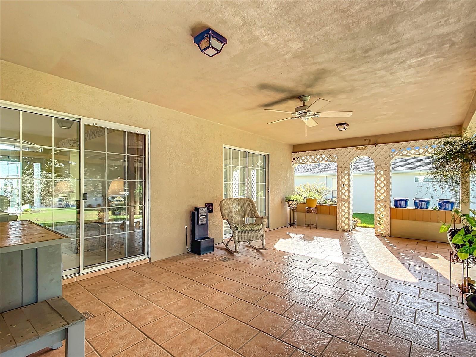 Lovely stucco 3 bedroom/2 bath, ASPEN style home in TURNBERRY at the gorgeous Del Webb's Spruce Creek Golf & Country Club, an exclusive, 55+, 1604 acre, 24-hour manned gate, golf-cart community just 15 miles south of Ocala and easy drive to Orlando. Situated on a .27 acre lot with distance between neighbors and .02 mile to the 32,000 sq ft Horizon clubhouse with LARGE POOL and JACUZZI. State-of-the-art FITNESS CENTER includes an indoor pool and second outdoor pool located at Peninsula. Property also includes 36 holes on multi-tee championship golf course (271 acres) designed by Terry Ross. Leaded glass front door with side panels opens into a tiled foyer with vaulted ceiling in living/dining/kitchen area. Kitchen has a breakfast nook and bar with 4 stools, tiled floor, recessed lights, French-door refrigerator, pantry closet, door to the laundry room through to garage and slider to the West facing open-air tiled floor lanai with extended jasmine covered arbor. Primary bedroom overlooks the lanai and has 2 walk-in closets, a soaking garden-style tub, separate glass enclosed shower, linen closet and tiled floor. Guest bedrooms are both comfortable sizes with a shared tiled bath that has a tub/shower combo, linen closet and a window. The third bedroom has its own entrance to the garage and exterior door access. Original owners replaced HVAC in 2017 (Rheem), ROOF 2022, gas WATER HEATER 2012, Hunter IRRIGATION system. 4 Point and Mitigation Reports available upon request. Windows have grilles between double pane glass and ceiling fans throughout. Over 70 clubs, monthly print and online magazine (The Fountain) with schedule and calendar of events. The Villages’ Spanish Springs Square is close by, so you can enjoy shopping, restaurant and free nightly outdoor bands/entertainment. Urgent Care is a golf cart ride away and the Villages Hospital and a plethora of medical offices, restaurants, stores and the Marion Market are close too. On-site RV and boat storage. Don't miss out! Call today for your private viewing! Some personal items in photos are to be removed by owner. 3 month minimum for rentals.