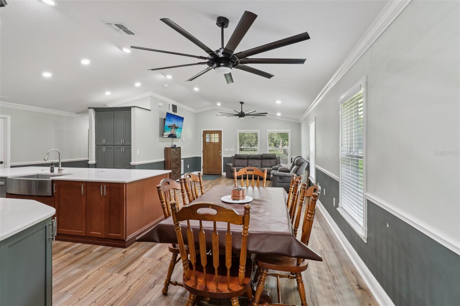- Ceiling Fans(s), Chair Rail, Crown Molding, Eat-in Kitchen, Kitchen/Family Room Combo, Open Floorplan, Primary Bedroom Main Floor, Solid Surface Counters, Solid Wood Cabinets, Vaulted Ceiling(s), Window Treatments