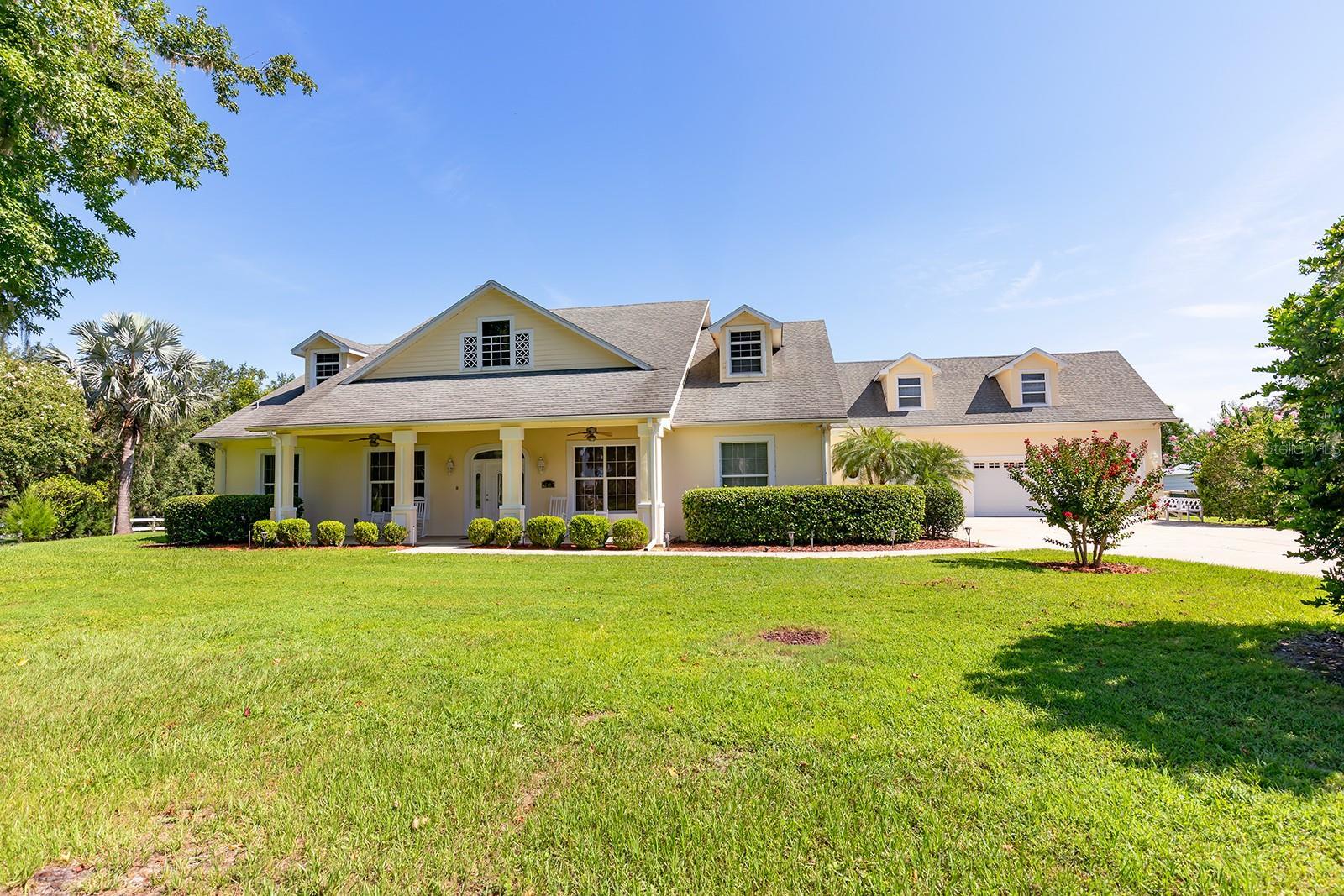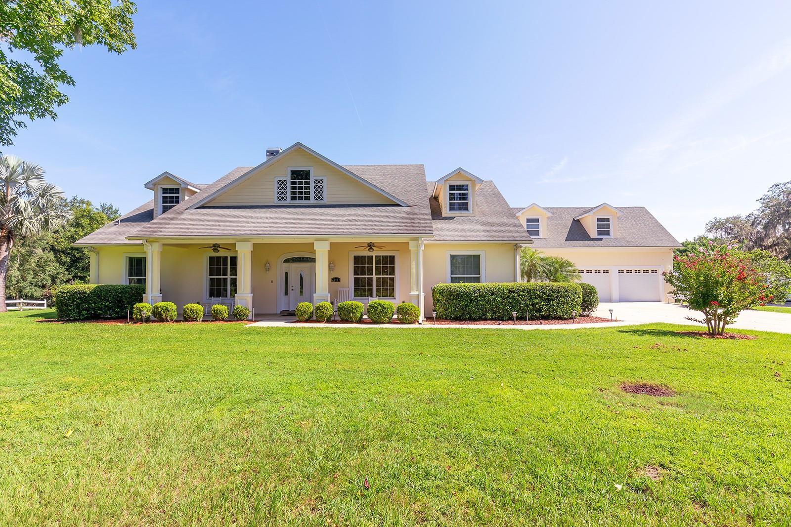 Tucked away on over two pristine waterfront acres along the crystal-clear, spring-fed waters of 90-acre Lake Crescent, this custom-built architectural masterpiece offers more than 5,000 square feet of luxurious living space. Inside this stunning 4-bedroom, 3.5-bath concrete block and Hardee board home, you’ll be greeted by timeless elegance. Ten-foot ceilings, tray ceilings in the master and dining room, crown molding, graceful arches and columns, and rich cherry flooring all contribute to the home's refined character. The spacious den features a cozy wood and gas-burning fireplace with custom brickwork—perfect for gathering with family or unwinding after a long day. The chef’s kitchen is a culinary dream, boasting cherry cabinetry, a center island, brick tile detailing, and a bright, welcoming breakfast nook. Just off the kitchen, a screened back porch opens to a complete summer kitchen outfitted with a gas cooktop, microwave, refrigerator, Corian countertops, sink, garbage disposal, and more—ideal for entertaining while enjoying lake breezes. The luxurious master suite provides a private retreat with two cedar-lined walk-in closets and a spa-inspired bath featuring a Jacuzzi tub, dual vanities, a separate shower, bidet, and private toilet. Upstairs, a versatile bonus room awaits, designed with a studio kitchen, half bath, and four walk-in dormers—perfect as a home office, guest quarters, movie room, or creative space. This home is equipped with PGT insulated hurricane windows, two A/C units, and both gas and electric water heaters. Additional conveniences include a full alarm system, irrigation system, and a three-car garage with heating, cooling, built-in shelving, and worktops. The estate also features two steel barns and a two-bay pole barn, complete with electric, water, and security lighting—ideal for hobbies, storage, or future projects. Enjoy your days boating, fishing, paddleboarding, or kayaking right from your shoreline, and spend your evenings soaking in breathtaking sunsets over Lake Crescent. This one-of-a-kind property offers serene lakefront living in a private setting, with easy access to nearby amenities. Come experience the unmatched beauty, thoughtful design, and custom craftsmanship that make this home truly unforgettable. Once you visit, you’ll never want to leave.