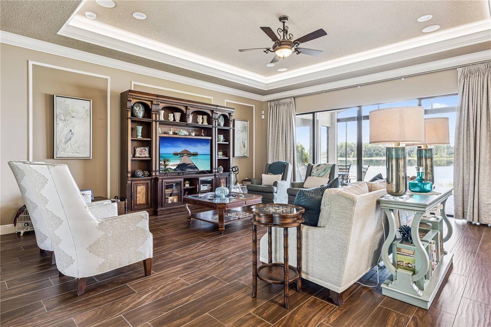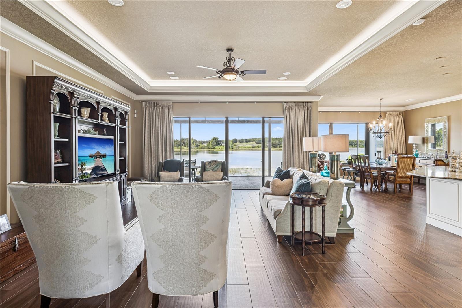 - Built-in Features, Ceiling Fans(s), Coffered Ceiling(s), Crown Molding, High Ceilings, Kitchen/Family Room Combo, Open Floorplan, Split Bedroom, Stone Counters, Thermostat, Tray Ceiling(s), Walk-In Closet(s), Window Treatments