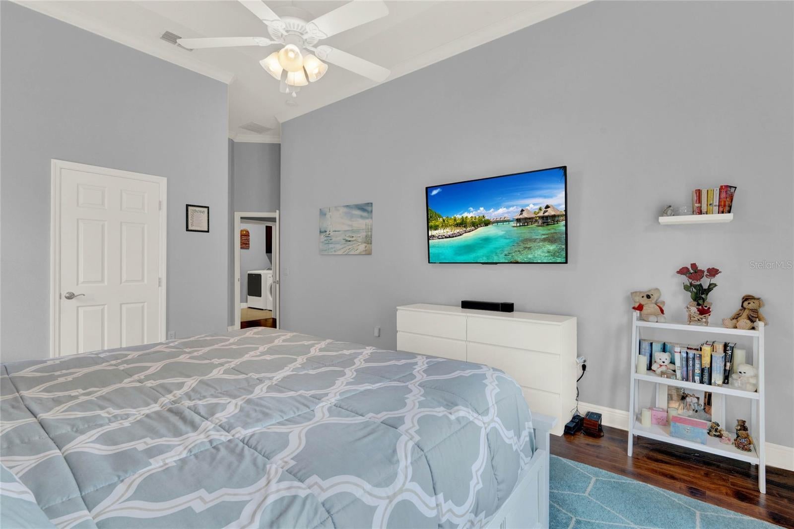 - Cathedral Ceiling(s), Ceiling Fans(s), Crown Molding, Eat-in Kitchen, High Ceilings, Kitchen/Family Room Combo, L Dining, Open Floorplan, Primary Bedroom Main Floor, Solid Surface Counters, Solid Wood Cabinets, Split Bedroom, Stone Counters, Thermostat, Walk-In Closet(s)