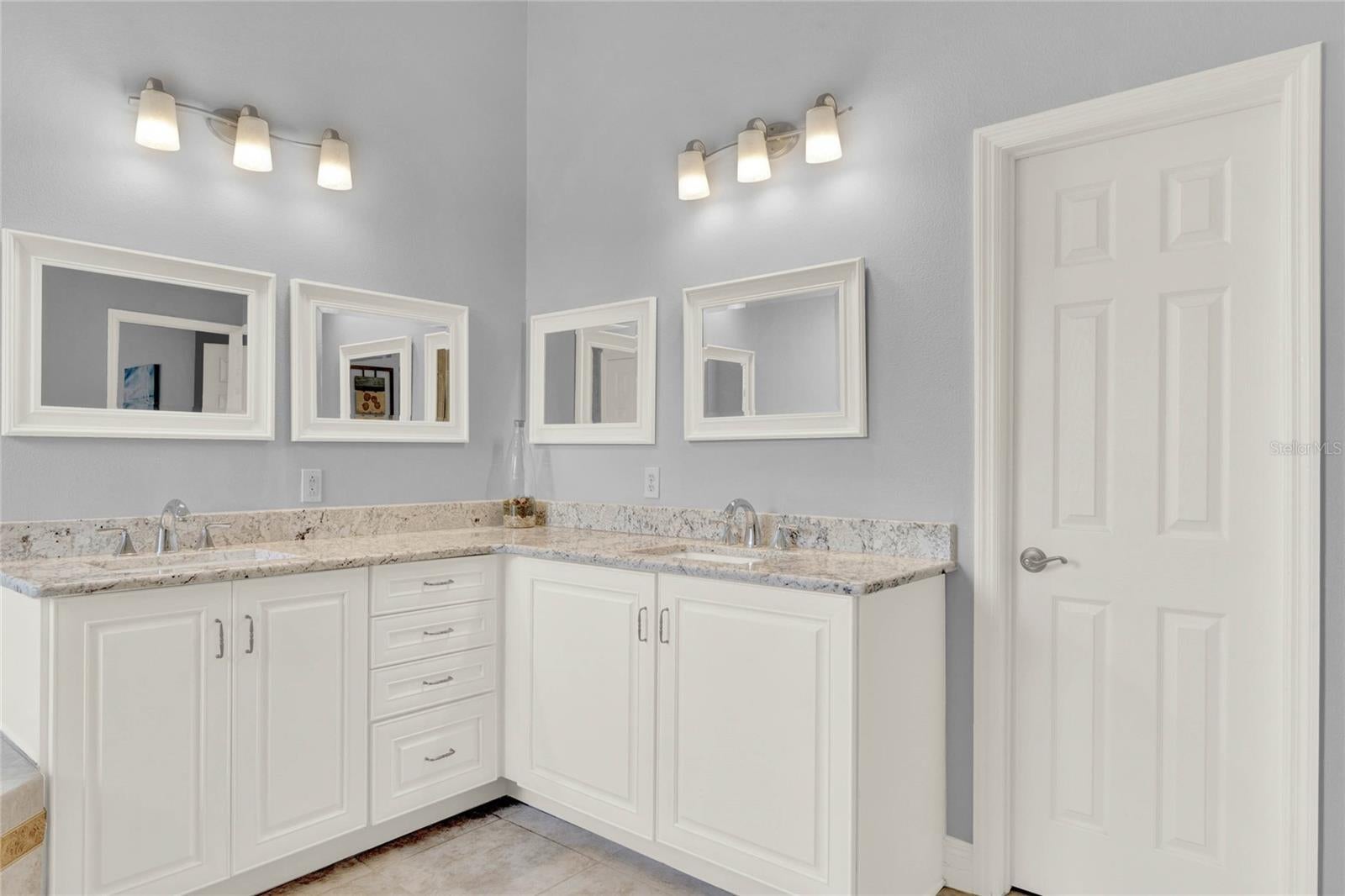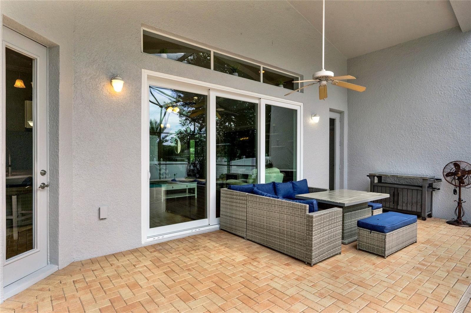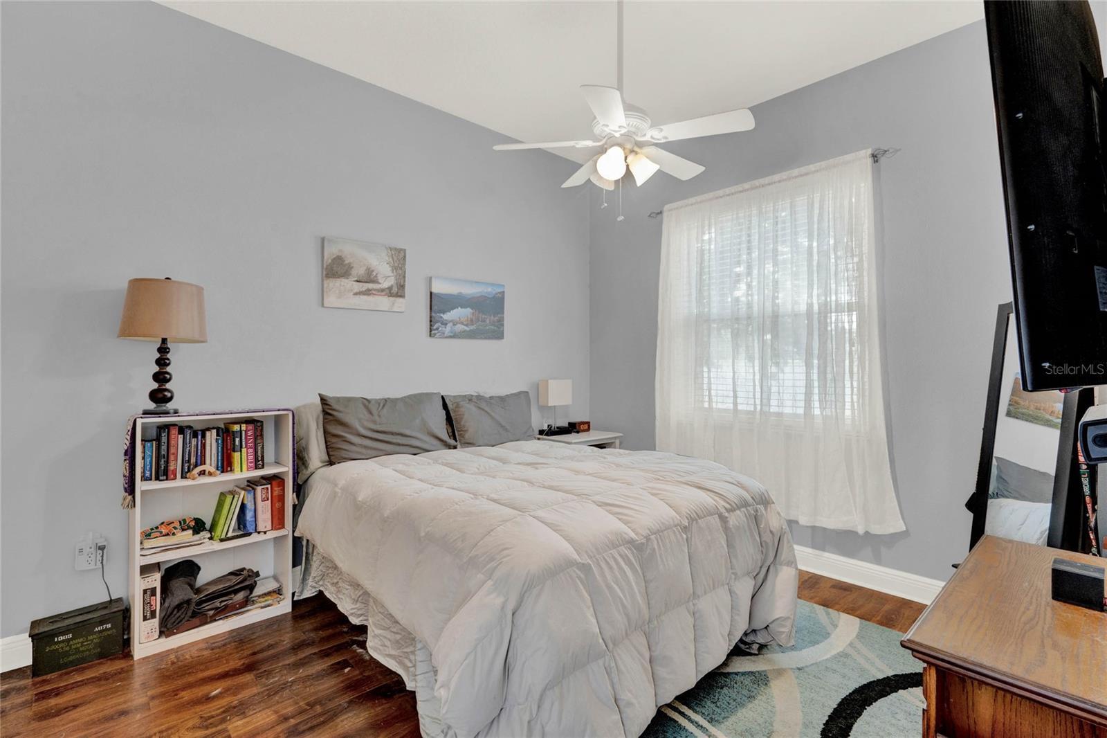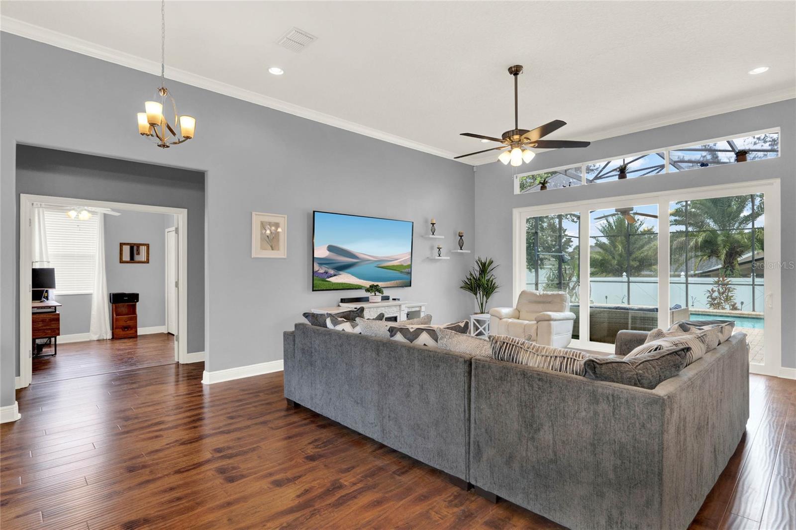 Welcome to this beautifully maintained, move-in ready 4-bedroom, 2-bathroom pool home located in the gated community of Hartwood Reserve. Offering 2,247 square feet of stylish and comfortable living space, this home is better than new with thoughtful updates throughout. As you approach, you’re greeted by large double doors on a charming covered front porch, and once inside, wood-look ceramic tile floors, crown molding, and soaring ceilings create a warm, elegant feel. Natural light pours in through 8-foot sliding glass doors, drawing your eyes straight out to the expansive screened-in pool patio—perfect for swimming, dining, relaxing, and entertaining year-round. The open-concept layout includes a beautifully updated kitchen with quartz counter tops, gas range, tile back splash, a newer refrigerator, dishwasher and microwave (2024), and a cozy breakfast nook, plus formal dining, and space for casual meals in front of the TV. The split-bedroom floor plan offers privacy, with the spacious primary suite featuring an ensuite bath with dual sinks, granite counters, a soaking tub, separate shower, and private water closet. The 2nd and 3rd bedrooms share a hall bath, while the 4th bedroom is ideal as an office, guest room, or playroom. A laundry room with storage and a mop sink adds convenience, and the vinyl-fenced backyard gives pets a safe place to run. Updates include roof (2021), HVAC (2025), kitchen (2022), flooring (2017), windows (2023), pool pump and salt cell (2024), solar heat for the pool (2020). With a newly painted exterior and plenty of indoor and outdoor space, this home truly offers the best of Florida living.