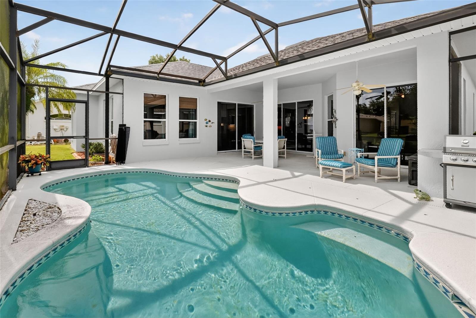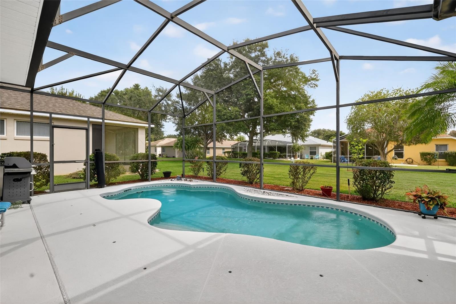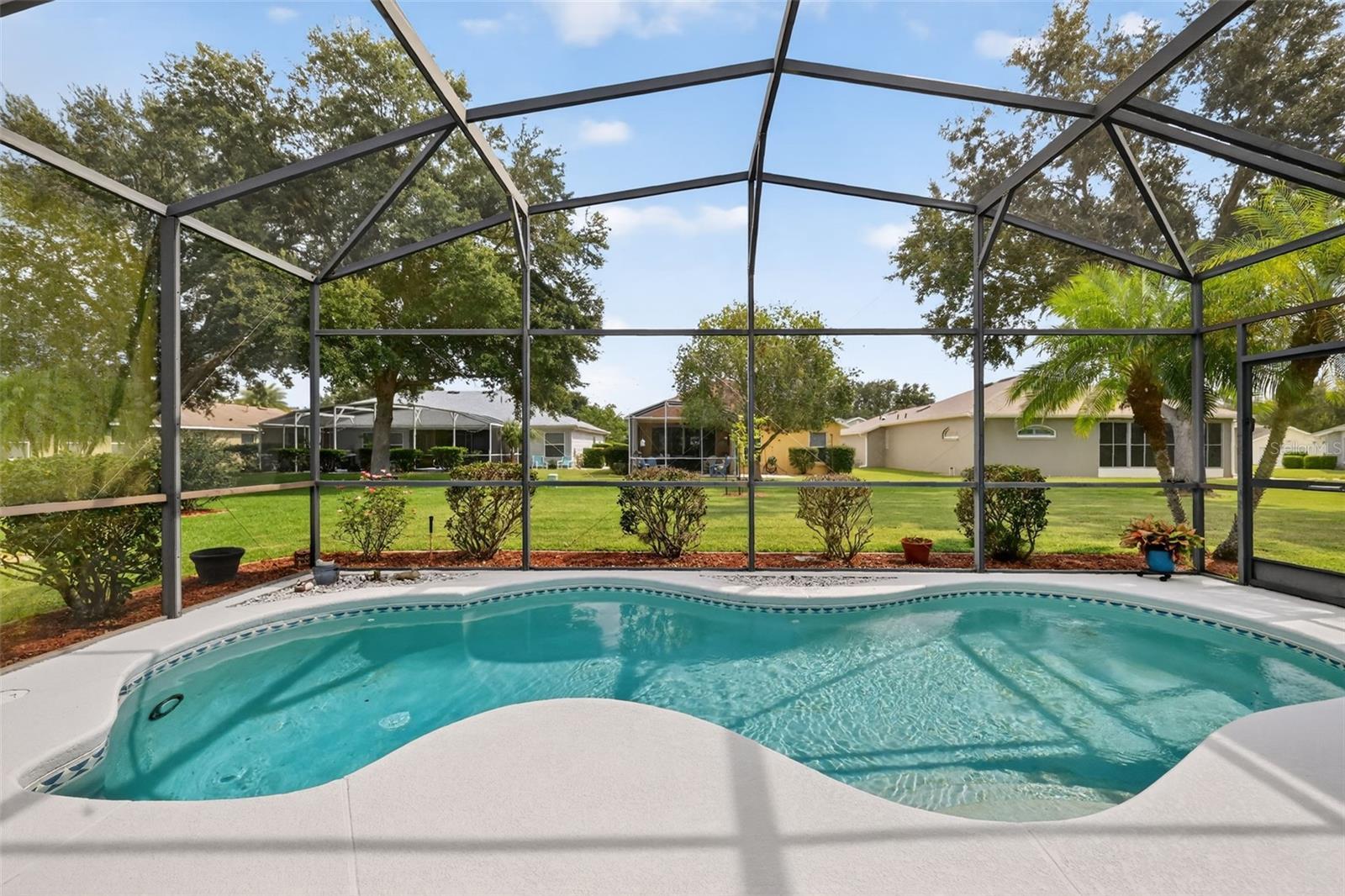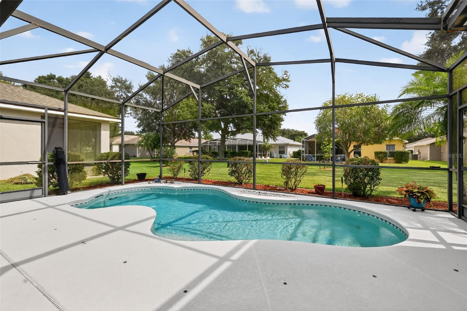 Welcome to this beautifully landscaped Scarsborough model pool home with a golf cart garage, perfectly situated in the desirable 55+ Royal Highlands community with guarded entry. Designed for both comfort and style, this 3-bedroom, 2-bath residence offers a formal living and dining room, a spacious family room, and an open split-bedroom layout filled with natural light. The remodeled kitchen (2017) is a true highlight, featuring 42” cabinetry, granite counters, gas range, closet pantry, built-in microwave, breakfast bar, and a cheerful breakfast nook. The handicap-accessible primary suite boasts two generous walk-in closets and a spa-like bath with a jetted tub, walk-in shower with grab bar, and linen closet. Enjoy year-round Florida living with your screen-enclosed, heated swimming pool—updated with all new equipment just two years ago—and freshly painted pool deck (2023). Roof (2015), A/C & furnace (2011) with Aprilaire HEPA filter, Radiant barrier, transferable termite bond, and approximately 80 sq. ft. of floored attic storage. The home also includes an interior laundry with utility sink, washer/dryer (gas dryer added 2017), high ceilings in the living and family rooms, and a sliding screen door on the two + golf cart garage. Royal Highlands is a premier, resident-owned community offering two pools (indoor & outdoor), an 18-hole golf course, restaurant, pro shop, tennis & pickleball, softball, billiards, fitness center, and a grand recreation hall for concerts, plays, and social events. HOA fee includes cable, internet, and secure RV/boat storage.