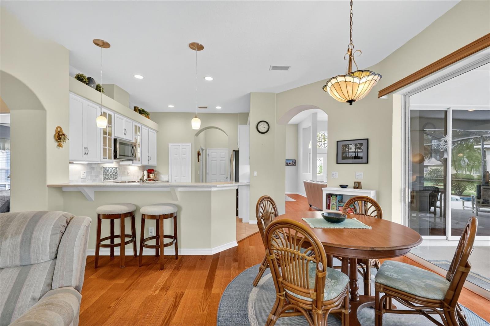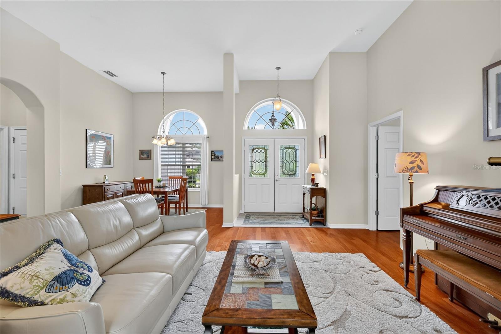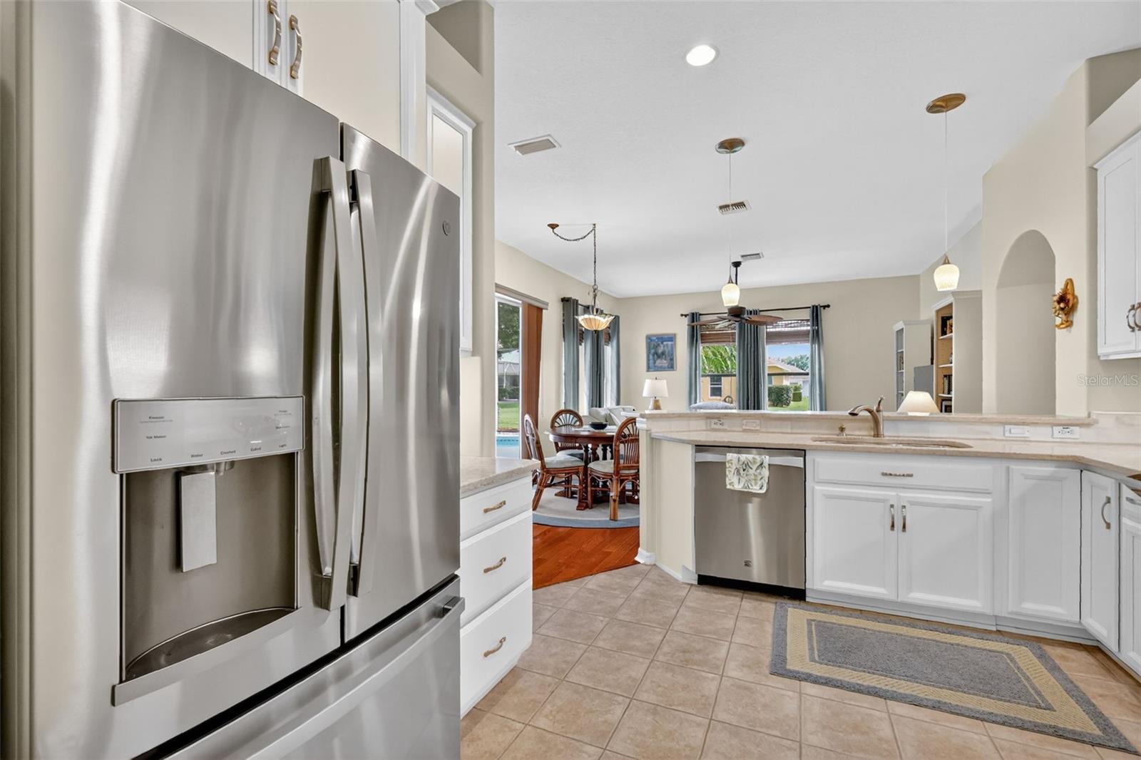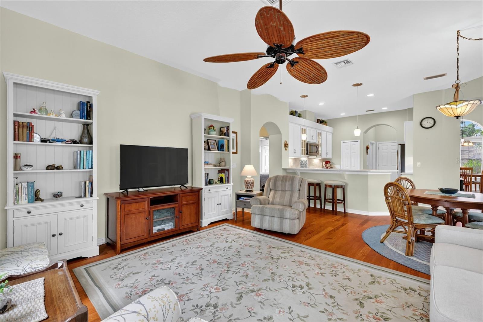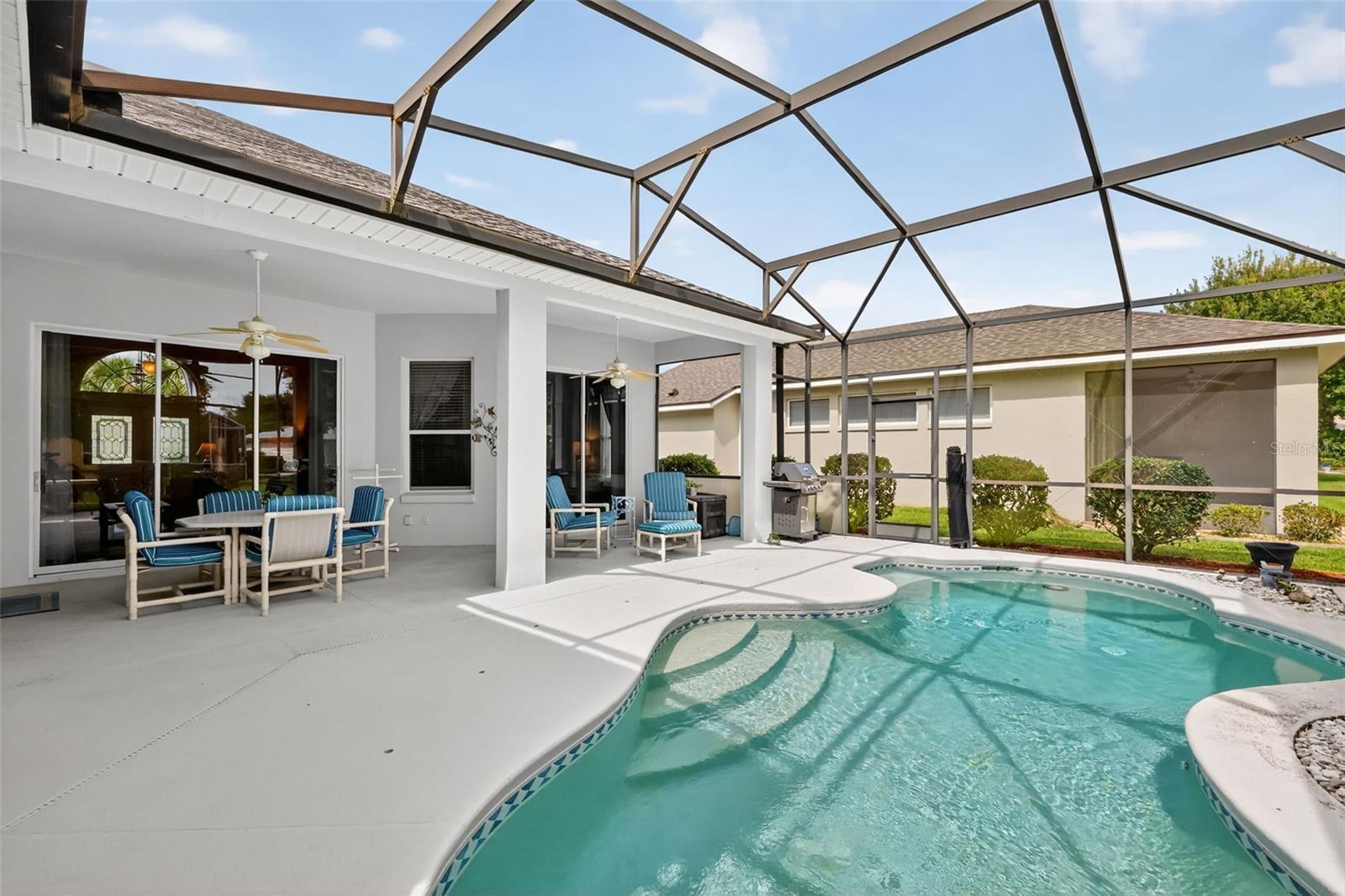 Welcome to this beautifully landscaped Scarsborough model pool home with a golf cart garage, perfectly situated in the desirable 55+ Royal Highlands community with guarded entry. Designed for both comfort and style, this 3-bedroom, 2-bath residence offers a formal living and dining room, a spacious family room, and an open split-bedroom layout filled with natural light. The remodeled kitchen (2017) is a true highlight, featuring 42” cabinetry, granite counters, gas range, closet pantry, built-in microwave, breakfast bar, and a cheerful breakfast nook. The handicap-accessible primary suite boasts two generous walk-in closets and a spa-like bath with a jetted tub, walk-in shower with grab bar, and linen closet. Enjoy year-round Florida living with your screen-enclosed, heated swimming pool—updated with all new equipment just two years ago—and freshly painted pool deck (2023). Roof (2015), A/C & furnace (2011) with Aprilaire HEPA filter, Radiant barrier, transferable termite bond, and approximately 80 sq. ft. of floored attic storage. The home also includes an interior laundry with utility sink, washer/dryer (gas dryer added 2017), high ceilings in the living and family rooms, and a sliding screen door on the two + golf cart garage. Royal Highlands is a premier, resident-owned community offering two pools (indoor & outdoor), an 18-hole golf course, restaurant, pro shop, tennis & pickleball, softball, billiards, fitness center, and a grand recreation hall for concerts, plays, and social events. HOA fee includes cable, internet, and secure RV/boat storage.