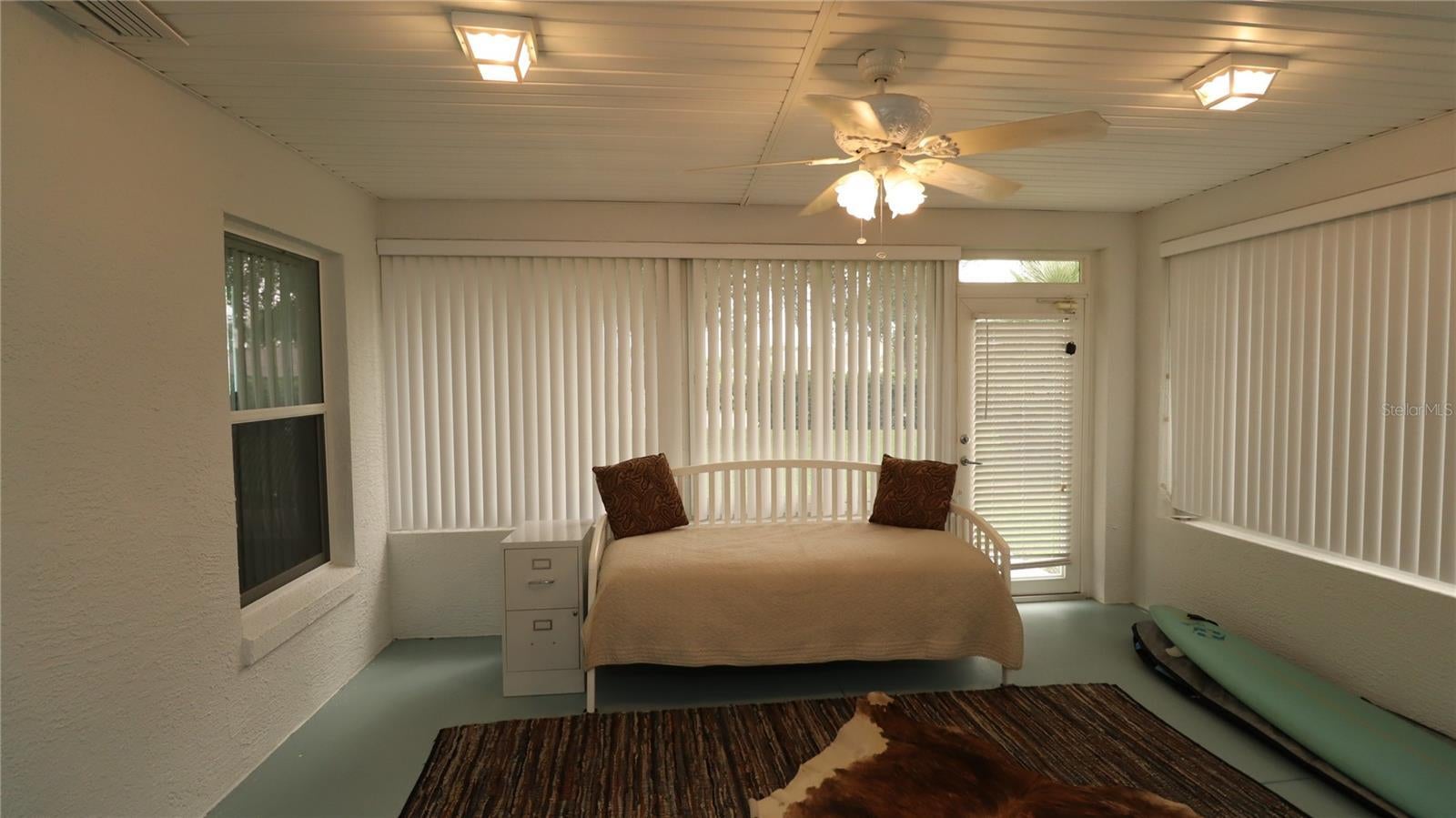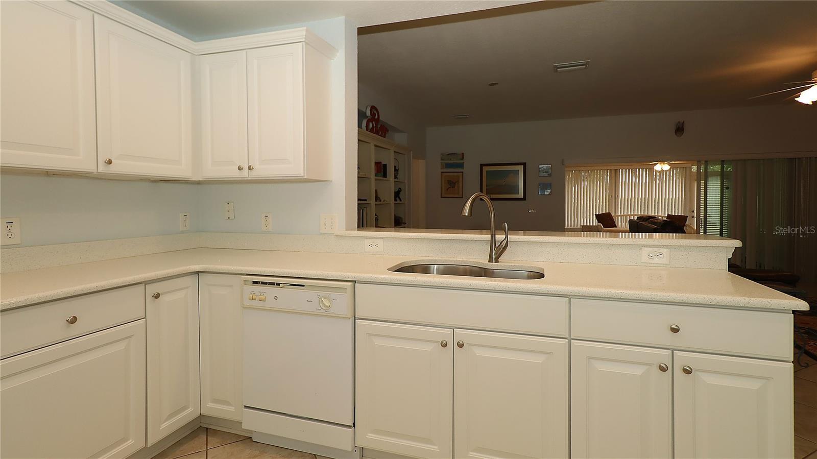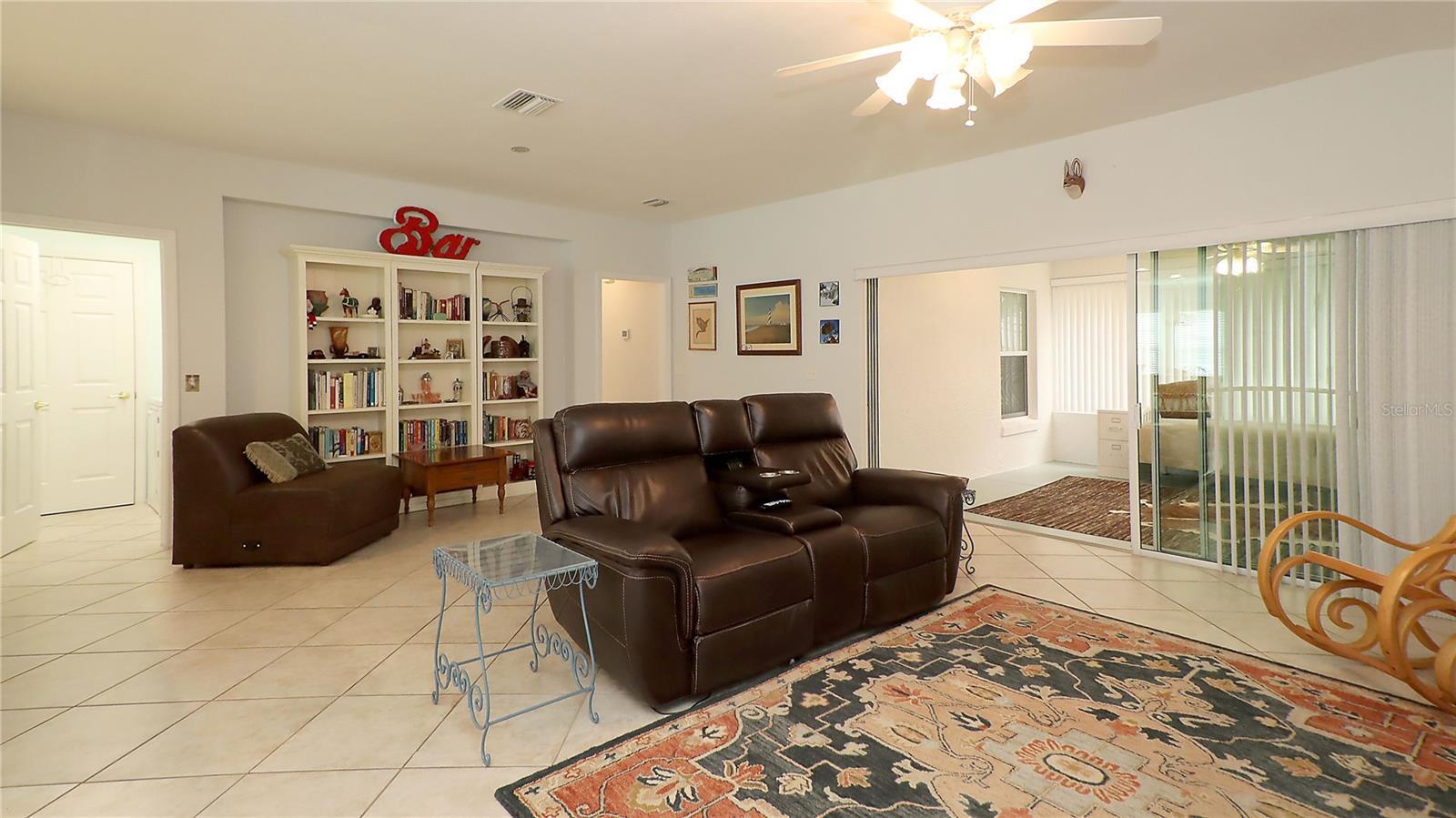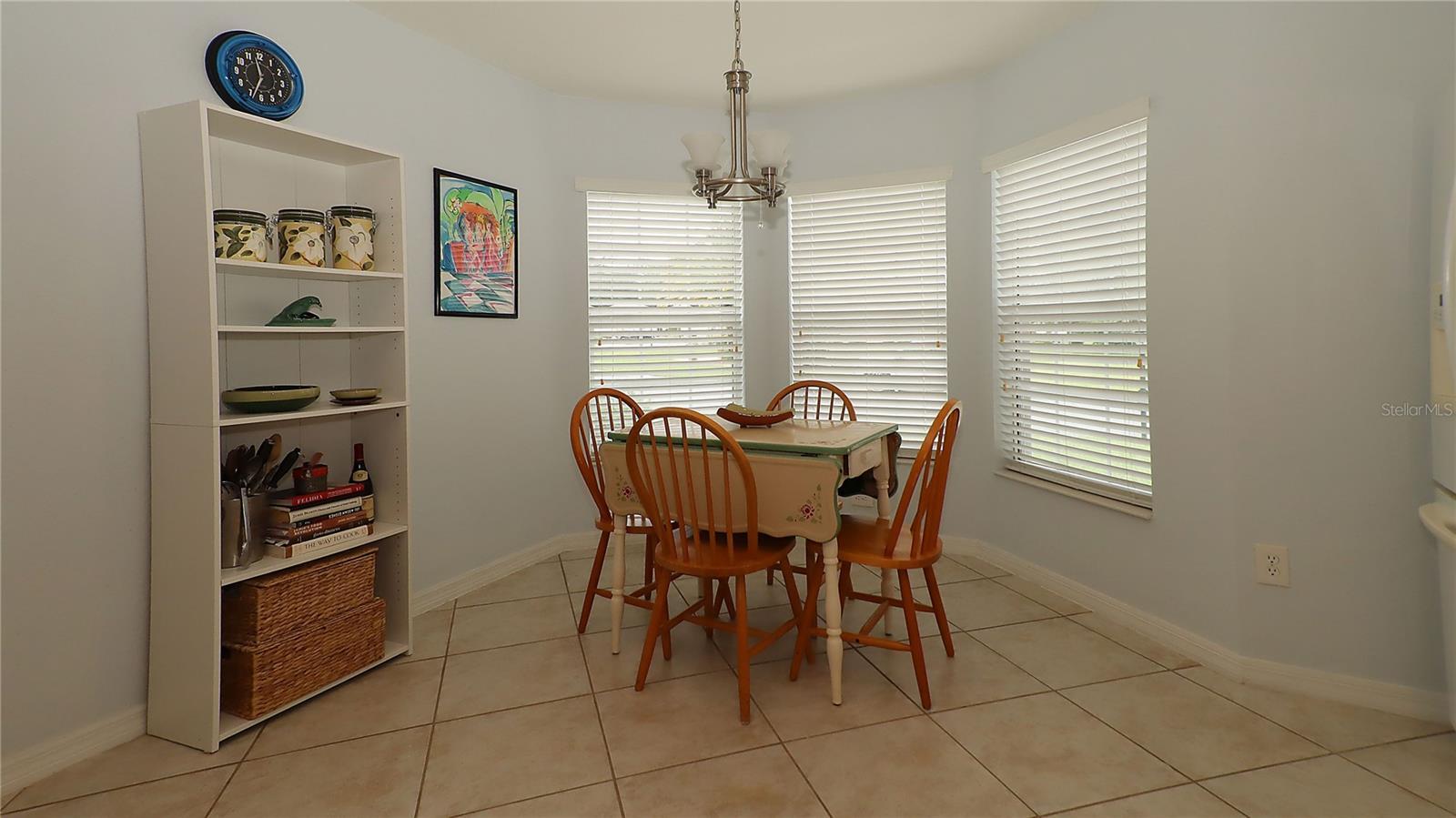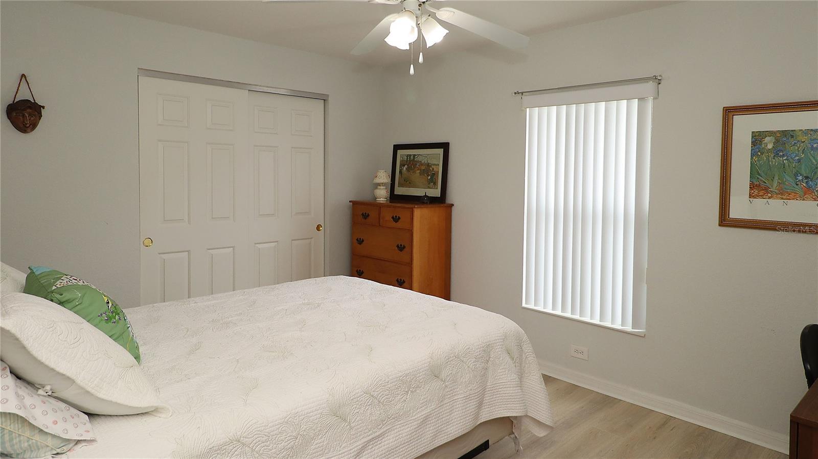 This is a great way to start enjoying the awesome snowbird season in Florida. This concrete block and stucco, 2/2/2 Challedon model fills the bill. Not too big and not too small. Located close to the back gate with access to CR 25. Great front eat-in kitchen with bay window built specifically to house the breakfast table and enjoy watching the world go by. Large double door pantry, Quartz countertops and large bowl sink. Upgraded appliances. Combination living/dining room and is flexible enough to accommodate your needs and wants. Use it as a dining room or as this homeowner is doing, use it as a reading nook. Inside laundry complete with washer and dryer and upper storage cabinetry. Large primary suite (laminate flooring) with en-suite bath (ceramic tile) featuring double raised vanity, large step-in shower, water closet and walk-in closet. Guest room also features laminate flooring. Guest bath has shower/tub combo, raised toilet and raised single sink vanity. Enclosed climate controlled lanai with great eastern exposure with vertical blinds for privacy. Two-car garage has privacy screens and keyless entry. This home has been re-piped in the ceiling and side walls. HVAC 2018. Shingles, gutters and downspouts 2021. Exterior painted 2020. Lots of activities in this community. One can do as much as you want or nothing at all. Completely up to you. Check out our Community Center, Restaurant (Liberty Grill) and the Pro Shop (4 - 9 hole golf courses). Three heated swimming pools, fitness center, pickleball, tennis, softball, bocce, shuffleboard and so much more. Walking trails, sidewalks and dog park. Make this home today.