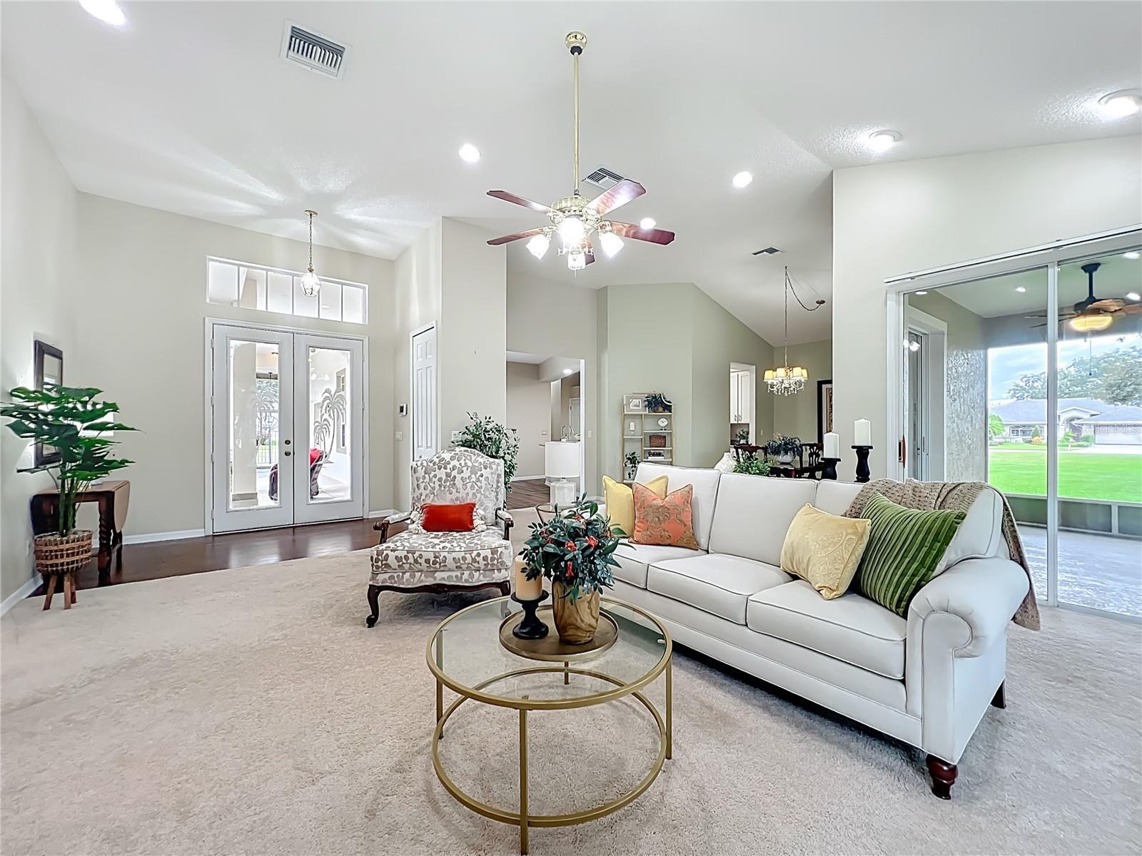 BRAND NEW ROOF!!!! Welcome to Royal Highlands! This stunning 3-bedroom, 3-bath “DUKE” model is one of the community’s most desirable floor plans—complete with a private Casita! Nestled on a quiet cul-de-sac with peaceful views of Royal Lake, this home offers resort-style living with your very own screened-in swimming pool and access to exceptional community amenities. The separate Casita suite is perfect for guests or extended family, featuring a private entrance from the pool deck, a full bathroom, walk-in closet, and Murphy bed. Step inside the main home and be greeted by soaring ceilings, abundant natural light, and an open, split floor plan designed for both comfort and privacy. The primary suite is a true retreat, offering French doors to the pool area, walk-in closet, and a spa-like en-suite bathroom with dual vanities, a soaking tub, and a walk-in shower. The spacious eat-in kitchen is perfect for entertaining—complete with granite countertops, shaker-style cabinetry, stainless steel appliances, and a bright dinette overlooking the pool. Additional features include a formal living/dining combo, a large guest bedroom with a walk-in closet, a third full bathroom, and an inside laundry room leading to a 2-car garage with a dedicated workspace. Enjoy peace of mind knowing a brand-new roof was just installed, and the AC system (2020) includes a 3-zone thermostat for year-round comfort. The gas water heater was replaced in 2023. Recent 4-point inspection available for review. Located in the gated Royal Highlands community, residents enjoy world-class amenities including the Monarch Golf Club, restaurant and pro shop, softball field, indoor and outdoor pools, four lakes, nature trails, tennis, pickle ball, corn hole, and countless social clubs and activities. Experience the best of Florida living—a spacious pool home with lake views, a private guest suite, and a vibrant community lifestyle, all in one. Call today for your private tour!