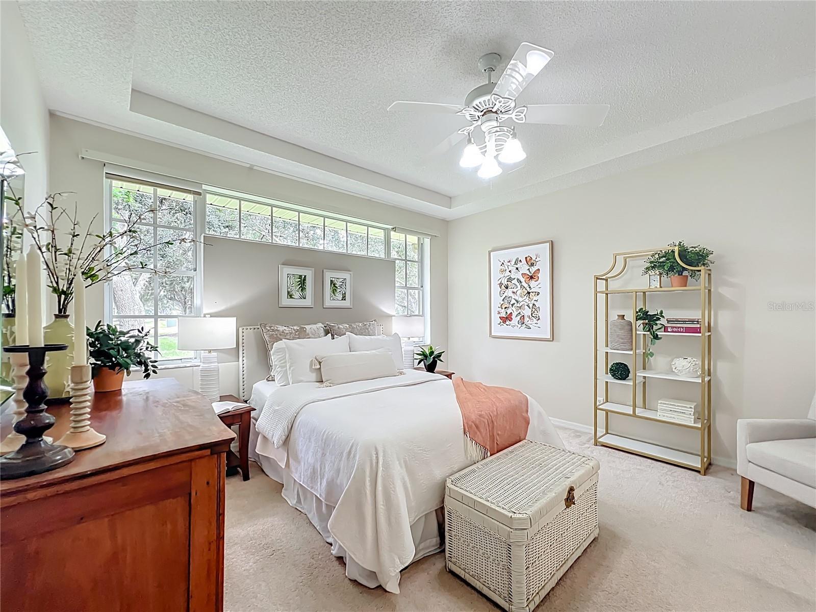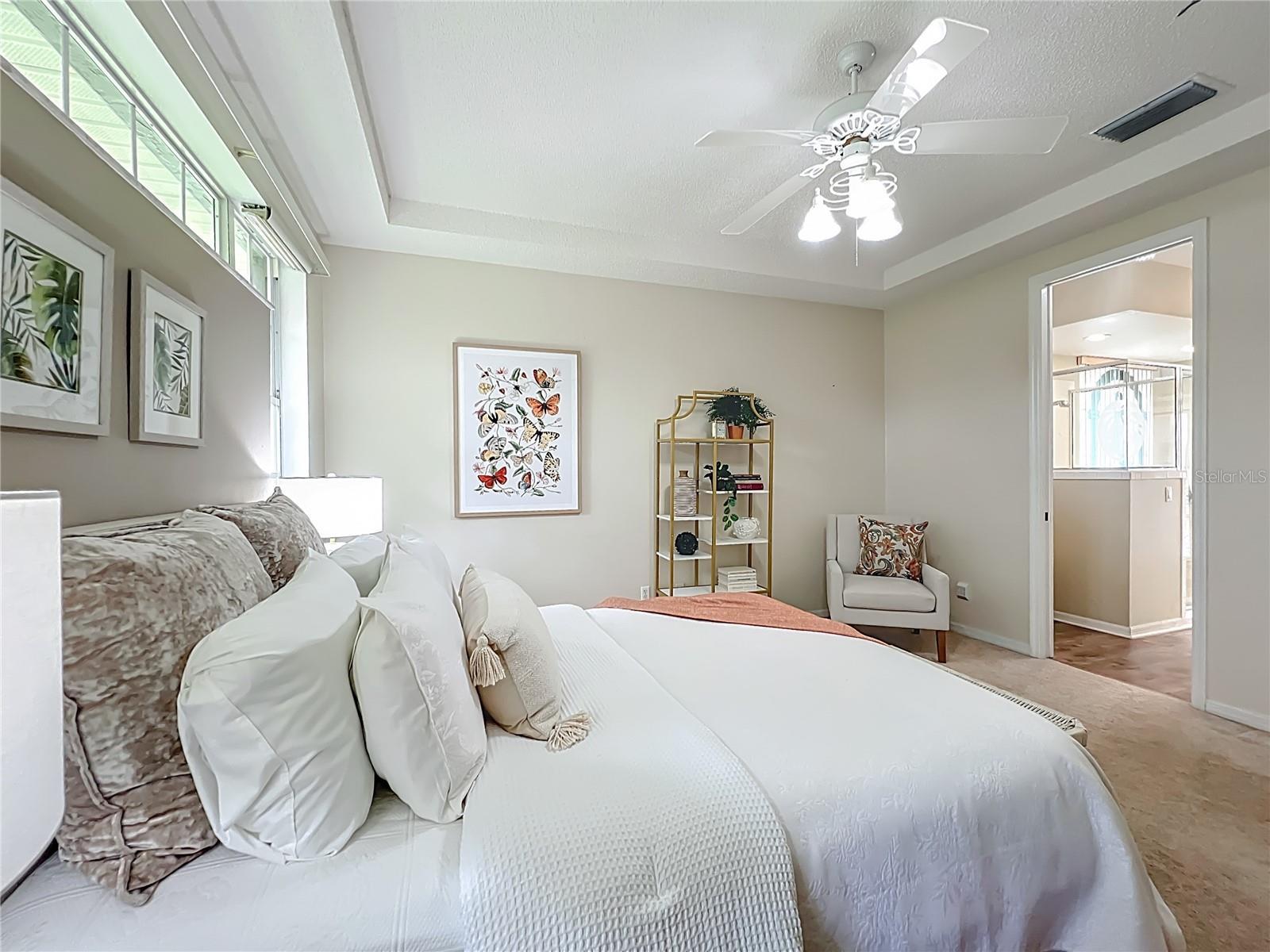 - Ceiling Fans(s), Eat-in Kitchen, High Ceilings, Living Room/Dining Room Combo, Primary Bedroom Main Floor, Solid Surface Counters, Split Bedroom, Stone Counters, Thermostat, Vaulted Ceiling(s), Walk-In Closet(s), Window Treatments