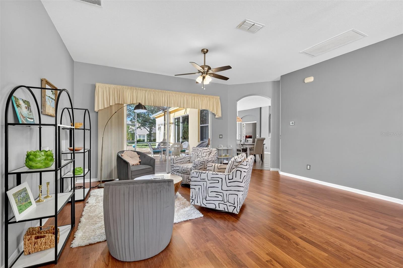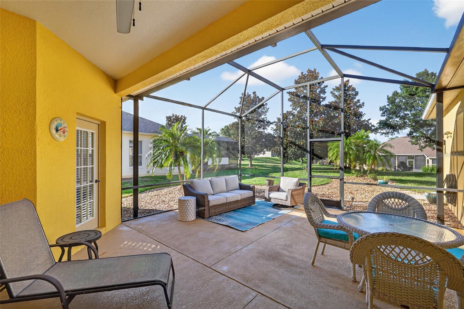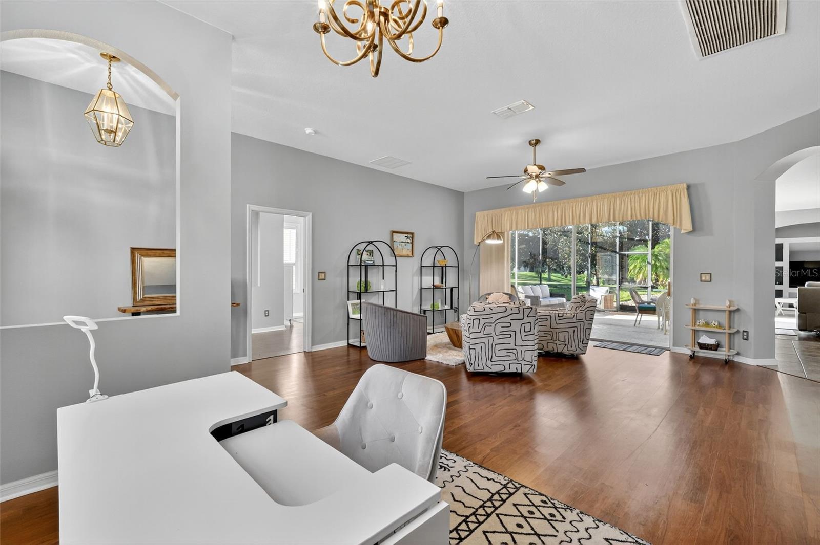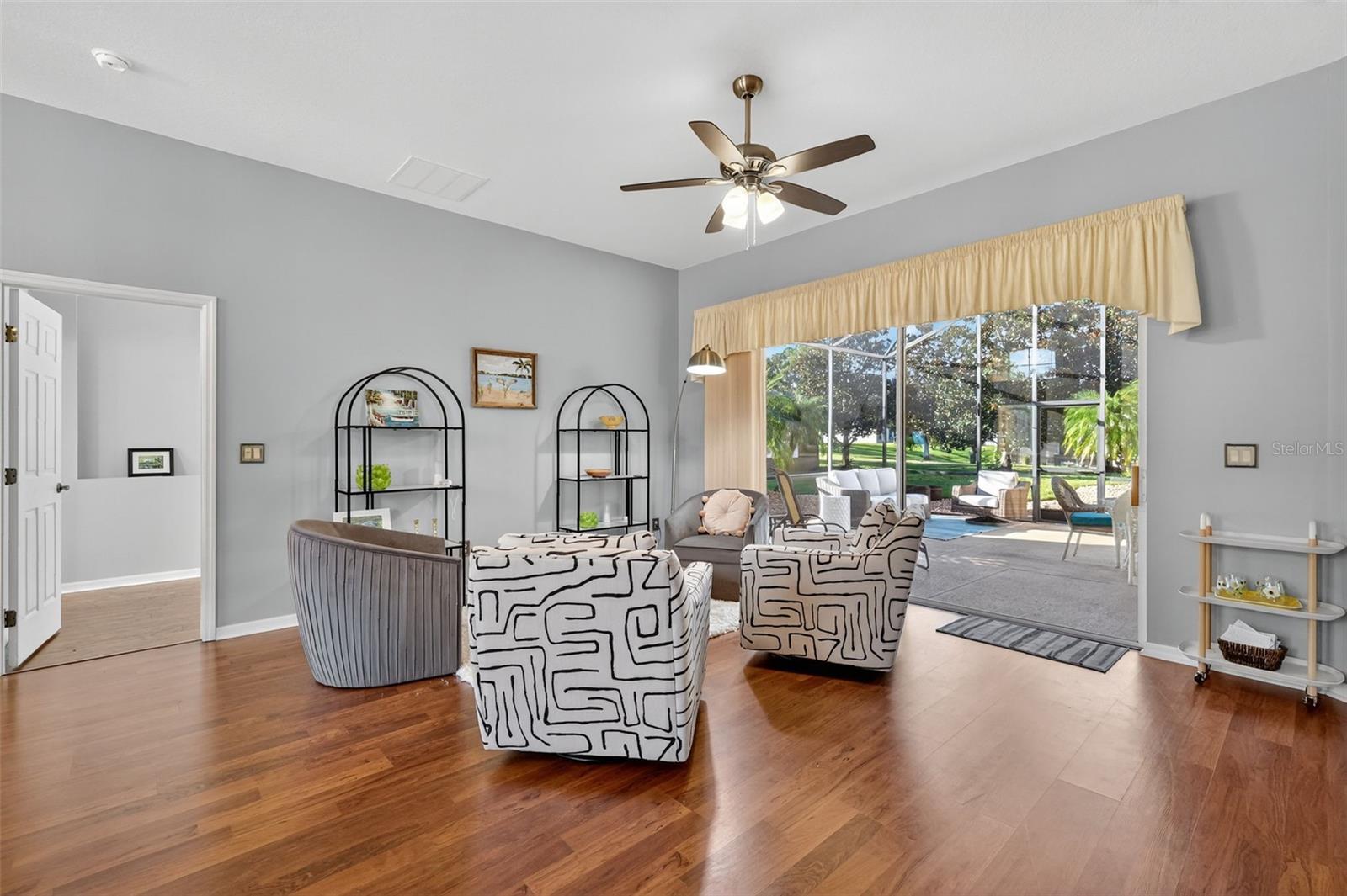 Welcome to this beautifully maintained Bird of Paradise model located in the desirable Ashland Village of Plantation at Leesburg. This spacious 2-bedroom, 2-bathroom home plus private study/den offers an impressive 2,399 square feet of comfortable living space and is being sold TURNKEY (completely furnished with newer furniture), allowing you to move right in and start enjoying the Florida lifestyle. Designed for both elegance and ease, the open floor plan features high ceilings, abundant natural light, and formal living and dining rooms that flow seamlessly into the heart of the home. The kitchen is a true highlight, complete with a window above the sink, extensive counter space, plentiful cabinetry, a large pantry, and upgraded pendant lighting above the breakfast bar. Enjoy the Florida lifestyle year-round from the covered and screened 20x19 lanai, overlooking a serene green space. The sought-after 2-bay plus golf cart garage (25x21) provides ample parking and storage. The primary suite is bright and spacious, offering a walk-in closet and an en suite bath with a double vanity, soaking tub, and large walk-in shower. The guest suite, thoughtfully designed for privacy, features its own full bath with a walk-in shower and upgraded lighting. Throughout the home, you’ll find white plantation shutters and high-quality laminate flooring, no carpet anywhere. Additional highlights include a large indoor laundry room with a utility sink and storage cabinets, HVAC replaced in 2020, updated irrigation (2023), and an updated roof (2024) for peace of mind. Plantation at Leesburg is a scenic, guard-gated 55+ community offering resort-style living with two 18-hole championship golf courses, a restaurant, three activity centers, three heated pools, fitness centers, tennis and pickleball courts, walking trails, and optional RV and boat storage. Experience comfort, style, and active living, all in one of Central Florida’s most sought-after retirement communities.