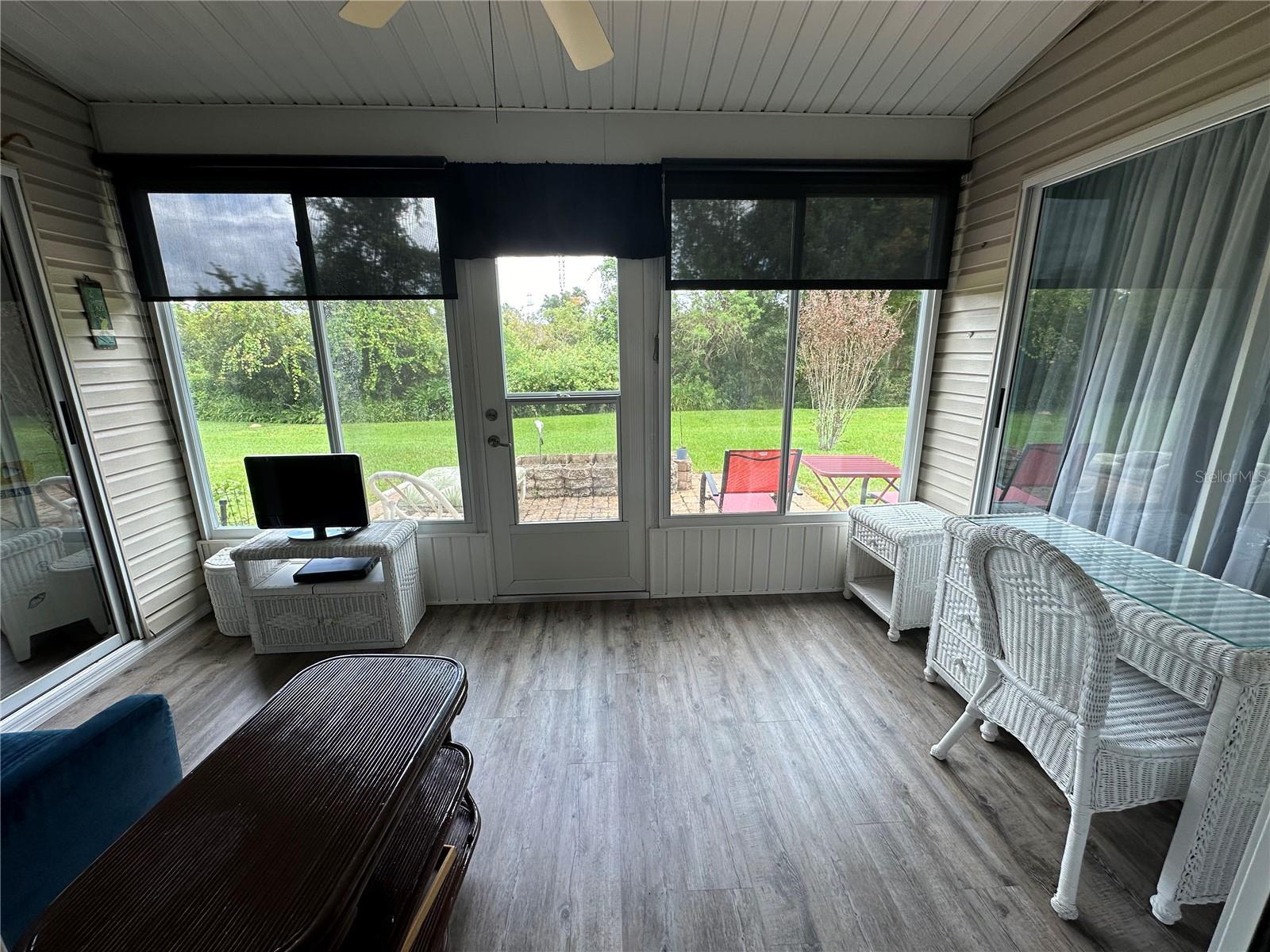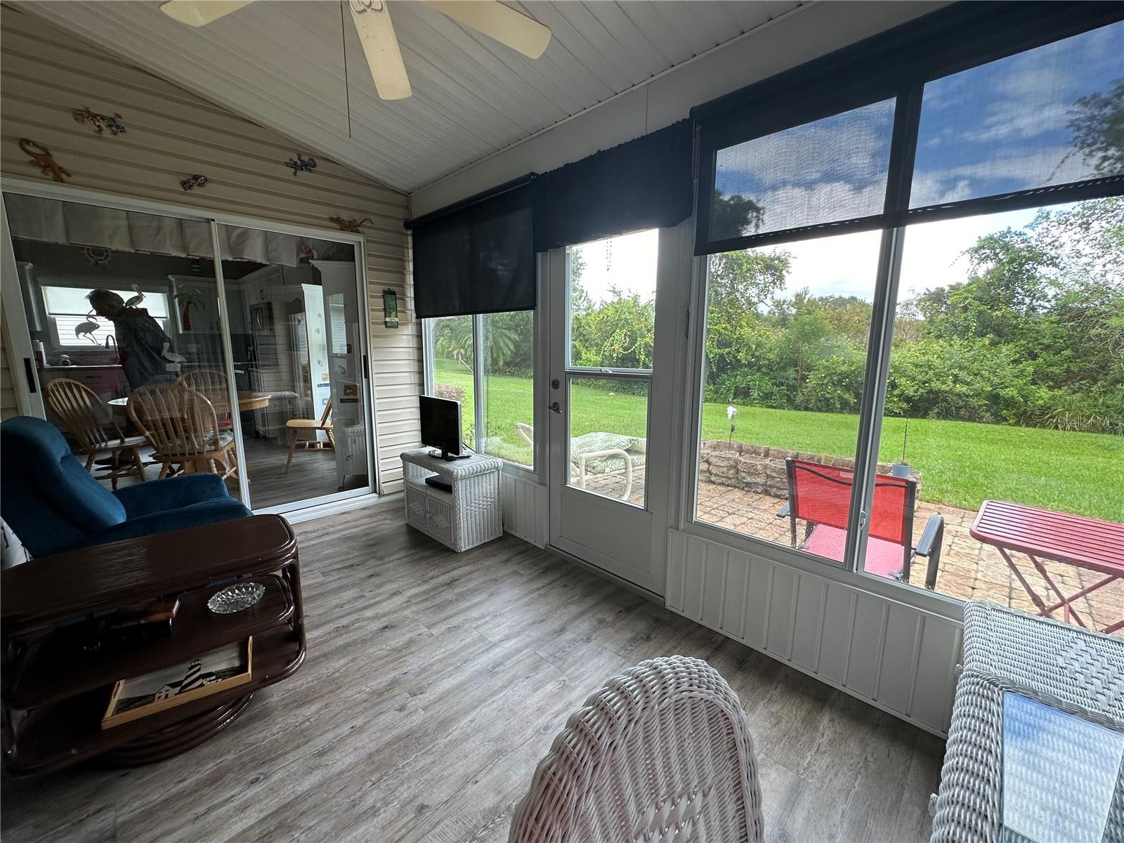 This meticulously maintained 2BR,2b Turnkey home is ready for you to move right in. Great curb appeal with a paver driveway and walk that leads you to the charming front porch. You enter through a beautiful glass front door with matching side lite. The high ceilings and laminate flooring throughout the home provide a classic look. The combined living room/dining room combination give you a large open area that will allow you to create a space to meat your individual style and needs. Currently they are combined to provide a large living room but can be divided to add a more formal dining room. The large kitchen has lots of cabinet and counter space. The eating area opens to the enclosed lanai. The lanai also has doors to the living/dining room and to the primary bedroom. The large primary bedroom has a walk in closet an updated ensuite bath with a walk-in shower and sky lite. The second bedroom and guest bath will delight your guests. The private backyard has a great view of nature and NO NEIGHBORS BEHIND YOU. This home is perfect whether you plan to be a full time or part time resident. Schedule your showing soon so you don't miss it. Pack your bags move right in so you can begin living the life you have dreamed of in the Florida sunshine. The Plantation at Leesburg is a a gated 55+ community that offers a great lifestyle and is an active community. It boasts 3 activity center, 3 pools with spas, 2 gyms, tennis and pickleballs courts, a driving range and 2 18 hole golf courses, along with many other amenities, clubs, etc. New AC 2021