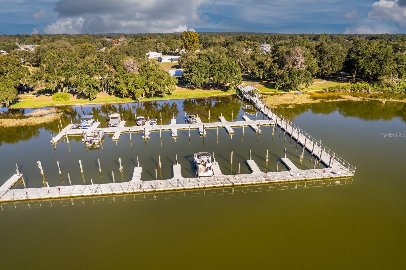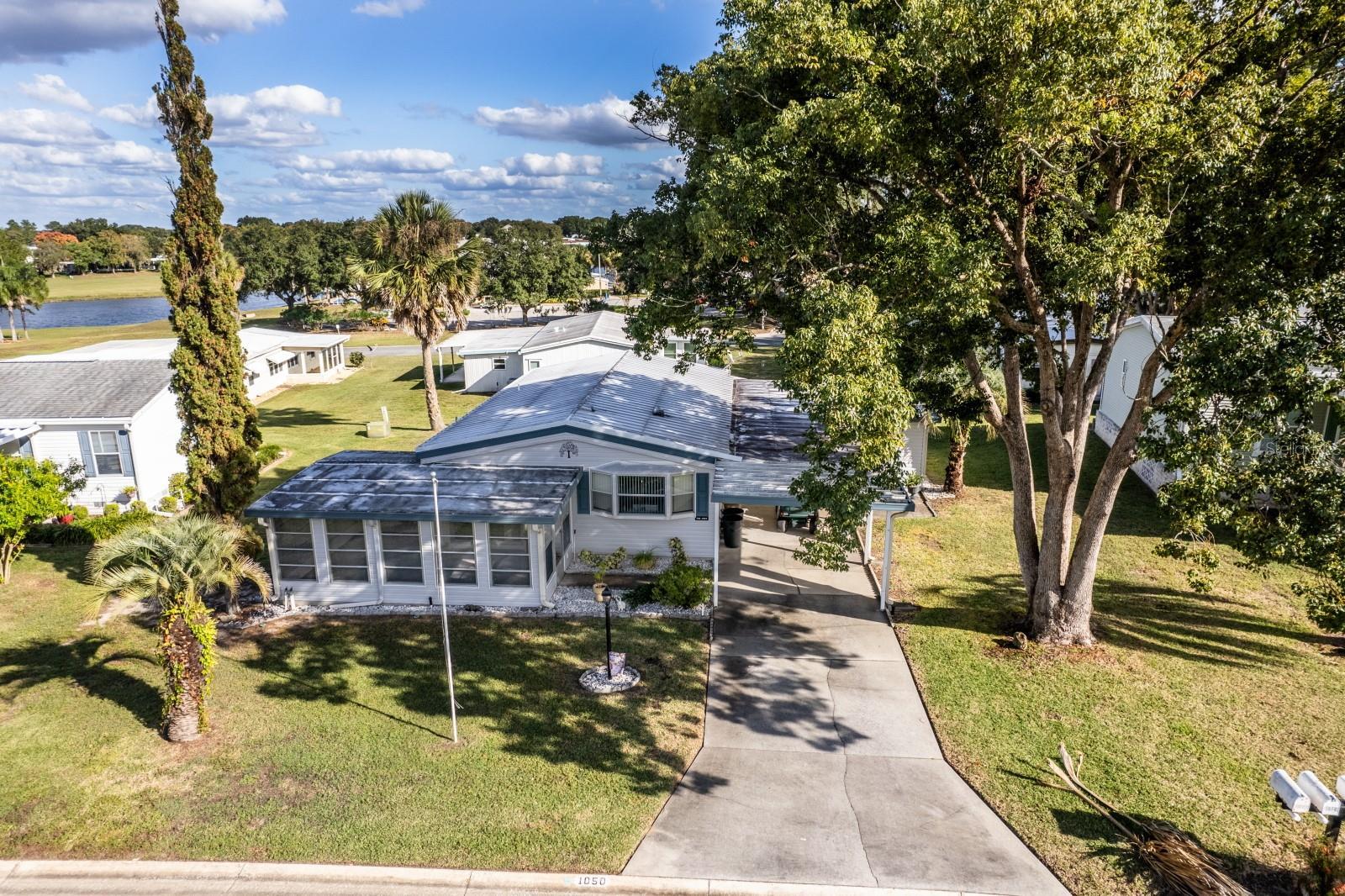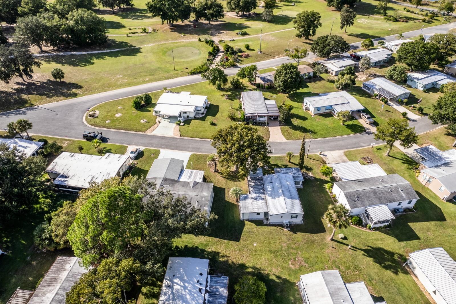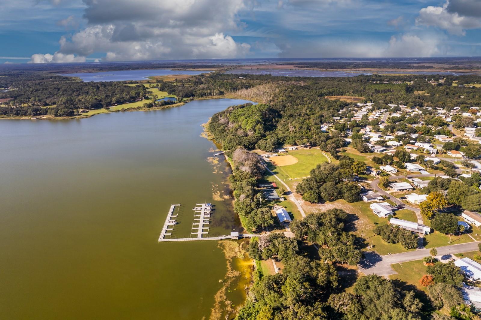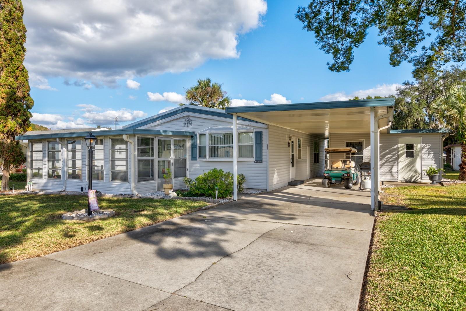 Land is OWNED NOT LEASED. Home is total TURNKEY. Live Your Best Retirement Life — Move-In Ready and Fully Equipped! Imagine moving into a welcoming, active retirement community where the neighbors are friendly, the amenities are fantastic, and all you need to bring are your clothes! This charming two-bedroom, two-bath home with a one-car carport and four-seater golf cart is completely turnkey. The shed is fully stocked with everything you could possibly need — a workbench, tools, five sets of golf clubs, freezer, washer and dryer, ladder, two bicycles, and more. Outside, you’ll appreciate the low-maintenance design featuring brick skirting, vinyl siding, gutters all around, a decorative rock border, a flagpole, and termite protection. Best of all, you’re just a short walk from the clubhouse, where you’ll find the heart of the community and endless social activities. Step inside and you’ll be greeted by a bright, open floor plan filled with natural light from a solar tube. The kitchen is thoughtfully designed with a built-in desk, a lovely bay window, and plenty of cabinets and counter space for your everyday cooking. It includes a range, hood, refrigerator, dishwasher, pantry, and ceramic tile flooring. The dining area features laminate flooring and a built-in hutch — perfect for hosting friends or family. The spacious living room offers lots of natural light, a ceiling fan, and laminate flooring, creating a cozy space to relax or enjoy a movie night. Through the sliding glass doors, you’ll find the lanai, featuring indoor-outdoor carpet and access to the front yard — an ideal spot for morning coffee or an evening chat. The guest bathroom includes a full tub and shower, a linen closet, and luxury vinyl plank flooring. The guest bedroom provides generous storage and comfortable carpeting, perfect for overnight visitors. The primary suite features two closets, built-in dressers, a ceiling fan, and laminate flooring. The en suite bath includes a walk-in shower with glass doors and luxury vinyl plank flooring. This vibrant 55+ community truly has it all — swimming pools, golf, fitness center, borrowable medical equipment if the need arises, shuffleboard, a marina with boat docks, pickleball courts, fire pits, hot tubs, free storage, and so much more — all located along beautiful Lake Yale. Plus, you’ll love the full calendar of social events and activities that make it easy to stay active and connected. Conveniently located near parks, recreation areas, and The Villages, where you can enjoy live music, dining, and entertainment year-round. This is the perfect opportunity to enjoy maintenance-free living in a friendly, resort-style community. Call your Realtor today and come see this fully furnished, move-in ready home — your retirement dream starts here!