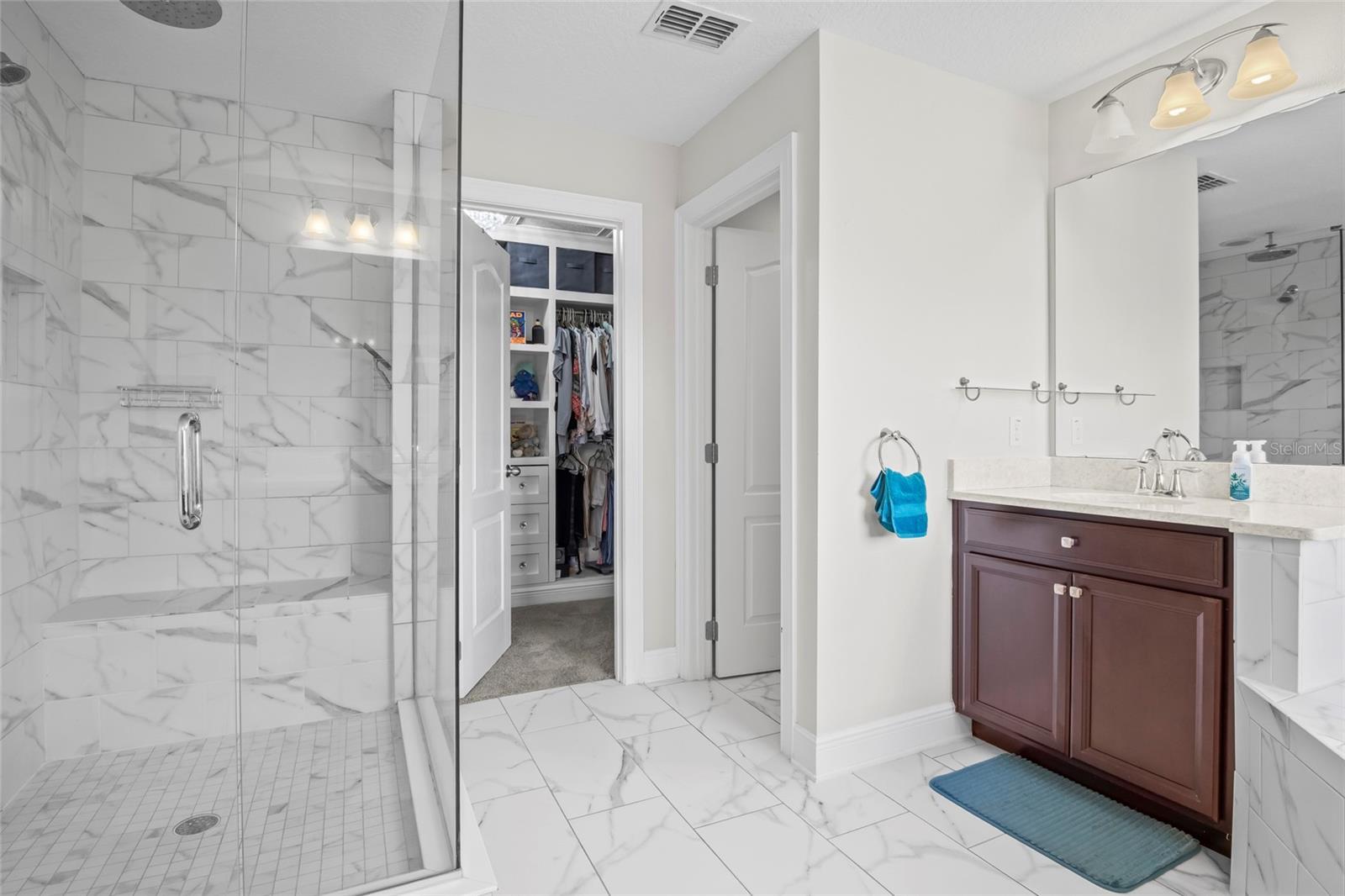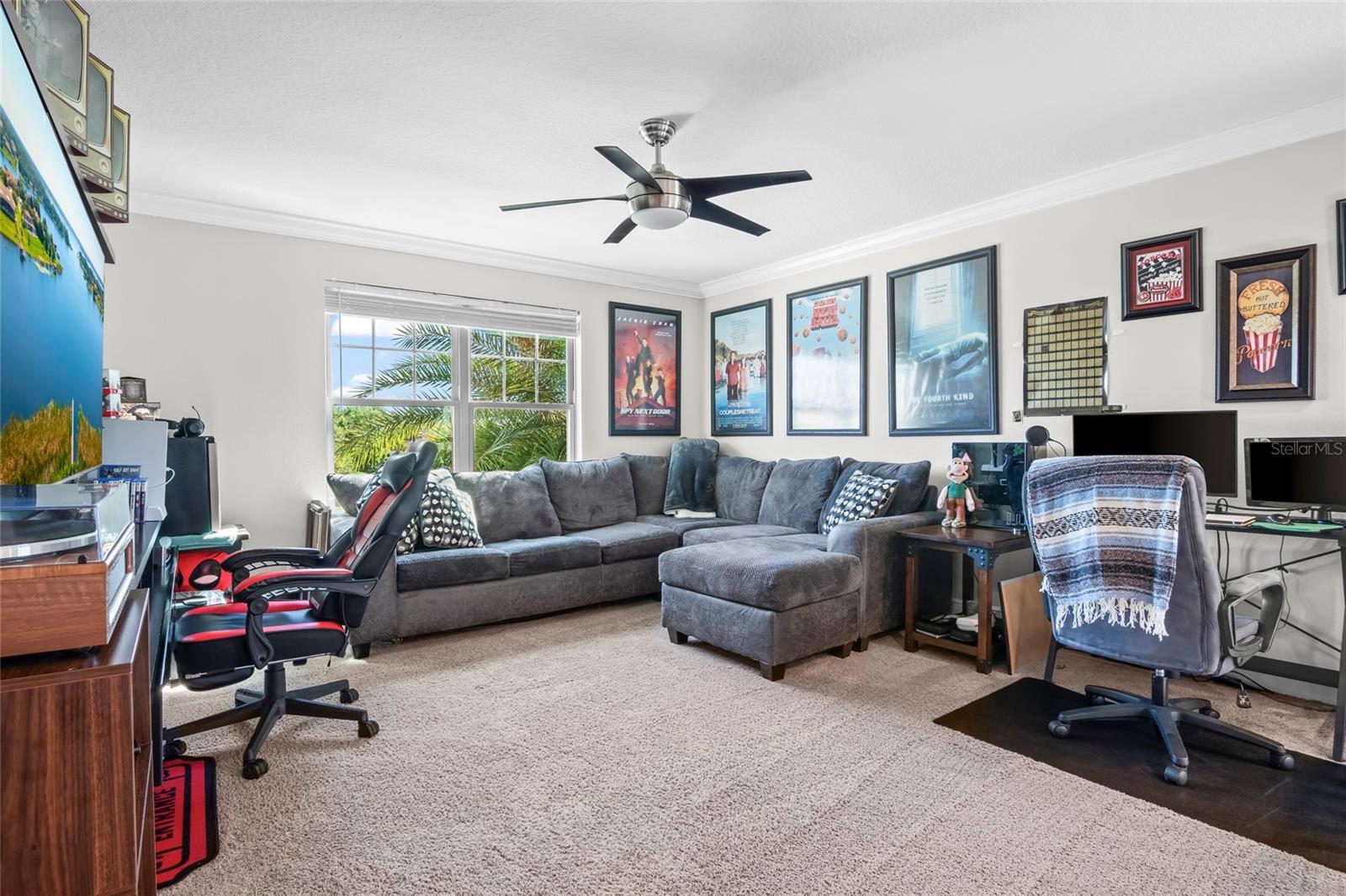 - Ceiling Fans(s), Crown Molding, Eat-in Kitchen, High Ceilings, Kitchen/Family Room Combo, Living Room/Dining Room Combo, Open Floorplan, PrimaryBedroom Upstairs, Solid Surface Counters, Solid Wood Cabinets, Stone Counters, Thermostat, Tray Ceiling(s), Walk-In Closet(s), Window Treatments