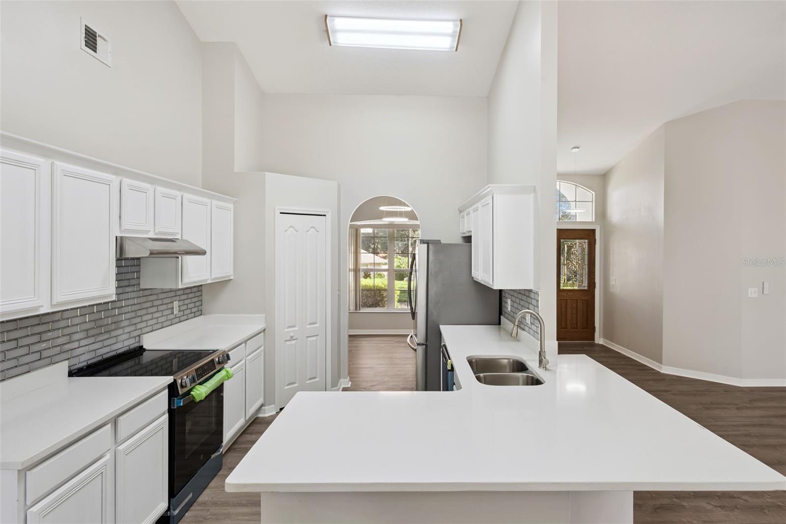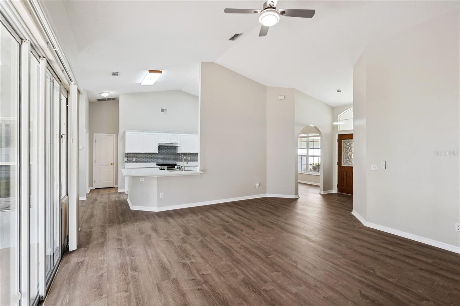 - Ceiling Fans(s), Eat-in Kitchen, High Ceilings, Kitchen/Family Room Combo, Open Floorplan, Solid Surface Counters, Split Bedroom, Stone Counters, Walk-In Closet(s)