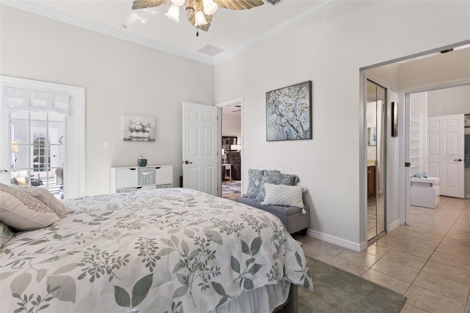 - Ceiling Fans(s), Crown Molding, Primary Bedroom Main Floor, Solid Surface Counters, Split Bedroom, Walk-In Closet(s), Window Treatments