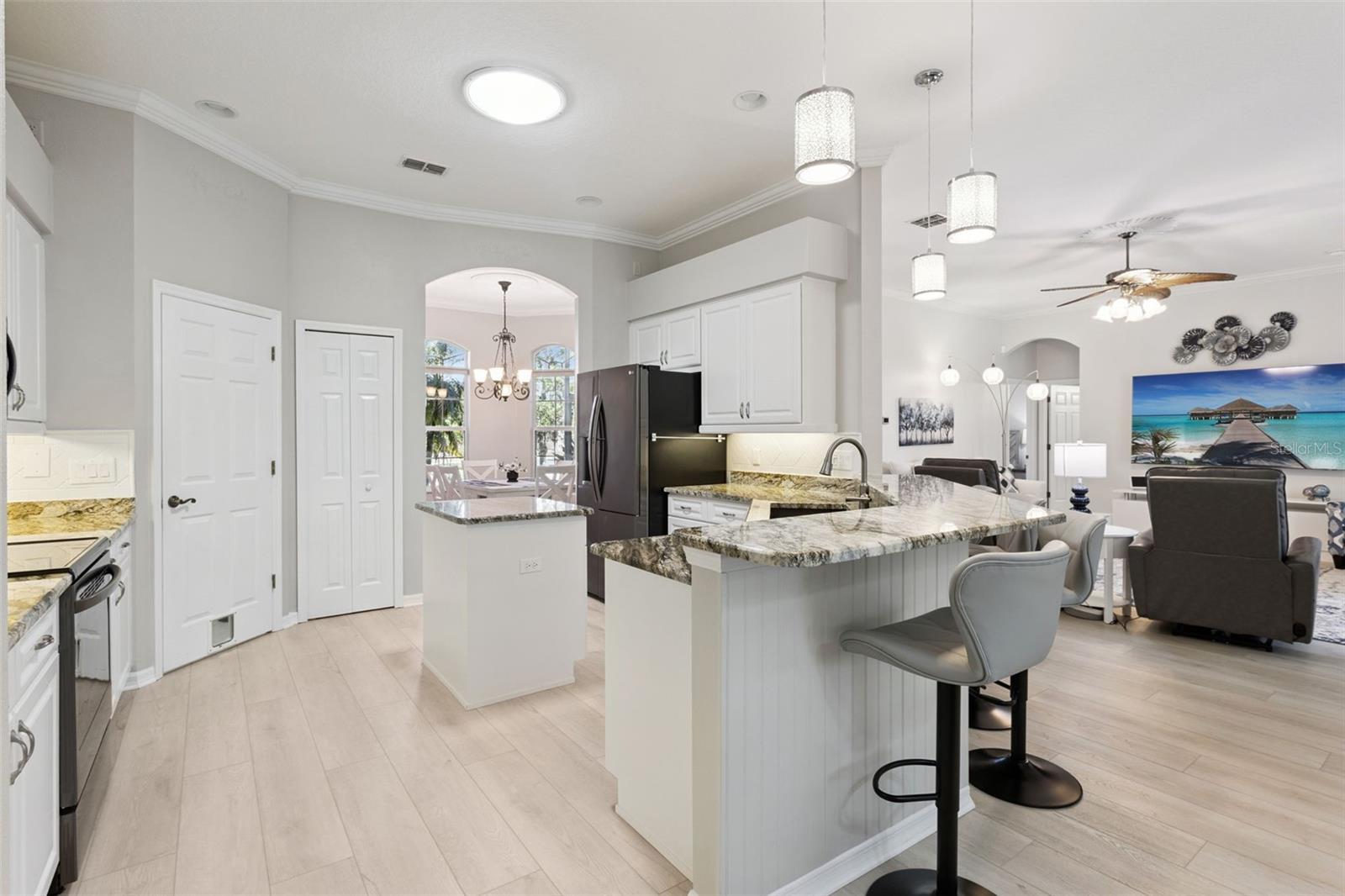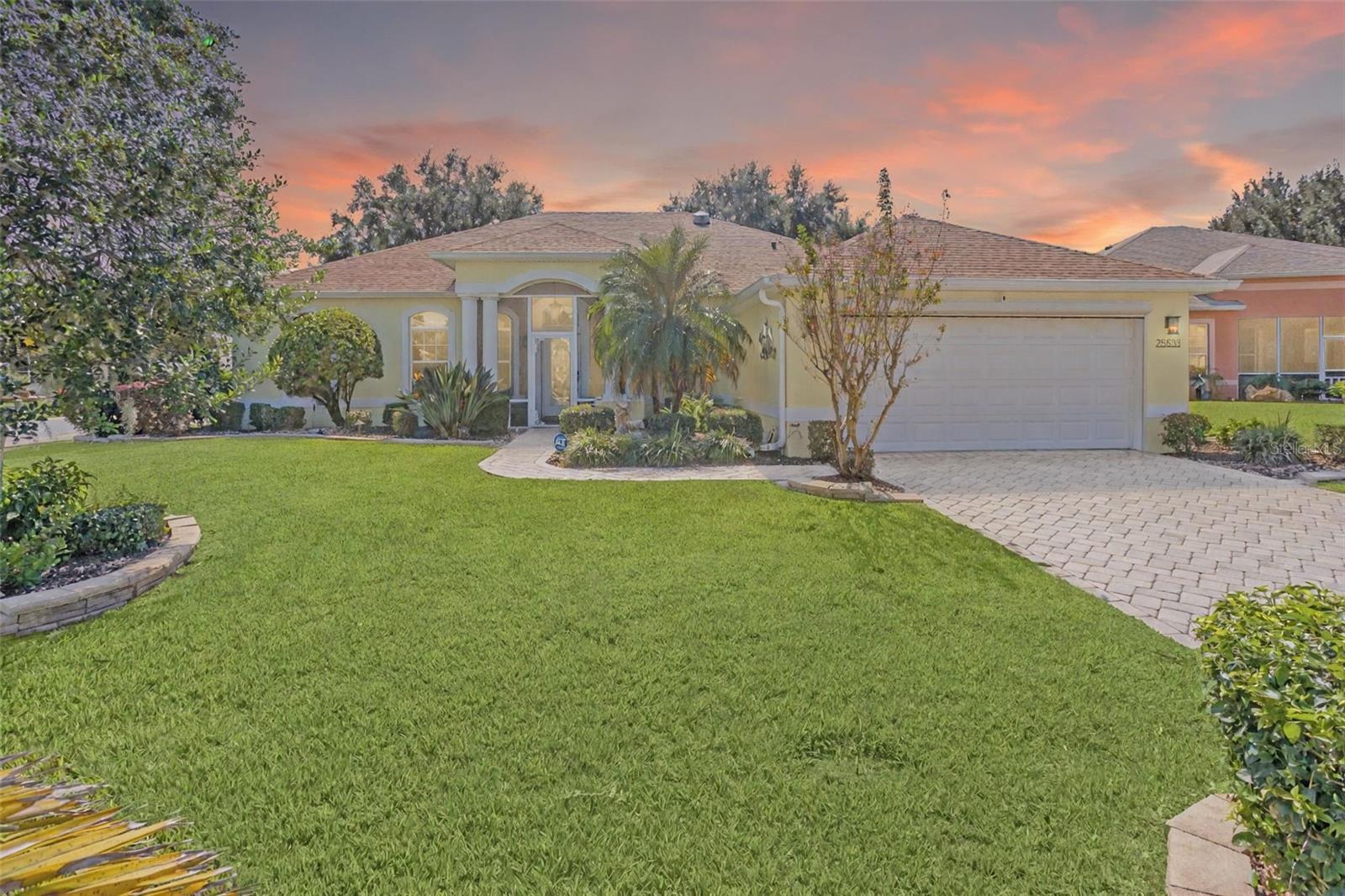 Sellers' HOT list: (What sellers love about this home) "Great for entertaining (private guest suite), Florida Room with wall of windows is heated and cooled, brick paver patio for grillin" and chillin" is nestled in the private backyard, professionallly landscaped and professionally cared for Florida landscaping, and of course their neighbors!" The interior has been transformed into a light and bright updated paradise with crown molding throughout, soft neutral wall paint, light luxury vinyl plank flooring through out (except in tiled bathrooms and bedrooms), white kitchen cabinetry, updated light fixtures, new window covering and cornices. Floor plan includes two master bedrooms with direct access to the Florida Room, Den (currently the third bedroom) Livingroom currently used as music room/office, dining room, family room, breakfast nook, kitchen with white cabinetry and updated appliances, granite counter tops, tile backsplash,and breakfast bar. Utility room with washer, dryer, utility sink, upper cabinets. Master bathroom has dual sinks, walk-in closet and tile floor. 2nd master bathroom has walk in shower with glass block wall and 2 closets, one being a walk in, 2 garage has been extended by 4 feet, has pull down stairs for storage above garage and a motorized garage door screen. This home oozes curb appeal with professionally landscaped corner cul de sac lot Florida landscape includes giant palm tree, bird of paradise,ruby red flowering crepe myrtle all enhanced with a brick paver drive way, stacked stone landscaping edging and brick walk way to home. Additional updates include Roof-2023,HVAC 2021,exterior paint 2023.Enjoy the retirement lifestyle that the Plantation at Leesburg affords 18 hole golf courses, 3 activity centers with heated pools,men and women softball, pickleball, boccee ball, shuffleboard, horseshoes,rv parking,woodworking shop,cards, games, dances.Drive thru this community and be awed by the lush landscaping and abundance of trees. The Manor, the main club house looks just like Tara Plantation. Leesburg is located in the middle of the state, fastest growing city and safest place from a hurricane. Close ot Orlando Parks and either coast is 1 hour away.