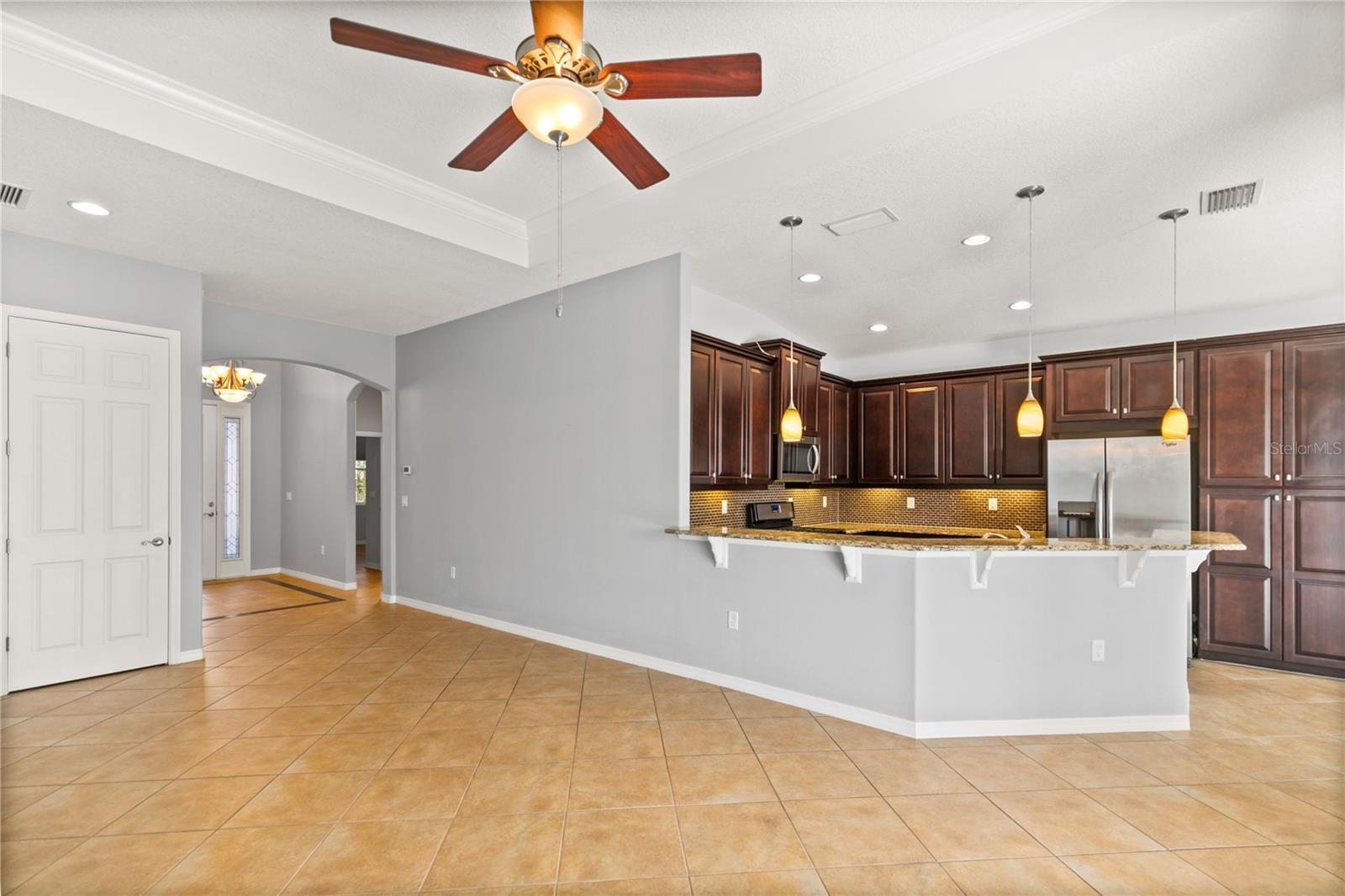 - Accessibility Features, Ceiling Fans(s), Crown Molding, Eat-in Kitchen, High Ceilings, Kitchen/Family Room Combo, Open Floorplan, Primary Bedroom Main Floor, Split Bedroom, Stone Counters, Thermostat, Tray Ceiling(s), Walk-In Closet(s), Window Treatments