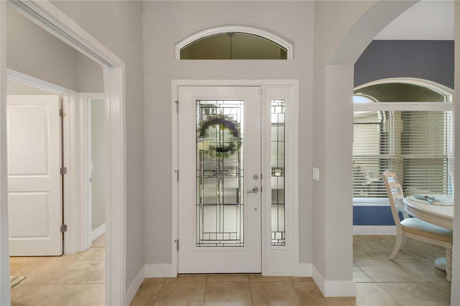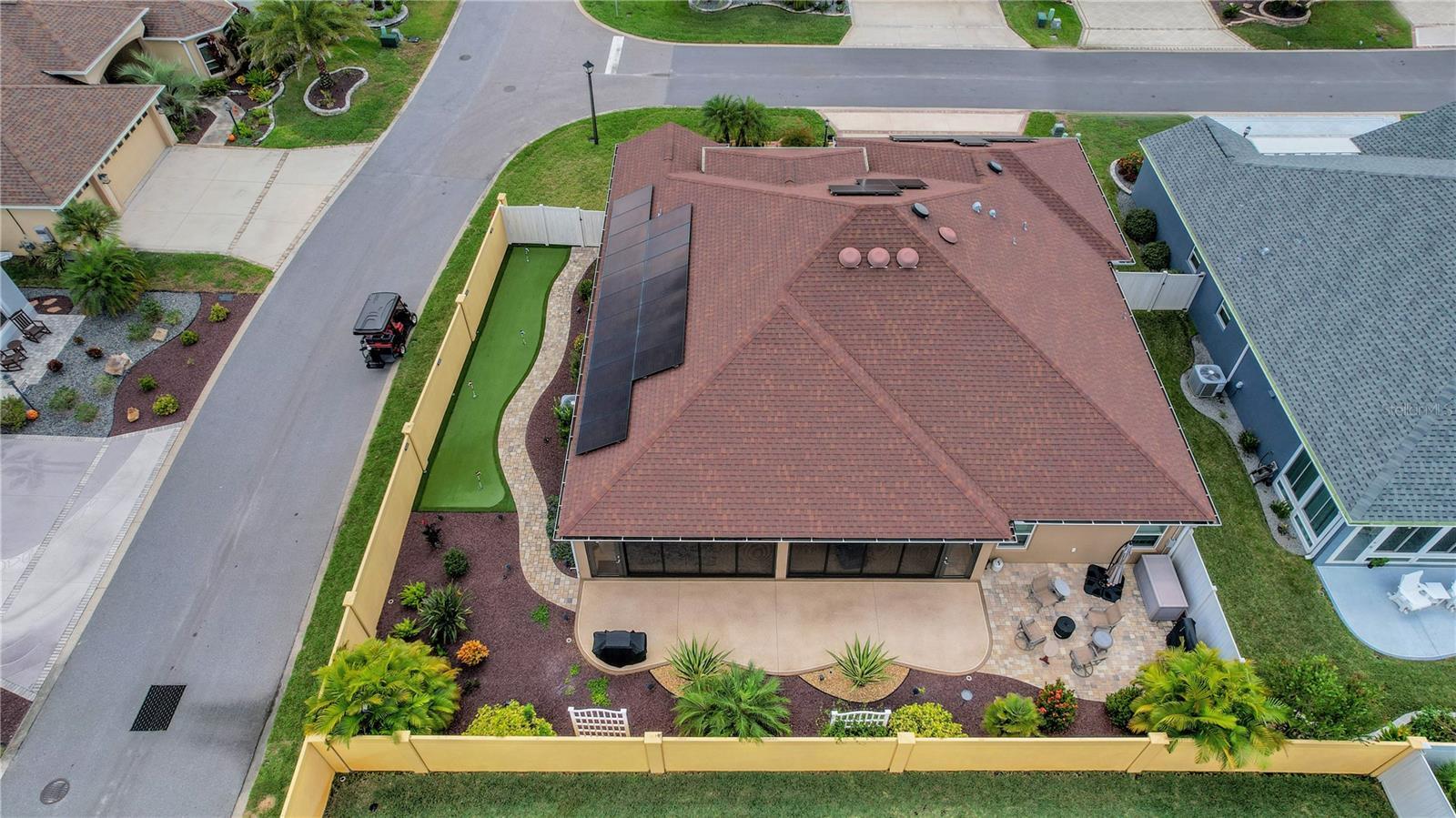 Welcome to this lovely 2019 built 4 bedroom 3 bathroom 3 car garage (29'4" x 22'9") home with upgrades galore in the Village of Monarch Grove. This home features an OUTDOOR PUTTING GREEN, solar panels (PAID OFF), whole house water filtration system as well as MAGIC STAIRS, an elevator storage lift in the garage and 2 solar fans & added shelving/flooring in the attic. Step inside to see beautiful tile floors in the main areas and premium laminate flooring in the bedrooms. The kitchen is a chef's dream with dark wood cabinets, gas stove, white quartz countertops, stainless steel appliances, island, breakfast bar, breakfast nook, and a cabinet pantry. The spacious primary suite offers a coffered ceiling, 2 walk-in closets, an en suite bathroom with two separate vanities, a Roman shower, and a water closet. The inside laundry room offers tons of storage and a utility sink. All three guest bedrooms offer tall ceilings and closets for storage. In addition, One guest bedroom has a Murphy bed with attached fold-down desk for your family and friends. The massive FL room (38' x 9'6") with Mini-split is perfect for entertaining especially with the sliding doors that can be stacked so that you have a full view. The fully fenced backyard gives privacy while the patio area adds a great space to enjoy the beautiful outdoors while the screened front porch is a great place to enjoy your morning coffee. Located within easy reach of restaurants, shopping, and all the amenities The Villages has to offer, this beautiful home truly combines style, function, and location in one exceptional package.