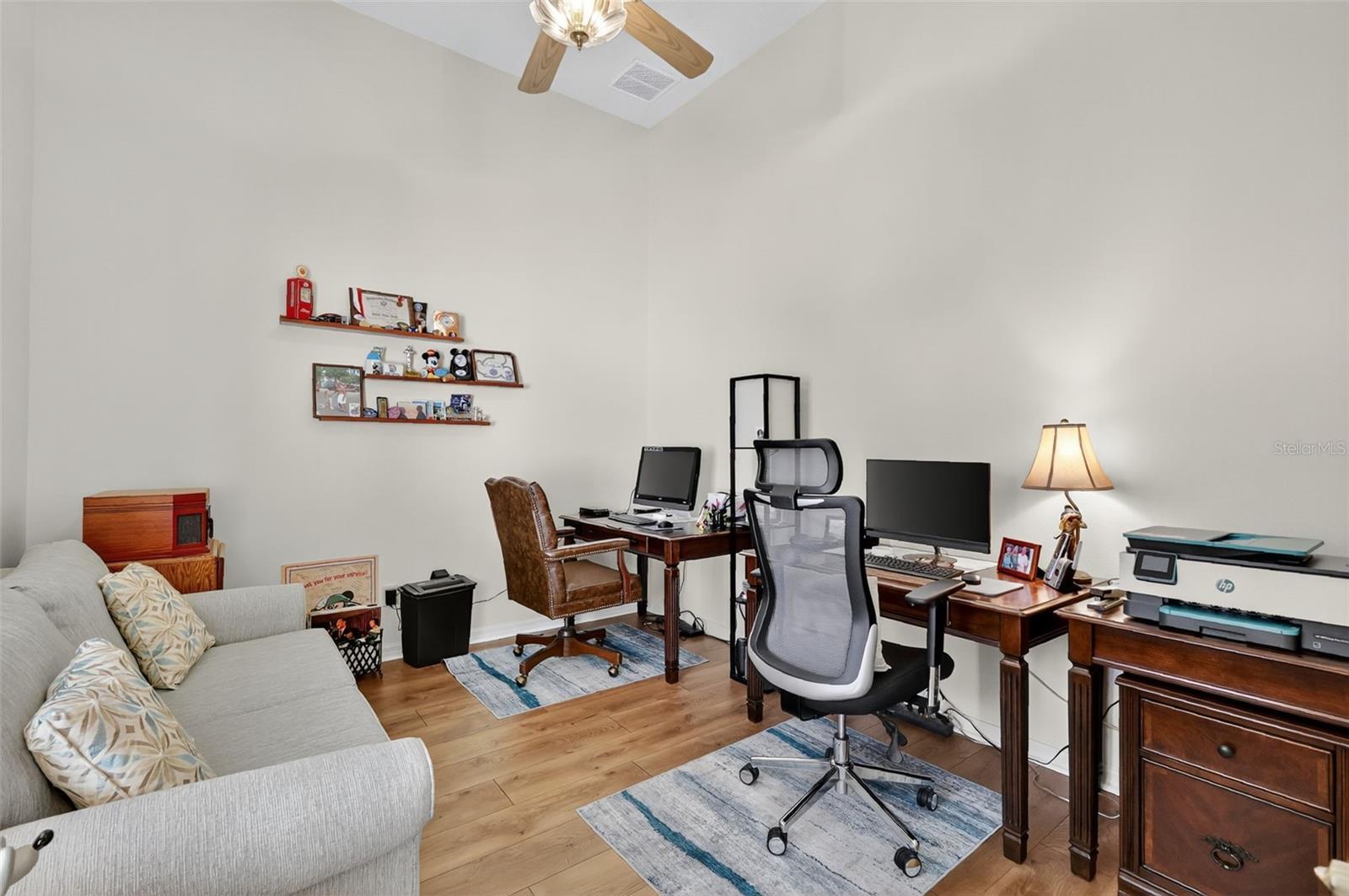 You'll adore this spacious Redwood model home in Plantation at Leesburg, featuring 2-bedrooms plus a den and 2.5 baths. It offers nearly 2,600 square feet and sits on a lovely .44-acre corner lot in the Nottoway neighborhood. Enjoy spectacular, almost "Caribbean" sunsets off the lanai. The yard is meticulously kept, complete with a beautiful fountain at the entrance. The home is built with concrete block and foam insulation for great energy savings. Step inside the foyer to see the quality, including arches and 12-foot ceilings. You’ll find storage everywhere: a large entry closet, many other closets, a pantry, and lots of cabinets. The kitchen is comfortable with an island perfect for quick meals. It features detailed special-order cabinets with decorative molding, Corian counters and sink, and a ceramic backsplash. All interior appliances, window treatments, and blinds stay. The primary bedroom and bath are customized with built-in California closets and drawers, a large walk-in shower, a garden tub, and separate his-and-her vanities. The living and dining areas are spacious and feature a convenient wet bar for entertaining. The family room and formal dining room are cozy and comfortable. Outdoor living is easy on the large 12x27 screened back lanai with ceramic tile, ceiling fans, and lighting. There is also a 12x15 concrete pad perfect for grilling or gardening. The 8x12 front lanai is also screened for comfort. The windows and glass are tinted for Florida's bright, sunny days. The garage includes a newer side entry door and replaced torsion springs on the main door in 2023. The home features a whole-house water softening system. Recent major updates include a new roof in 2022, a new A/C in 2021, and a new hot water tank in 2023. The interior has also been recently updated with new paint and laminate flooring. The Plantation at Leesburg is a well-managed 55+ HOA community with fantastic amenities like 3 community pools, 2 championship golf courses, tennis, pickleball, 2 fitness centers, tons of clubs and activities, and much more. Call today for your personal showing!