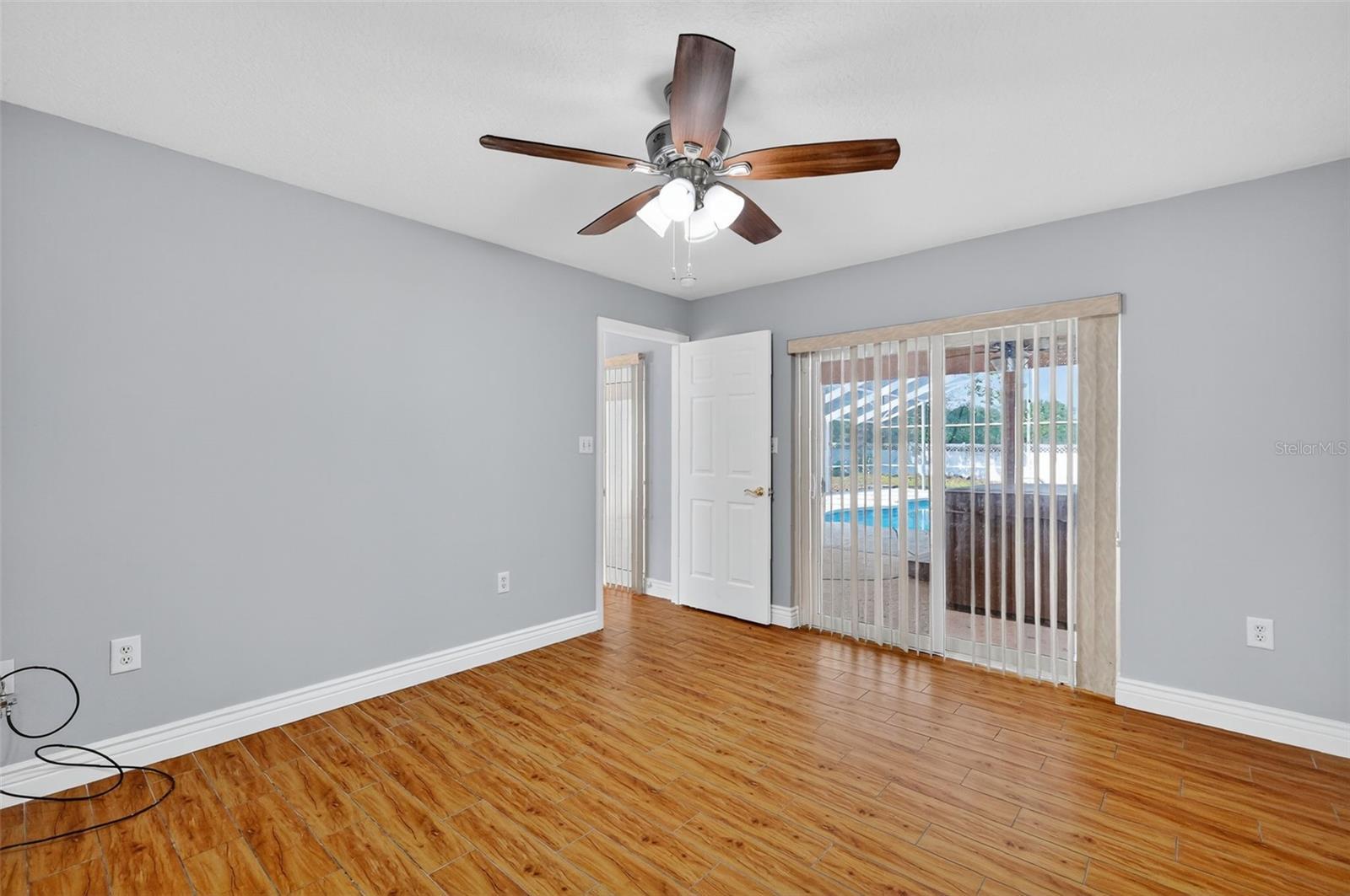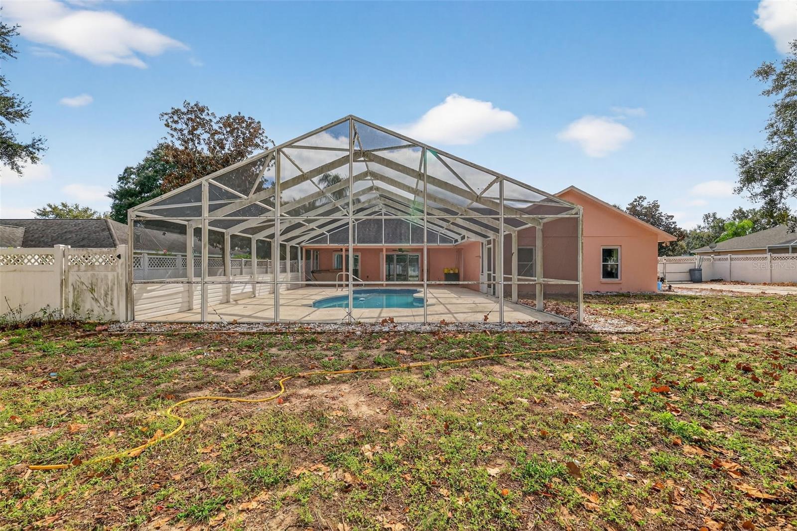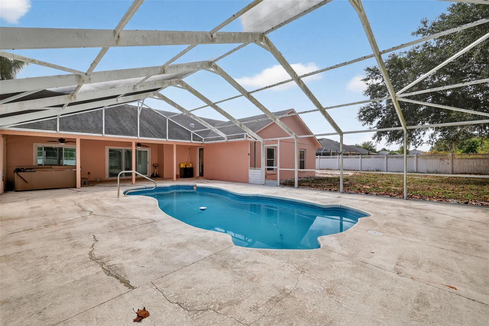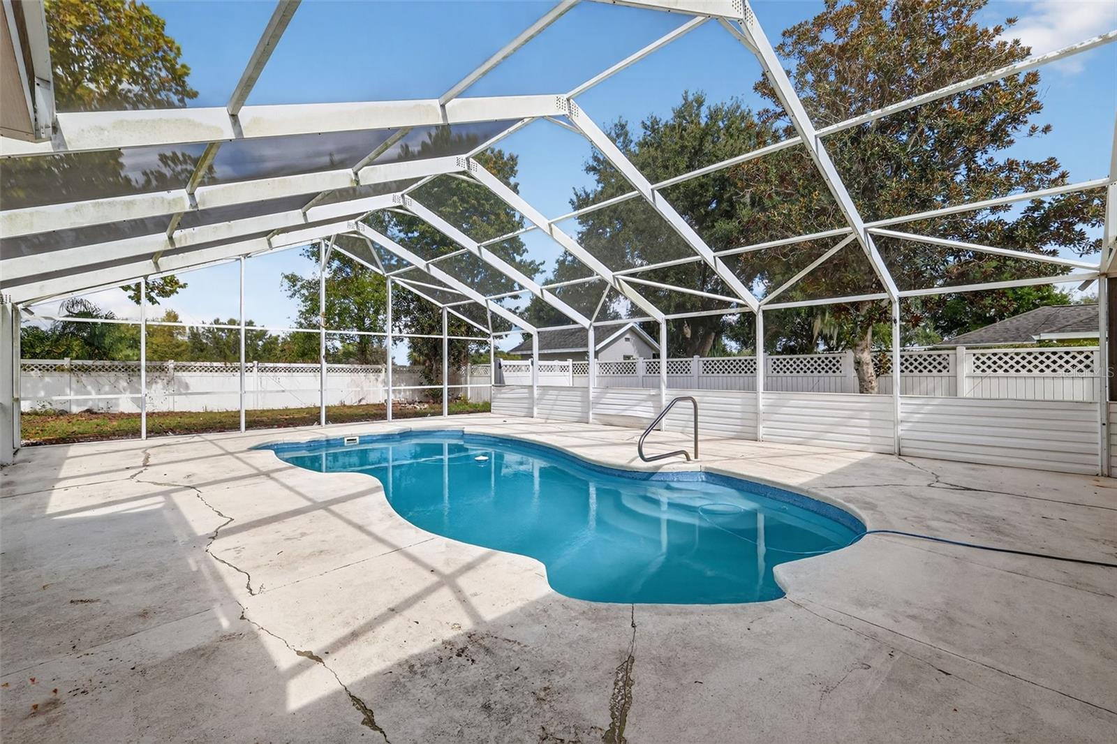 Welcome to this 4 bedroom, 2 bath pool home with Lake Yale access. The open, split floor plan features vaulted ceilings and wood-look tile flooring throughout. The kitchen offers a built-in stove, breakfast bar seating, and opens to the living and dining areas perfect for everyday living or entertaining. The primary suite has direct access to the pool, a walk-in closet, and a private bath. The guest bath also opens to the pool area for added convenience. Step outside to enjoy the screened, heated chlorine pool, relaxing hot tub, and fenced backyard with a dog run. Recent updates include new interior paint, new pool enclosure screens, and exterior paint completed in April 2025. Additional features include an indoor laundry room and side-entry garage. Experience the best of Florida living with this spacious home and community Lake Yale access.