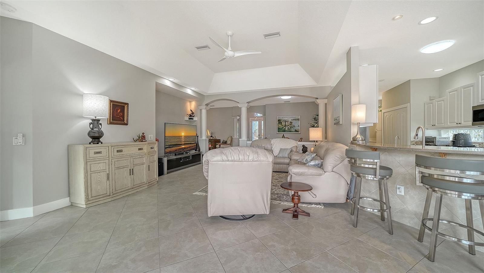 - Ceiling Fans(s), High Ceilings, Open Floorplan, Primary Bedroom Main Floor, Stone Counters, Thermostat, Tray Ceiling(s), Walk-In Closet(s), Window Treatments