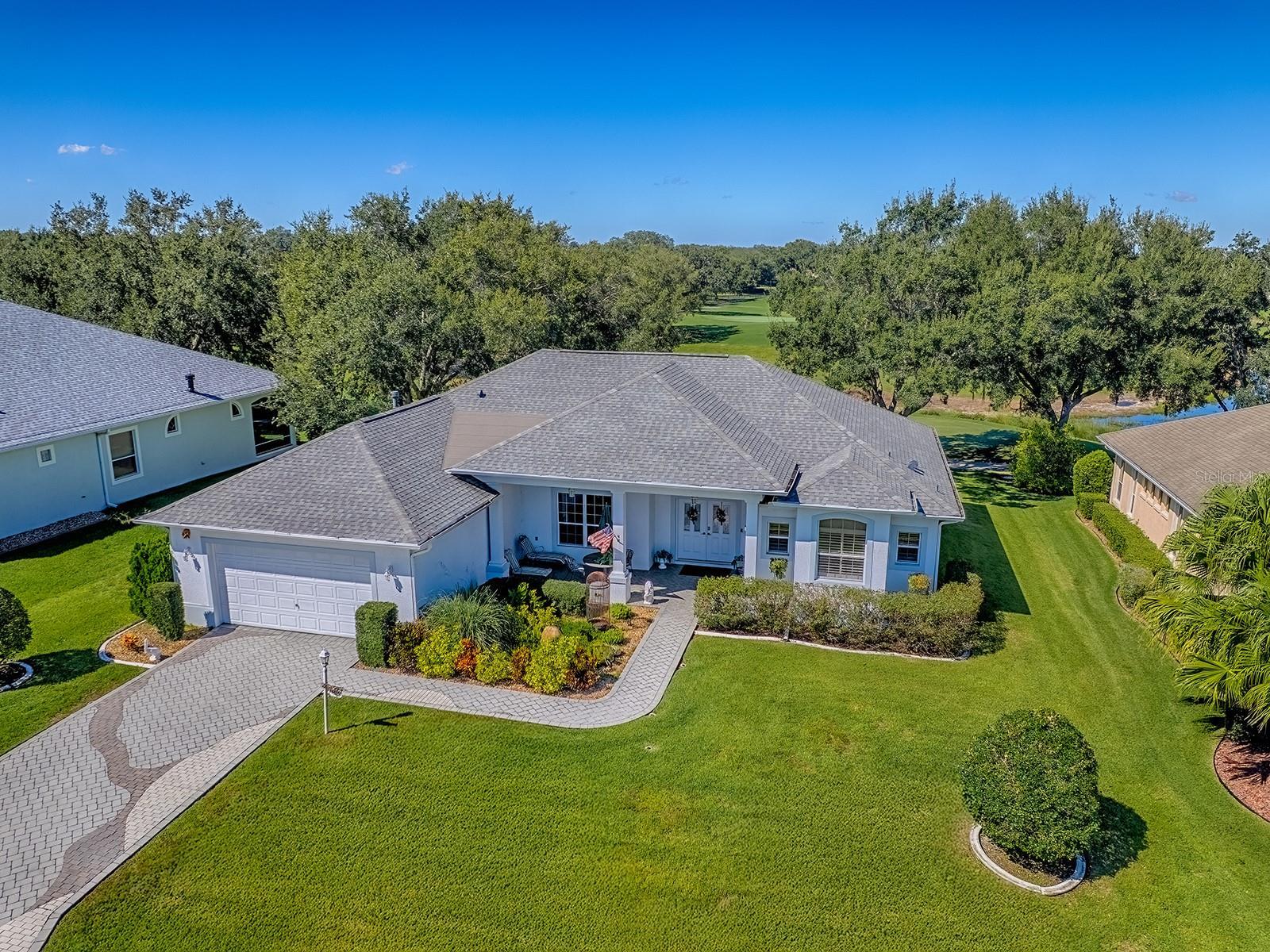 Imagine unwinding in a stunning St. Simons model within a pocket of premier homes in Royal Oak at Springdale, surrounded by the serene views of the Erin Glenn golf course. I'm excited to introduce you to this remarkable property that not only boasts a prime location in The Villages but also features a host of carefully crafted amenities designed for a vibrant lifestyle. Just down the road, you'll find the community pool—another great spot to enjoy Florida living at its best. This property is more than just a home; it's an oasis of comfort and style. Approaching you will be greeted by a grand front entry featuring custom brick-paved driveway and walkway, complemented by elegant double leaded glass doors. Once inside, your eyes will be immediately drawn to the breathtaking views of lush green fairways and shimmering waters, visible from multiple vantage points throughout the house. The heart of the home, the kitchen, is a dream come true for culinary enthusiasts. With tiered oak cabinets, solid surface counters, beautiful tile backsplash and a large island for entertaining guests, it's both functional and beautiful. The expansive walk-in pantry ensures everything you need is right at your fingertips, making meal preparation a delight. Adjacent to the kitchen, the casual dining area seamlessly transitions into a family room with tray ceilings, where large windows pour in natural light and offer more stunning golf course views. Retreat to the spacious primary suite, where tranquility awaits. High tray ceilings add to the room's grandeur, featuring sliding glass doors leading to the lanai, providing yet another luxurious spot to enjoy the scenic views. The en-suite bathroom offers a shower, a relaxing premium soaking tub, dual sinks, and plenty of space—making it the perfect place to unwind at the end of the day. This thoughtfully designed home offers two additional guest bedrooms and a bathroom set apart for total privacy, perfect for hosting visitors. And to round out the comforts, there's a convenient indoor laundry area with added storage space, keeping the home's clean lines and organization intact. Coming out to the expanded glass enclosed lanai—truly the crown jewel of this home—enjoying that coveted Florida lifestyle. Whether you're soaking in the hot tub or enjoying the comfort of the 16 SEER Mitsubishi ductless mini-split system, this outdoor space with vaulted ceilings is perfect for unwinding while overlooking the striking backdrop of the golf course. The new roof, installed in 2022, ensures energy efficiency and peace of mind for years to come. Additional savings considering the bond is paid, there is a tankless water heater and a 2023 HVAC system. Turn this house into your dream home :-)