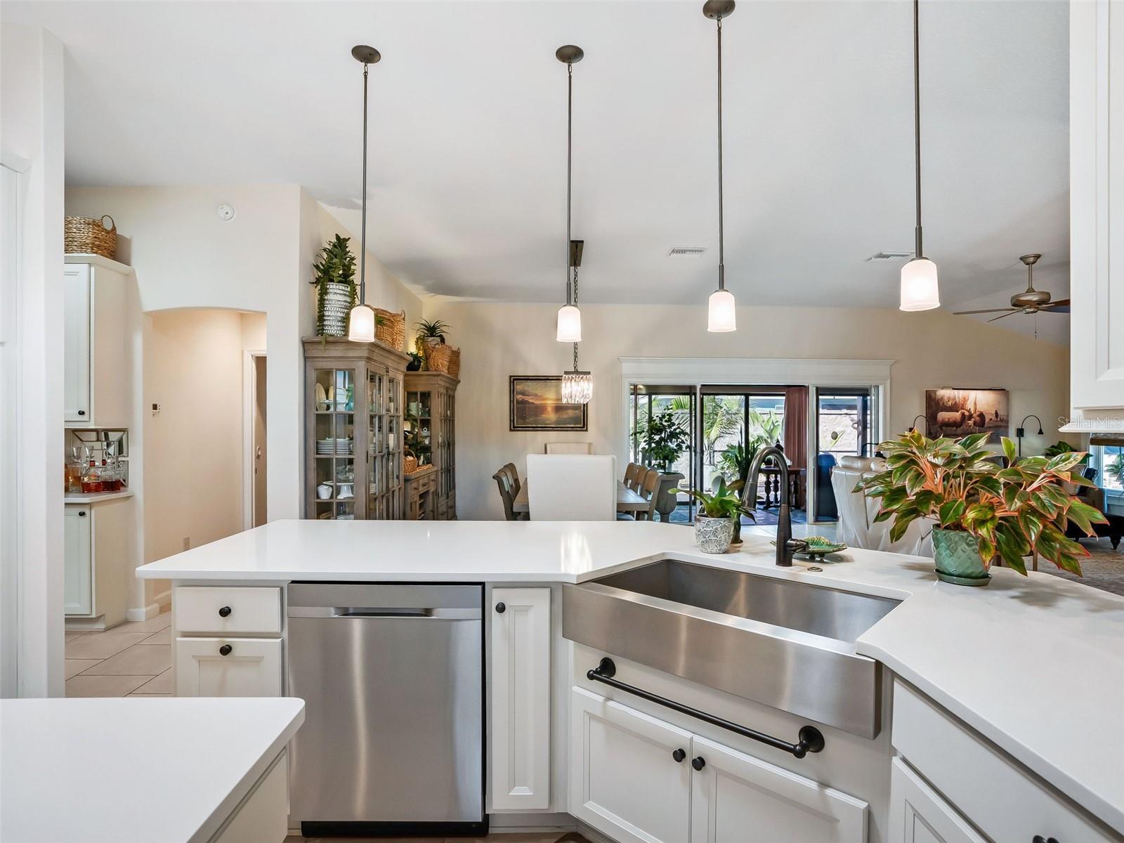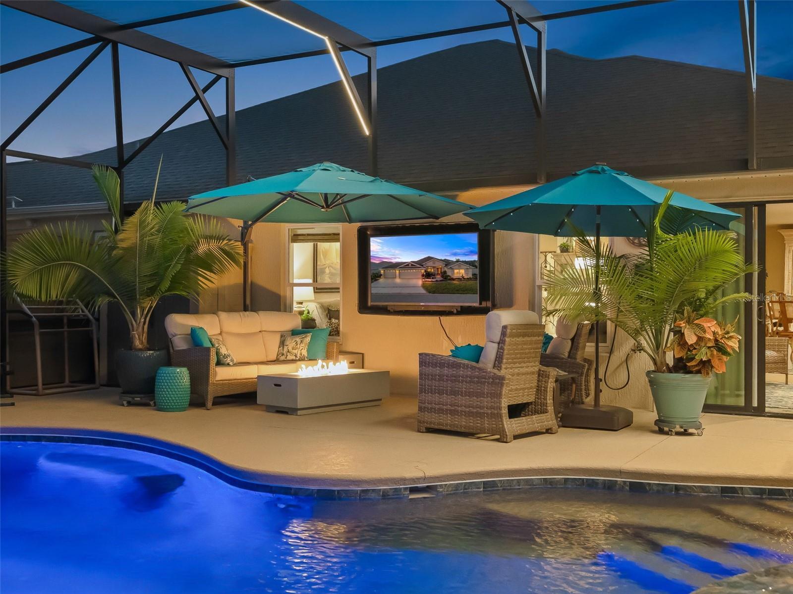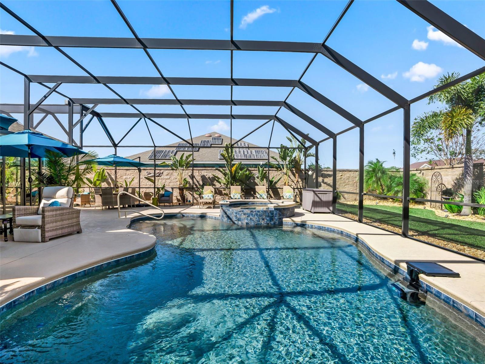 Distinctive Property Listing– Stunning Veranda Model offering over 2,400 sq. ft. of beautifully designed living space on an oversized corner lot (¼ to ½ acre). This stretched Saginaw model (similar to Gardenia but has a stone fence/wall surrounding) combines elegant design, energy efficiency, and resort-style outdoor living. Assumable VA loan 2.25% (with approved VA loan applicant) potential option. Outdoor Luxury: Step into your own private oasis featuring a premier designed custom saltwater pool and spa, completely surrounded by an 8+ foot stone privacy wall and over 22 professionally placed uplights and liquid lights creating a stunning evening ambiance. The gardens and custom landscaping offer lush tranquility, while 14 solar panels provide ecofriendly energy savings to heat the pool. Enclosed Lanai retreat: Enjoy year-round comfort in the 400 sq. ft. enclosed lanai with double-paned hurricane glass, split A/C and heat, and four retractable slides for seamless indoor/outdoor living. Solar lighting completes this perfect entertaining space. Interior Elegance: Interior highlights include upgraded cabinetry, designer lighting, vaulted and tray ceilings, quartz countertops, and a gourmet kitchen with a gas stove, farm sink, moveable island, accent lighting, tray pullouts and more. The adjacent bar and pantry add additional entertaining/living space. The main living areas have high-end Hunter Douglas remote blinds (with secondary privacy lining option also on remote). The primary suite features a Roman shower, separate water closet, additional cabinetry and storage and walk in closets. The bedrooms feature nearly new high-end carpeting with specialty non-penetrable barrier padding (to reduce any staining, etc.) The laundry room features pedestal washer and dryer plus a solar tube. Exceptional Garage & Energy features: The three-car extended garage offers an epoxy floor, insulated garage doors, a workshop, ceiling fans, and seamless screened garage doors. A whole-house generator, two solar attic fans and added insulation (over lanai and entire living space) that provide peace of mind and maximum efficiency. Additional features: whole-house security system, ring doorbell, smart home technology and Nova filtration system. This distinctive property blends luxury, comfort, and practicality—ready for your next chapter in exceptional living. Perfect central location close to Magnolia Plaza, Sawgrass, easy golf cart ride to Brownwood and Eastport.