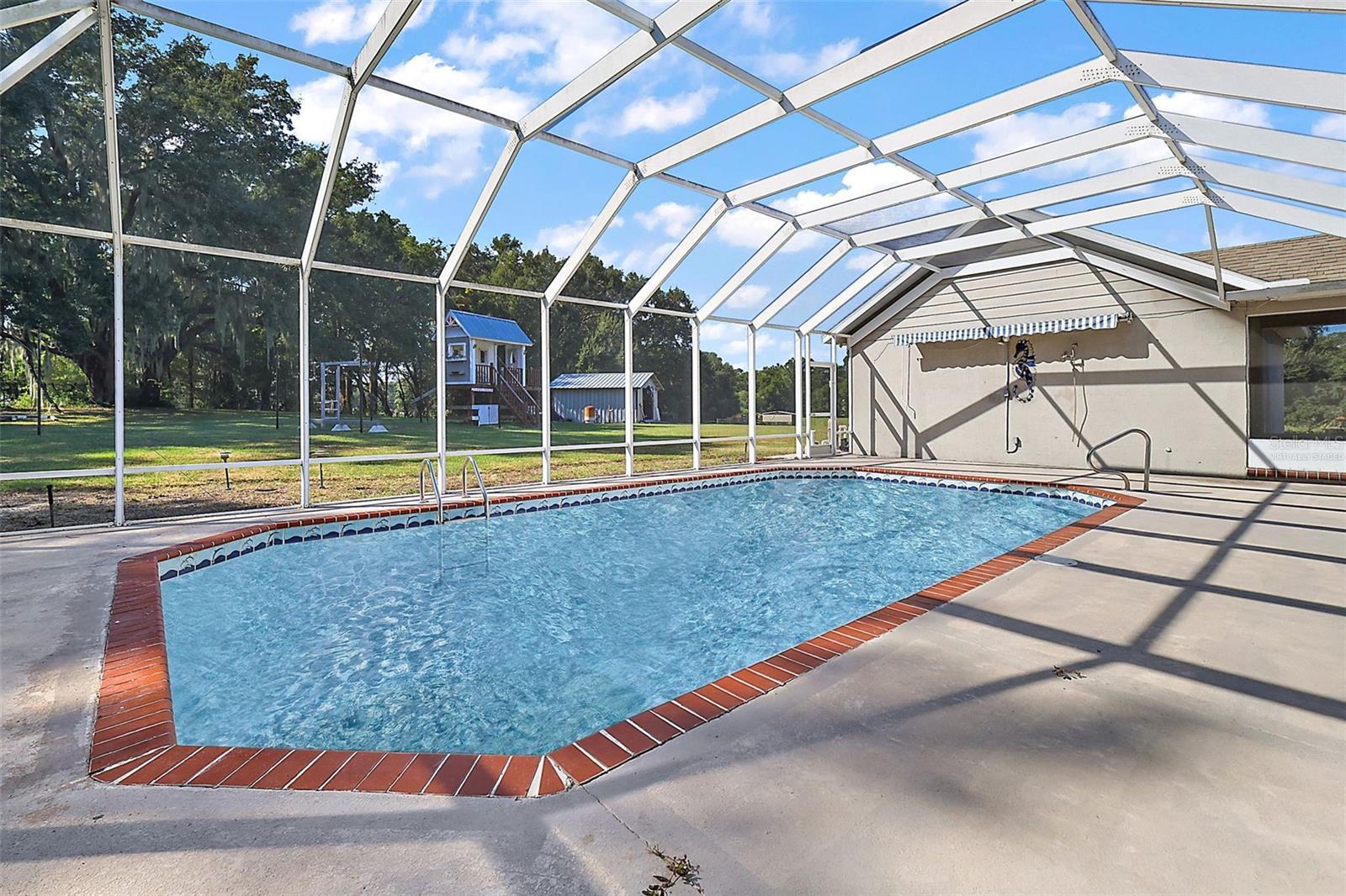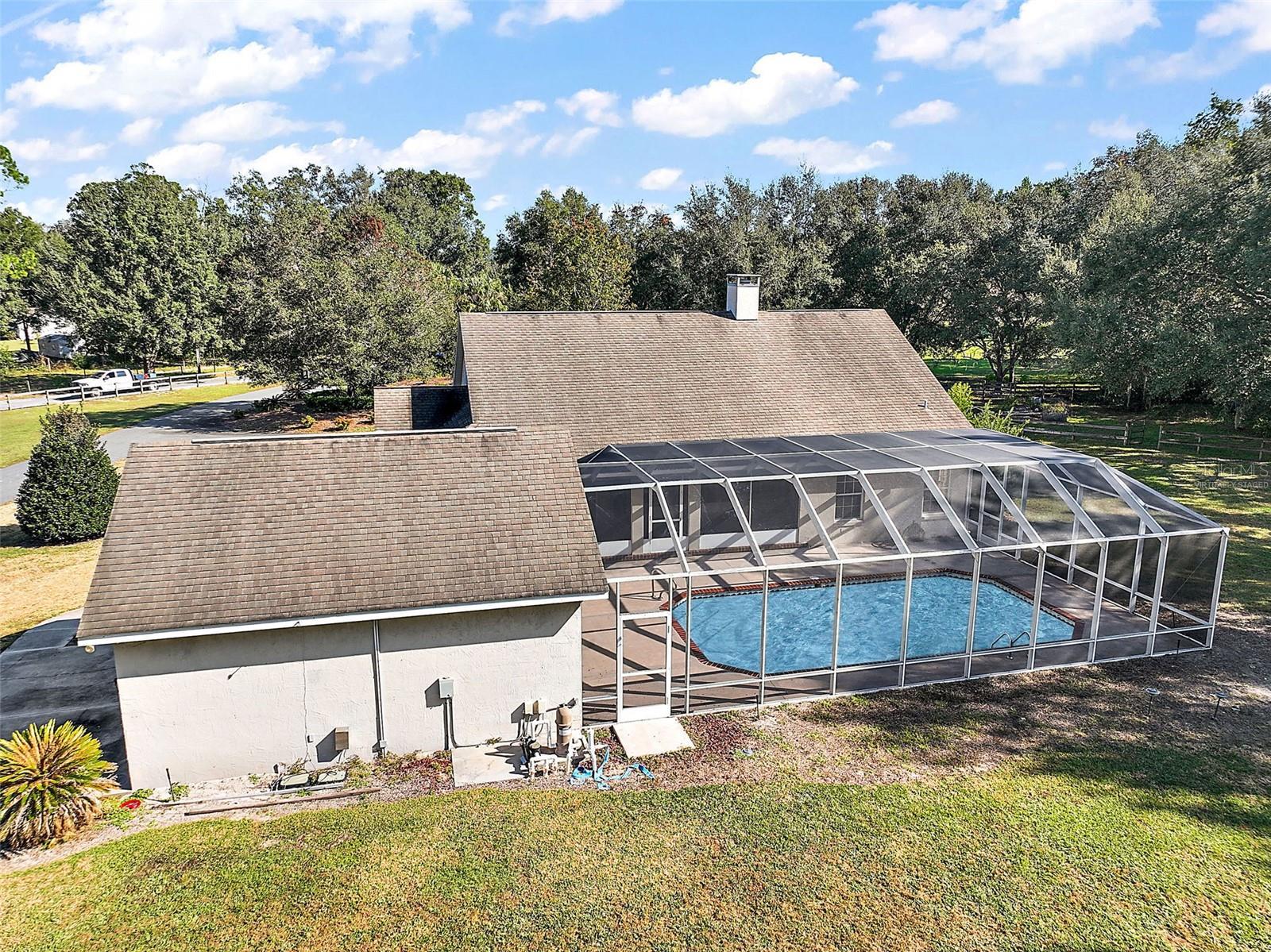 Under contract-accepting backup offers. One or more photo(s) has been virtually staged. Nestled on 9.08 acres of beautiful, natural Florida land, this charming 4-bedroom, 2.5-bathroom home offers the perfect blend of country living and modern convenience. The barn, measuring 21 by 20 feet, boasts a solid concrete floor that provides a sturdy foundation for storing tools and equipment with lots of spacious room. With plenty of space for your horses, chickens, and dogs, this property is an animal lover's dream. The home is surrounded by mature oak trees creating a serene and private retreat. A dog pin, and a chicken coop are conveniently located in the back, providing all the space you need for your pets and equipment. The screened-in, 6-foot-deep pool, offers potential for refreshing swims. Inside, you'll find a spacious living room with wood flooring, complete with a cozy wood-burning fireplace—perfect for relaxing evenings. The master bedroom features a walk-in closet and French doors that open to the pool area, creating a peaceful and private escape. The kitchen is equipped with a breakfast nook, bar, and countertops, and flows seamlessly into the dining room, where large bay windows provide beautiful natural light. Wood floors continue into the kitchen and dining areas, adding warmth and character throughout the home. Most of the bedrooms are carpeted, except for one which is tiled, and there are two full bathrooms plus a convenient half bathroom. Additional amenities include detached two car garage, a brick back porch, and a welcoming front porch. The home also boasts a dedicated laundry room and a unique layout with the garage situated across a covered, screened-in walkway from the house. The fence on the northern side of the property is not on the property line. The driveway does have to be moved. Located just minutes from Oxford and The Villages, the property provides many options for dining and shopping. Downtown Wildwood is about a twelve-minute drive south, as well as convenient access to US Hwy 301 and the Florida Turnpike, this home combines peaceful rural living with easy access to all the amenities you need. The pool has been staged as the the pool has been drained due to cleaning.