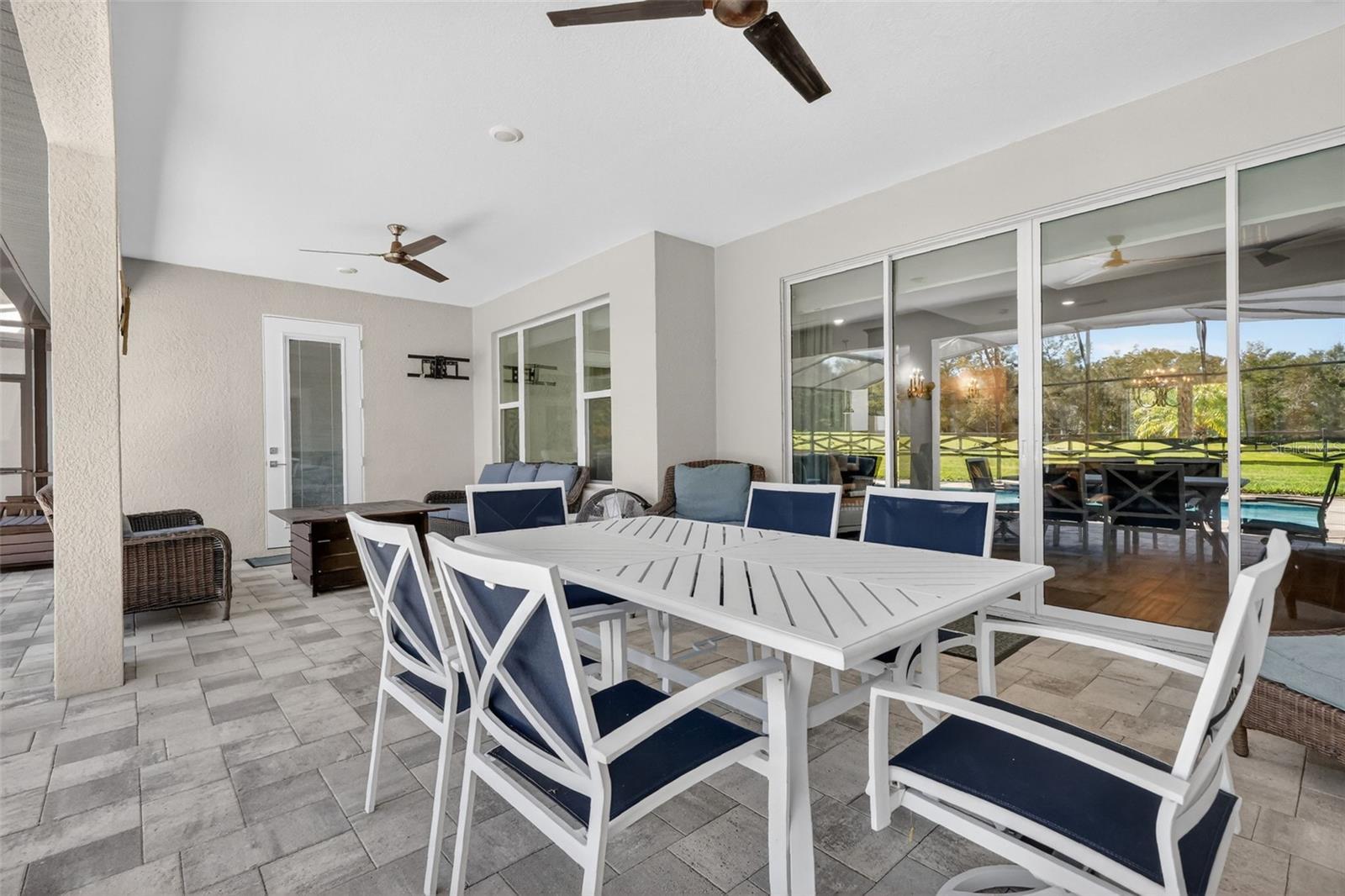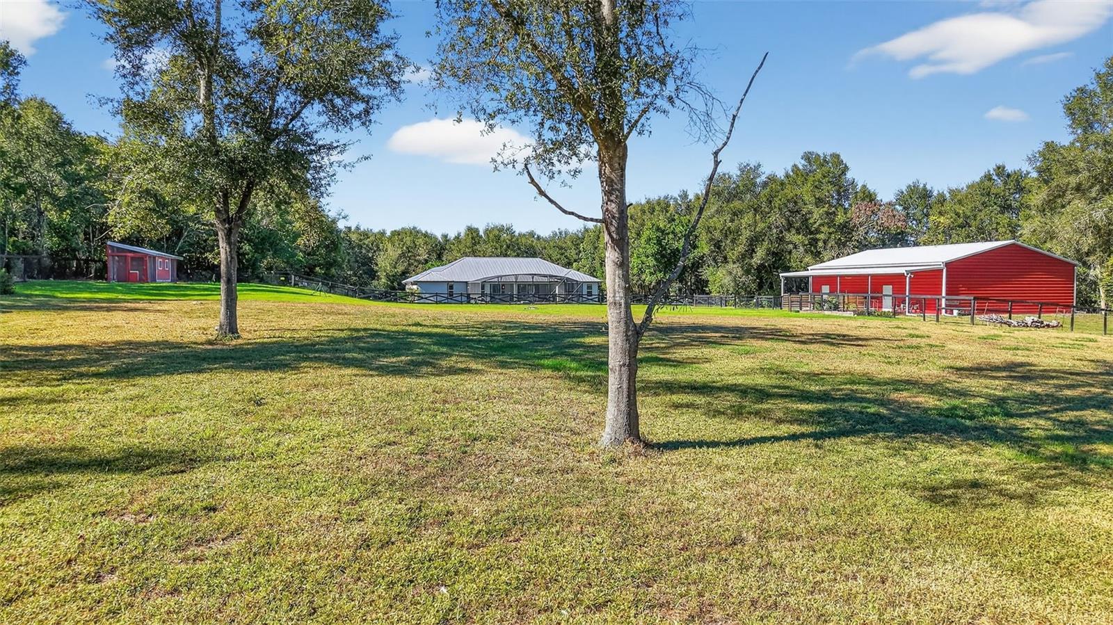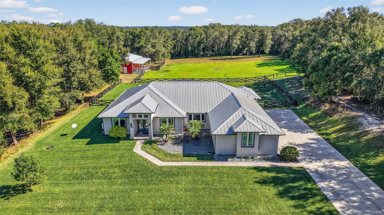 Enjoy peace, privacy and open space the minute you turn down the tree-lined driveway in this custom-built 2018 home. Situated on 5.8 acres just minutes from historic Downtown Mount Dora, this modern house has been thoughtfully designed for indoor-outdoor living with an open-concept living and dining room featuring sliders that open out to an expansive lanai. The saltwater pool is completely screened and overlooks the serene pasture, creating the perfect space for entertaining or quiet relaxation. Inside, the kitchen is a beautiful gathering spot with a sprawling cooktop island, quartz countertops, farmhouse sink, built-in appliances and custom cabinetry. The large, oversized windows in every space allow you to soak in the natural beauty and privacy this property affords. Retreat to the primary bedroom with pool views, an electric fireplace and luxurious en-suite bath complete with a walk-in shower, separate vanities and ample walk-in closets. Enjoy easy access to the laundry room directly from the primary suite. The split floor plan provides the two guest bedrooms with privacy, each with their own bathroom. And the dedicated office space is both beautiful and practical with double-door entry and another oversized window. When you step outside, you have a fully fenced backyard with premium ProVista St. Augustine sod, fruit trees and quick access to a newly built 40x50 metal building and attached lean-to. Inside the detached metal building, you'll find dedicated storage space for recreational toys, equipment, and livestock supplies. Walk through a set of double doors and you're welcomed by an additional 1,360 air-conditioned square feet of entertaining space. With a 4K projector and 150-inch screen, you can enjoy sports, tv and movies from the luxurious comfort of the custom-built stadium seating recliners. An additional three 65-inch TVs, built-in bar, pool table, darts, putting green and video games means there's no shortage of ways for you and your guests to enjoy the ultimate entertainment haven. When you want a break from all the excitement inside, just step out to the covered porch overlooking an irrigated garden and fenced pasture complete with top-board and no-climb wire — ready for your livestock to call home. Other deliberate additions to the property include a whole-home generator, electric car charging and RV outlet, asphalt driveways and oversized chicken coop. While the property is tucked away in a quiet setting on land with no HOA or deed restrictions, it offers both privacy and convenience. Just a mile from downtown Mount Dora and its historic shops and restaurants, and nearby access to Highway 441 and Interstate 429 connects you to Orlando’s business hubs, premier shopping, airport, world-class attractions, and Florida’s beautiful East Coast beaches.