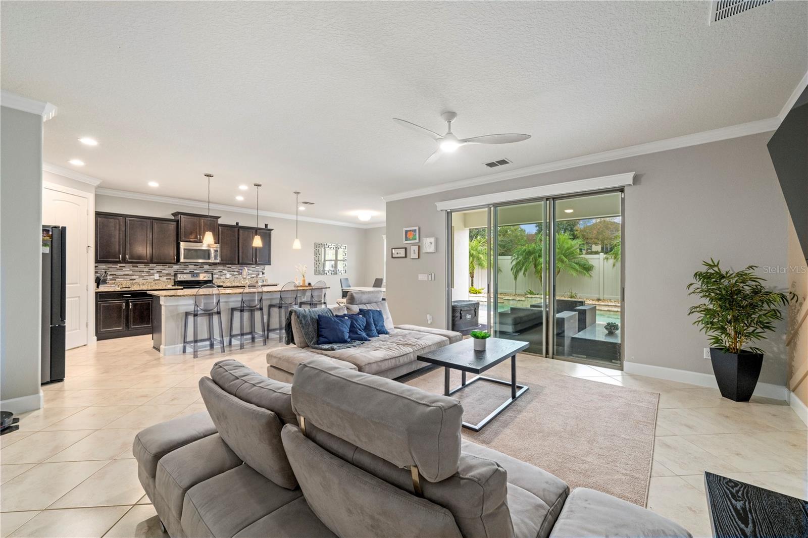 POOL HOME | JUST LISTED in Sullivan Ranch! This beautifully maintained 4-bedroom, 3.5-bath home with a bonus room upstairs and a private office downstairs is located in one of Mount Dora’s most desirable gated communities, just minutes from historic downtown Mount Dora, boutique shopping, dining, and year-round festivals. The open-concept layout is ideal for both everyday living and entertaining, featuring a spacious kitchen with a large granite island, eat-in bar, breakfast nook, stainless steel appliances, and ample cabinetry. Light-filled living and dining areas are enhanced by electronic blinds throughout the main living areas downstairs, offering both convenience and modern style. Enjoy your private backyard oasis with a saltwater pool, paver pool deck, palm trees, and thoughtfully designed, low-maintenance landscaping — perfect for relaxing or entertaining year-round. The outdoor living space has been professionally enhanced with decorative stone, landscape lighting, artificial turf, custom curbing, and expanded paver areas, completed between 2023–2025. Additional highlights include a first-floor half bath, laundry room with built-ins, generous storage, and a spacious primary suite featuring new engineered wood flooring in the bedroom and walk-in closet (2024), along with a soaking tub, walk-in shower, and double vanity. Recent upgrades include A/C air purification system (2022), electronic blinds downstairs, all interior lighting upgraded to LED (2022) including bathroom vanity fixtures, a new hot water heater (2023), epoxy-coated garage flooring (2022), garage walls painted to match the interior, and a new roof (2025). Residents enjoy resort-style amenities including a clubhouse, fitness center, junior Olympic pool, splash pad, playground, dog park, and scenic walking trails. Conveniently located near SR-429 with easy access to Orlando, major highways, beaches, and area attractions, this home offers the perfect blend of comfort, convenience, and Mount Dora lifestyle.