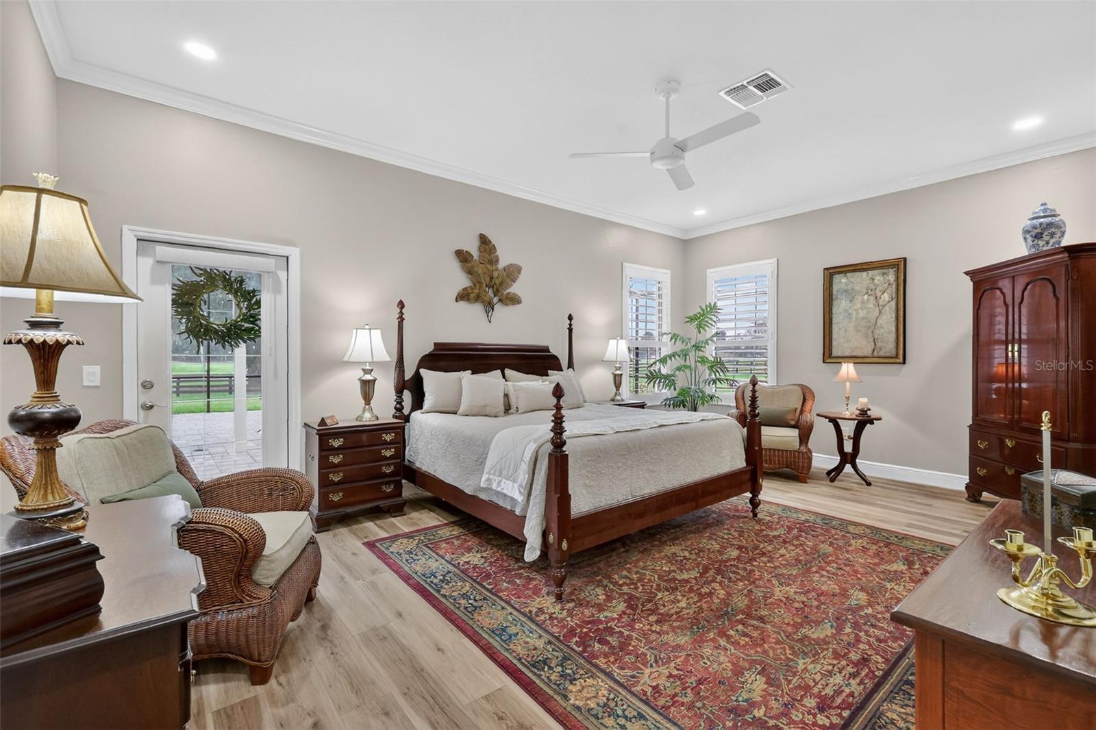 EXPERIENCE LUXURY LIVING in this EXQUISITE, GOLF & WATER VIEW, PREMIER 3/2 Rancho Mirage POOL home with OVERSIZED 780sf 2 car+GOLF CART garage on a .60+ acre lot in the PRIVATE, GATED, ENCLAVE village of Hickory Head Hammock! NO BOND or BOND MAINTENANCE! Originally designed as an EXCLUSIVE NEIGHBORHOOD for the developer’s family and friends, Hickory Head Hammock offers PRESTIGE, PRIVACY, and SECURITY behind its own iron gate, with MAJESTIC OAK-LINED streets creating a CHARMING, ONE-OF-A-KIND setting! The STRIKING exterior boasts ENHANCED TIERED landscaping & a CIRCULAR driveway. The ELEGANT LEADED-GLASS door leads into a generous foyer with a convenient ENTRY CLOSET. Throughout the home refined architectural details abound, Taj Mahal Leathered Quartzite countertops, PLANTATION SHUTTERS, 10' ceilings adorned with CROWN MOLDING, exquisite hickory luxury vinyl plank flooring, & a central vacuum system. The gourmet kitchen showcases staggered ALABASTER cabinetry; GLASS accents; PULL-OUTS; SOFT-CLOSE drawers and doors; TILE backsplash; above & under cabinet lighting; GE Café STAINLESS appliances with INDUCTION COOKING; AIR-FRYER oven & microwave; countertop that extends to form an eat in area; central island; and adjacent dinette. An OPEN-CONCEPT living and dining area creates an impressive central living space. The formal dining room is enhanced by a custom buffet with dry bar and wine storage. In the rear of the home, a Florida room features tinted windows with MOTORIZED BLINDS. Step through sliding glass doors, from either the Florida or living rooms, into the TRANQUIL OUTDOOR SANCTUARY of the pool, lanai, and birdcage where an elevated WATERFALL BOWL creates a serene, spa-like ambiance and MOTORIZED LANAI SHADES provide privacy and year-round enjoyment. This FABULOUS retreat invites you to swim, unwind on the expansive sun deck, or savor morning coffee and evening cocktails against a breathtaking backdrop of GOLF & WATER VIEWS! Back inside, retreat to your LUXURIOUS primary suite boasting 2 CUSTOM WALK-IN closets and a FRENCH door to the lanai with wand-controlled shade. Its ensuite bathroom features HEATED TILE floors; ALABASTER CABINETRY; Quartzite countertops; DOUBLE sinks; & TILE WALK-IN ROMAN-STYLE shower. A SPLIT FLOOR PLAN places 2 additional bedrooms and a second bath behind a POCKET DOOR creating a PRIVATE guest wing or home office. Bedroom 2 offers DUAL built-in closets. The second bath features ALABASTER cabinetry, Quartzite tops, TILE WALK-IN shower, SOLAR TUBE, and hallway LINEN closet. The third bedroom offers DOUBLE windows, queen Murphy bed and cabinetry, and DUAL built-in closets. The SPACIOUS laundry room boasts a WALK-IN PANTRY, ALABASTER cabinetry, Quartzite tops, SOLAR TUBE, & utility sink. Completing the package is an OVERSIZED 2 car+GOLF CART garage with EPOXIED floors, MOTORIZED garage screen, shelving, & workbench. DON’T MISS YOUR OPPORTUNITY to make this STUNNING GOLF and WATER VIEW HOME YOUR OWN! Hickory Head Hammock is IDEALLY SITUATED only 3/4 of a mile to Spanish Springs Square and 3.9 miles to Lake Sumter Landing. More conveniences nearby include Genesis Fitness Center, UF Hospital, & an abundance of shopping, restaurants & more! The neighborhood also features its own private pickle ball court and golf cart gate with a short-cut easy access to Morse Blvd! This RARE OPPORTUNITY won't last long! PLEASE WATCH OUR VIDEO of this EXCEPTIONAL PROPERTY! CALL TODAY to schedule your private showing or virtual tour!